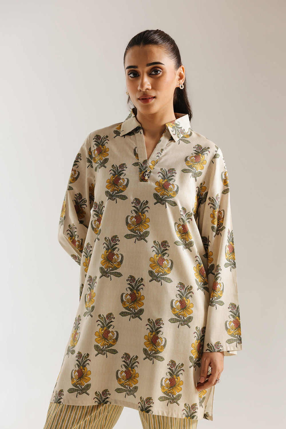 This elegant printed suit combines traditional with contemporary styling. The straight-cut kameez features a sophisticated all-over Mughal-inspired floral motif in warm tones of yellow, mustard, and rust against a light neutral base. Long sleeves with gracefully flared cuffs and a refined collar with V-neck placket complete the top. Paired with coordinating striped trousers in soft beige and greenish-yellow tones, this ensemble strikes the perfect balance between classic South Asian aesthetics and modern sensibilities. Ideal for semi-formal occasions and everyday elegance.