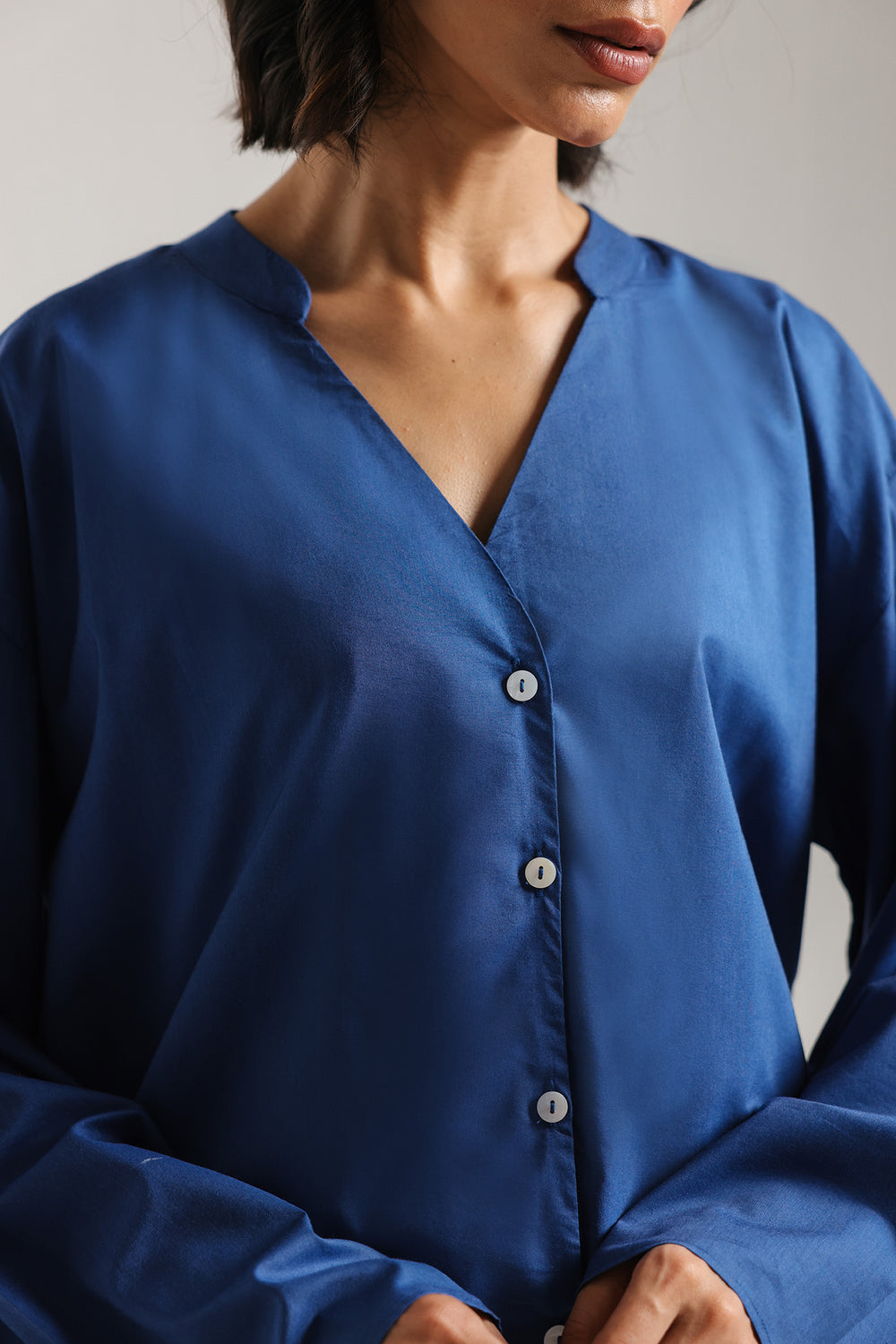 Exude effortless confidence in this solid suit, a masterclass in clean lines and bold, singular color. Drenched in a rich, vibrant cobalt blue, the ensemble is crafted from premium fabric that offers a smooth, lustrous finish and a graceful drape. The long-line tunic features a modern V-neckline and a sleek, button-down front that adds a touch of structured sophistication to the relaxed silhouette. Completed with uniquely tailored tulip-style trouser that mirror the curved hem of the shirt, this two-piece set is the ultimate expression of contemporary minimalist luxury.