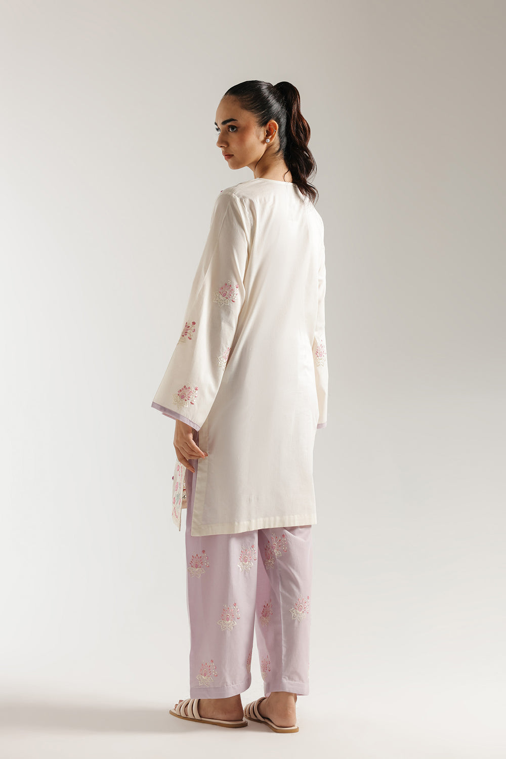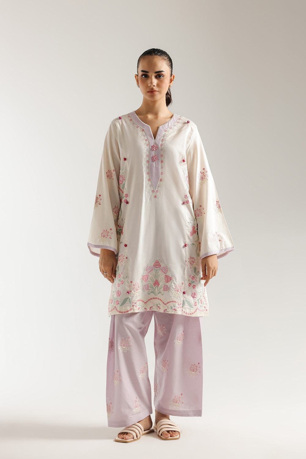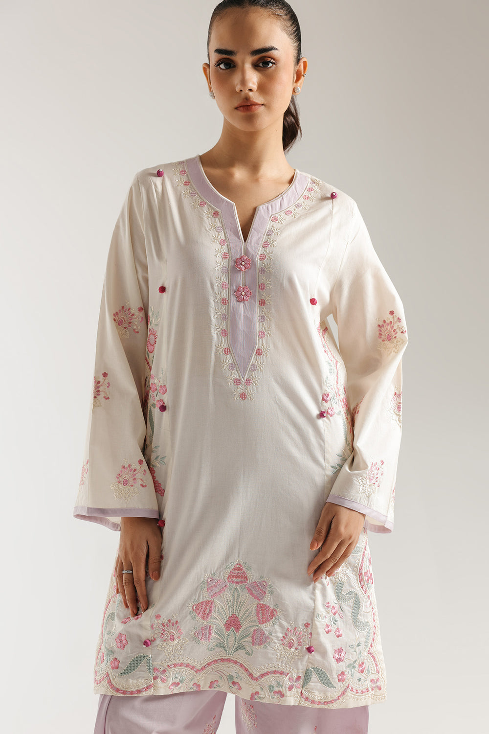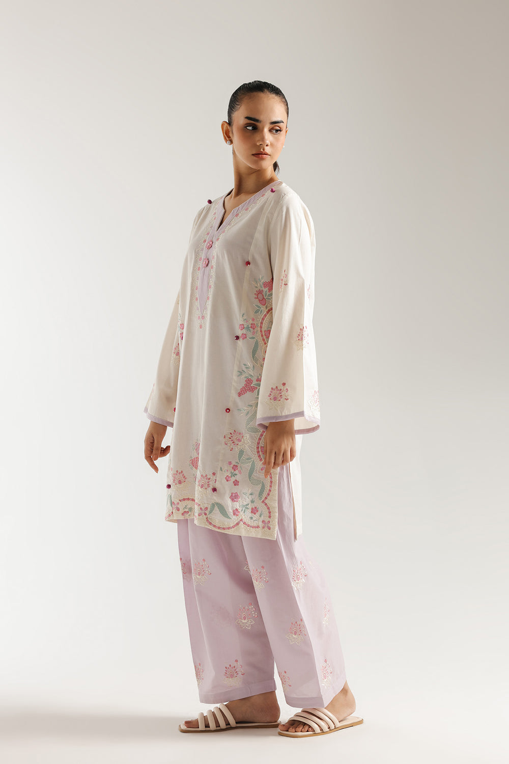 Embrace delicate charm with this enchanting ivory & lavender embroidered ensemble, a harmonious blend of subtle hues and exquisite craftsmanship. The serene ivory tunic features a beautifully detailed V-notch neckline, intricately embellished with soft pink, green, and lavender floral embroidery that cascades elegantly across the front and sleeves. A contrasting lavender trim along the neckline and cuffs adds a touch of refined elegance. Complementing the tunic is a wide leg shalwar, in a gentle lavender shade, adorned with delicate embroidered motifs at the hem, creating a cohesive and visually stunning look. Perfect for sophisticated daytime gatherings, festive celebrations, or simply when you desire to exude graceful charm and artistic flair.