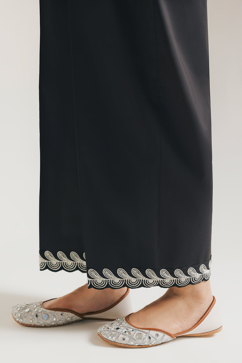 Unveil refined elegance with these crisp black embroidered trousers. These tailored straight-cut trousers are crafted from a classic, black fabric. The focal point is the delicate cutwork embroidery at the hem, featuring an intricate floral and scalloped lace pattern in a complementary tone. These versatile trousers offer a polished finish and pair beautifully with printed or embroidered shirts.