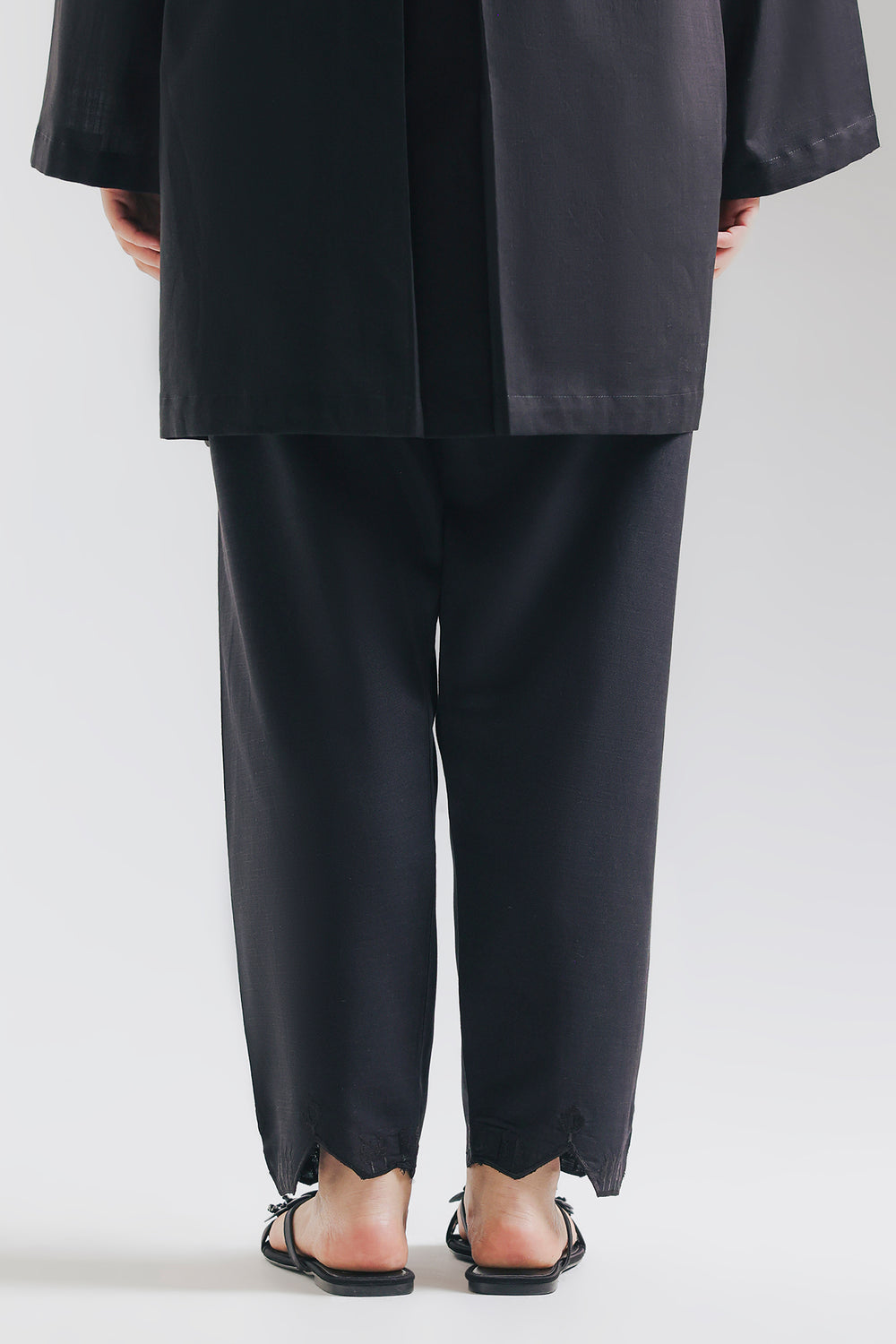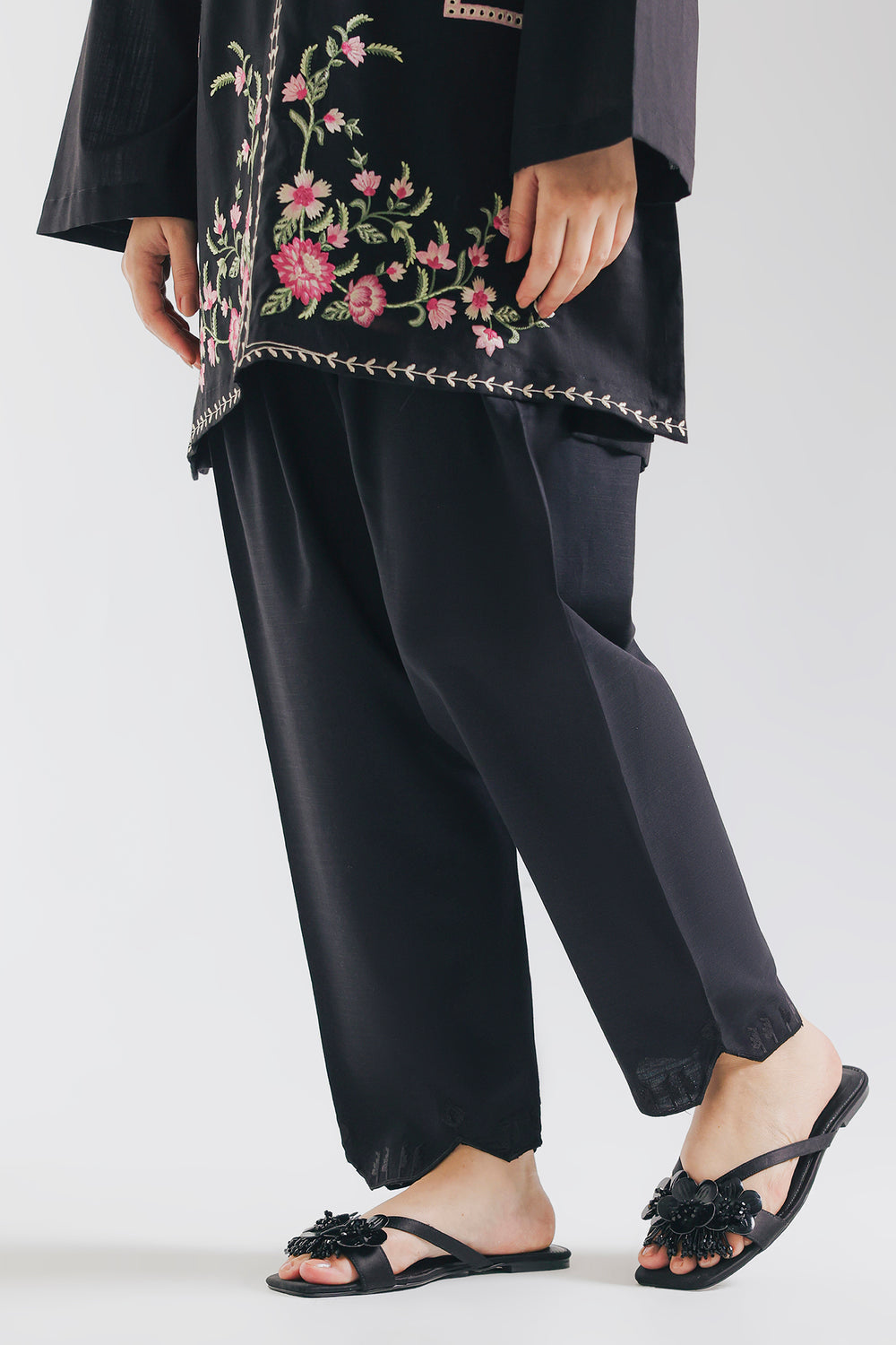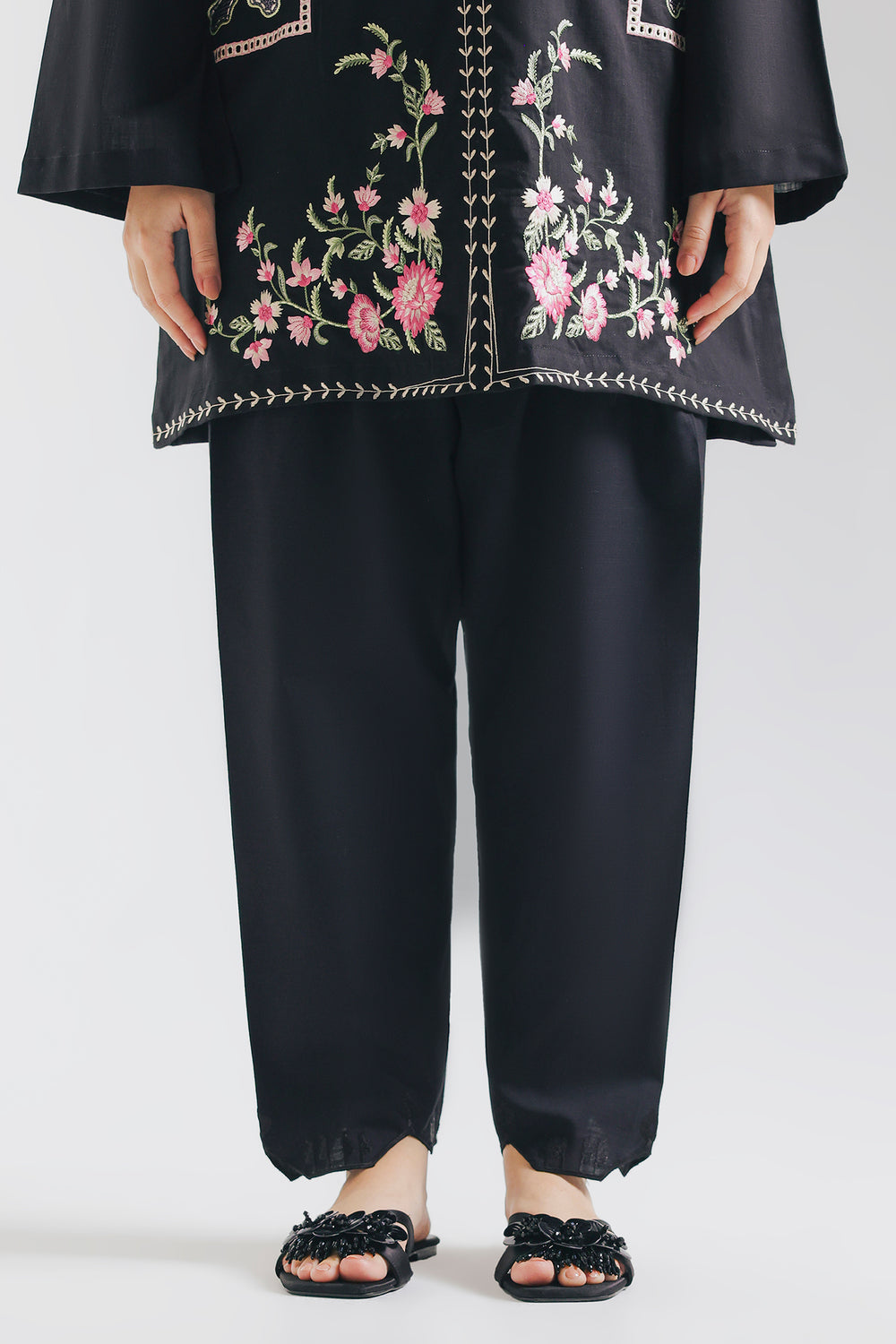 Unveil refined elegance with these crisp black embroidered trousers. These tailored straight-cut trousers are crafted from a classic, black fabric. The focal point is the delicate embroidery at the hem featuring geometric designs. These versatile trousers offer a polished finish and pair beautifully with printed or embroidered shirts.
