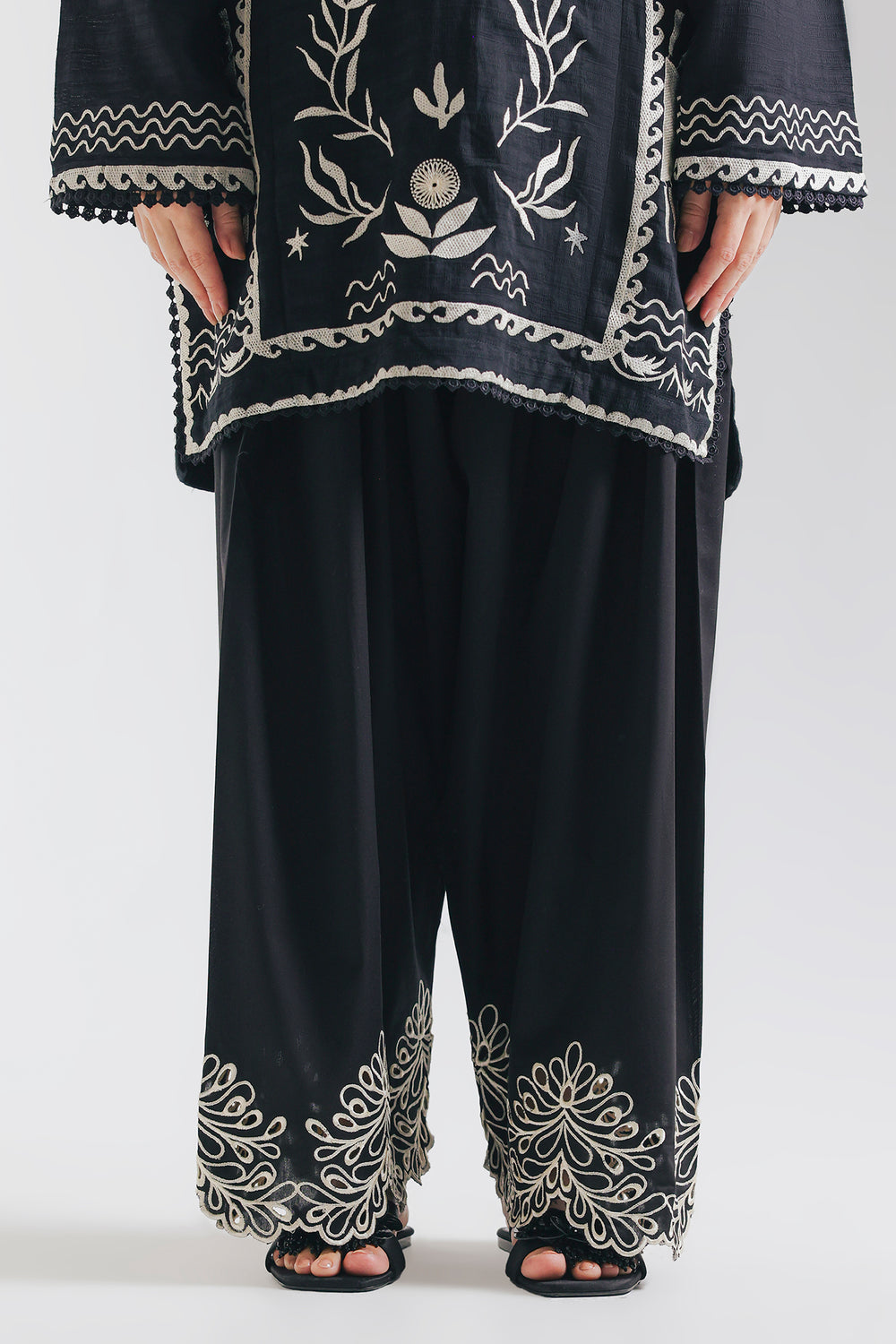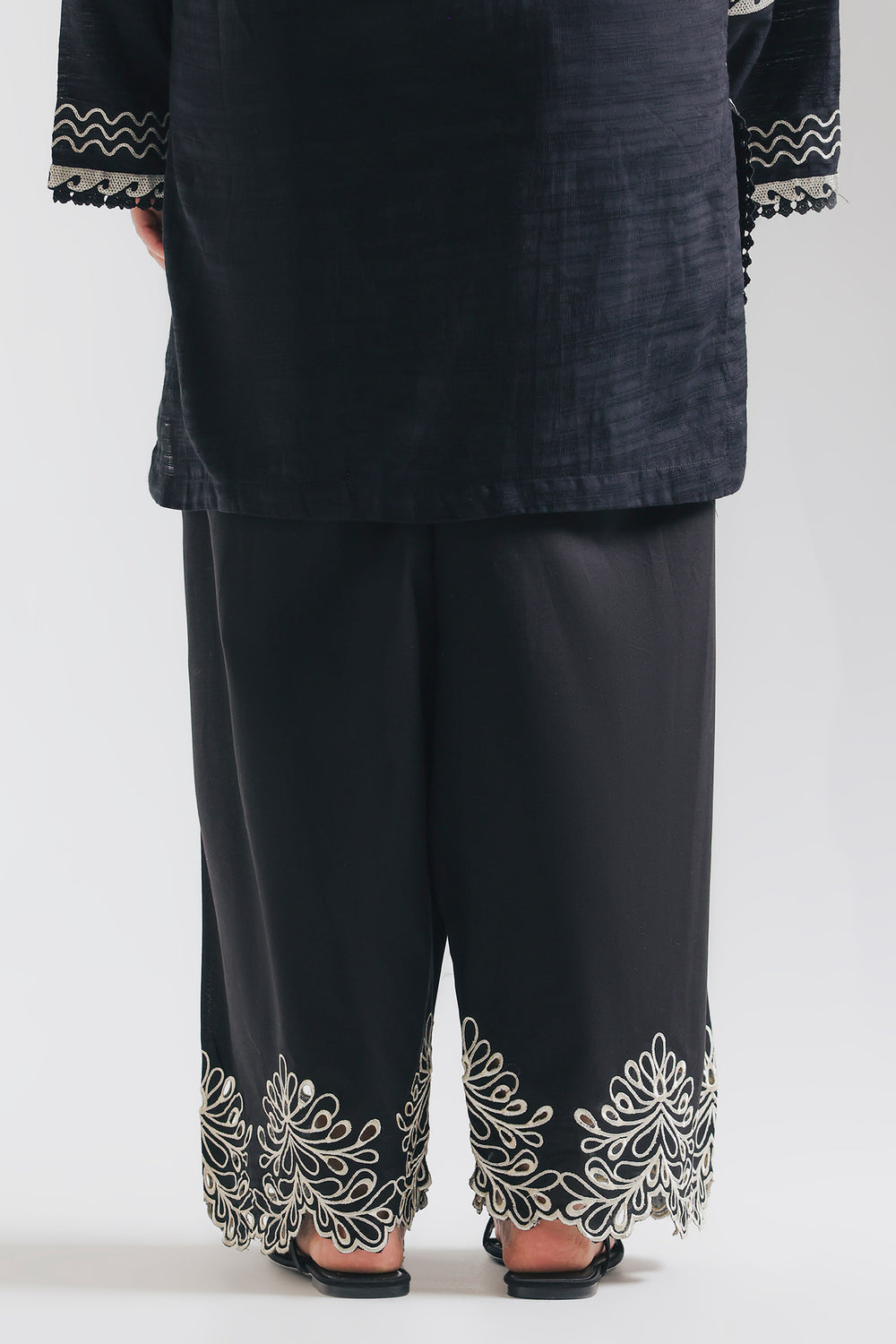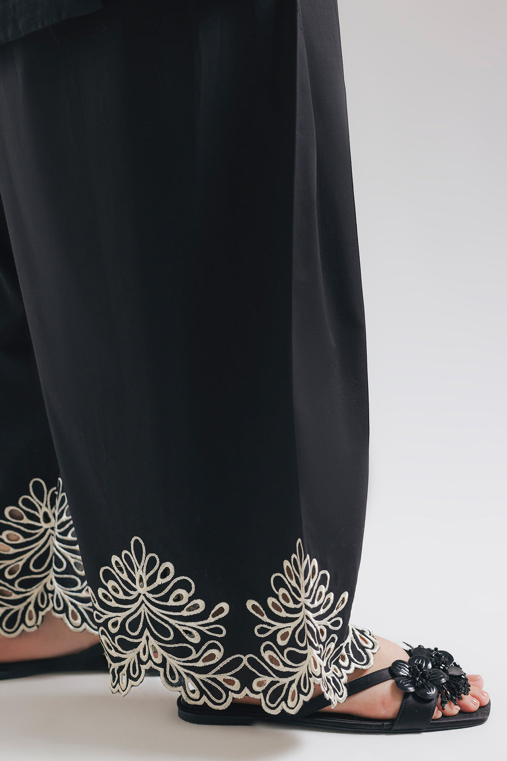 Introduce an element of subtle drama to your traditional wear with this elegant black shalwar. It features a classic, comfortable wide-leg silhouette in a rich black fabric. The true highlight is the exquisite white thread embroidery that adorns the hem, creating a striking, intricate floral and scrolling border. This versatile shalwar pair beautifully with a variety of kurtas, adding a sophisticated and artful touch to any outfit.