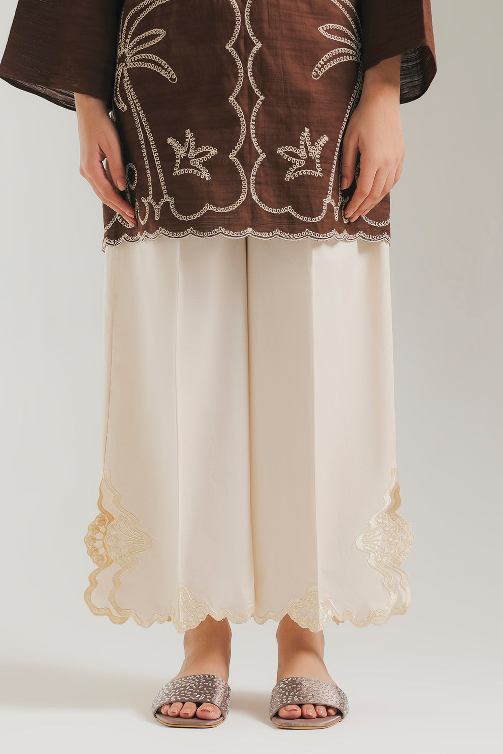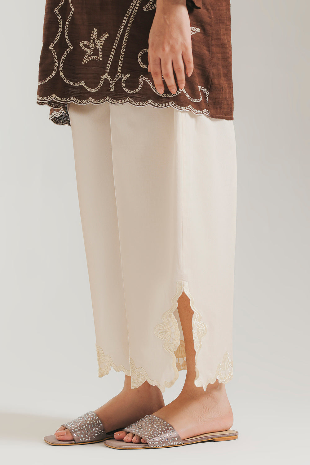 Enhance your look with the delicate elegance of this pure off white trouser. These classic culotte fit trouser is crafted from a crisp cotton fabric. The defining feature is the hem, which is finished with an exquisite scalloped cutwork border. The intricate cut-out design is subtly highlighted with tonal thread embroidery, lending a sophisticated and airy finish. This trouser is the perfect piece to balance vibrant printed or embroidered kurtas.