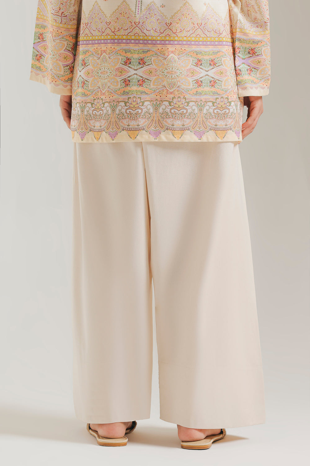 Drape yourself in effortless sophistication with this exquisite cream wide-leg shalwar. The design features an elegant wide-leg silhouette that offers both supreme comfort and dramatic movement. The relaxed fit and clean lines make it an essential and versatile piece, perfect for pairing with both long, ornate kurtas or shorter, contemporary tops.