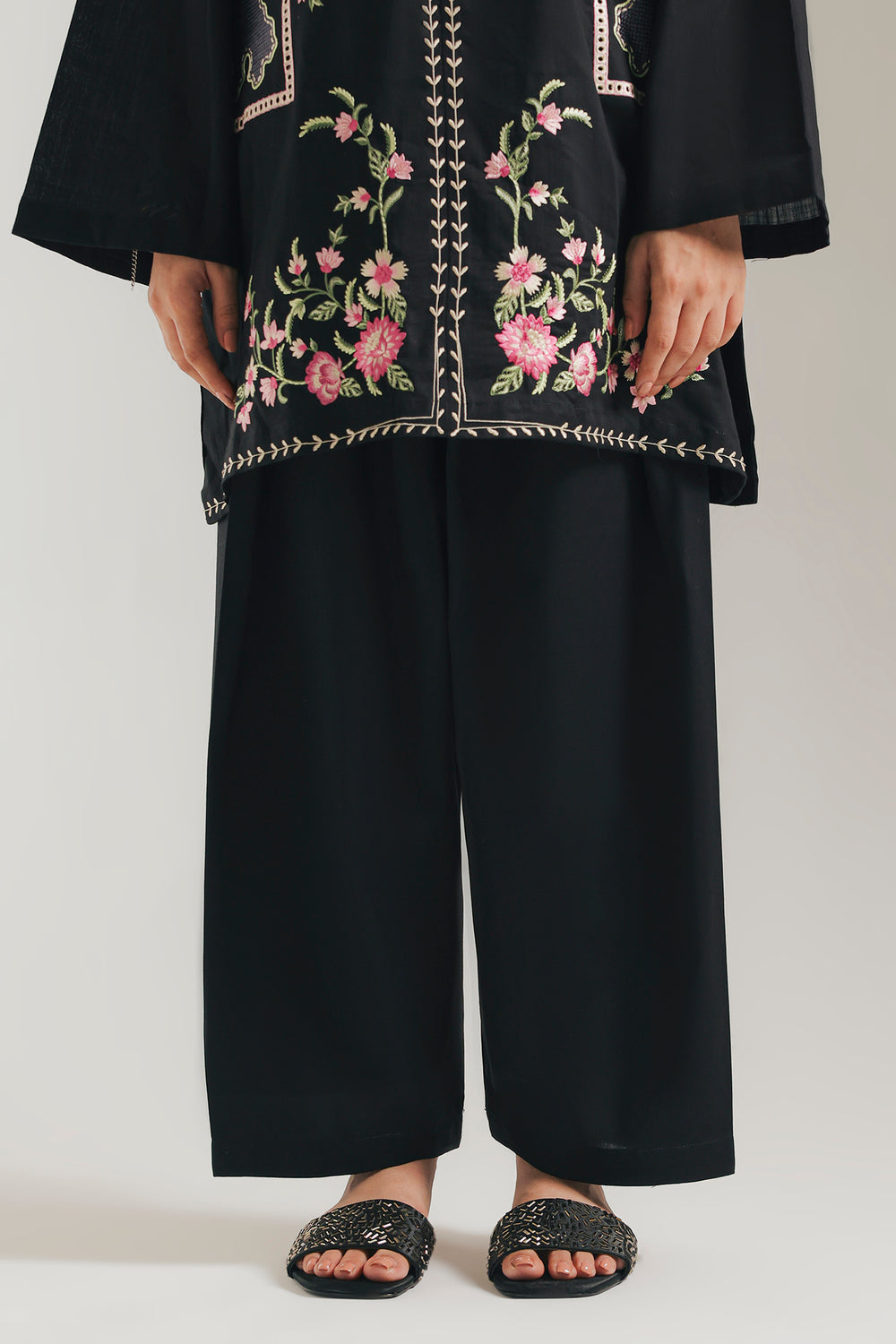 This black shalwar embodies timeless elegance through its fluid, flowing construction. The generous silhouette allows unrestricted movement while maintaining a refined aesthetic that transcends seasonal trends. Crafted for versatility, it pairs seamlessly with fitted kurtas, embroidered tunics, or structured shirts to create balanced, sophisticated ensembles. Its breathable drape and comfortable fit make it equally suitable for everyday wear.