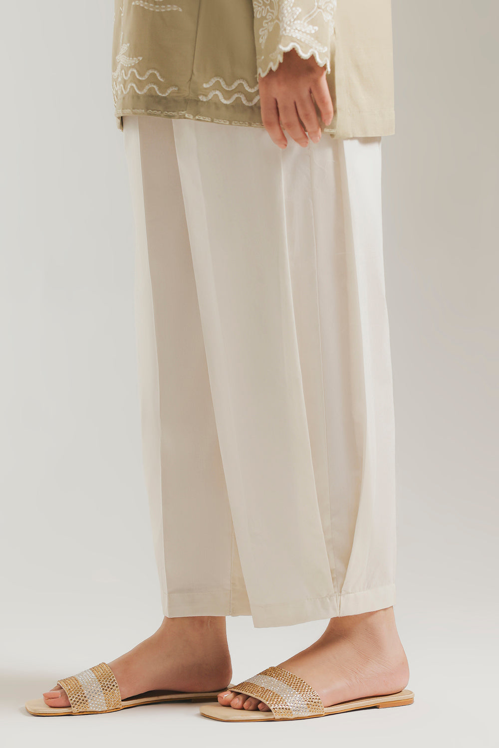 Experience effortless elegance and supreme comfort with this chic off-white shalwar. The design features a relaxed fit, and gently tapering towards the ankle to create a flattering and modern silhouette. The clean lines and minimal detailing make it a flawless foundational piece, perfect for pairing with intricate kurtas or contemporary tunics.