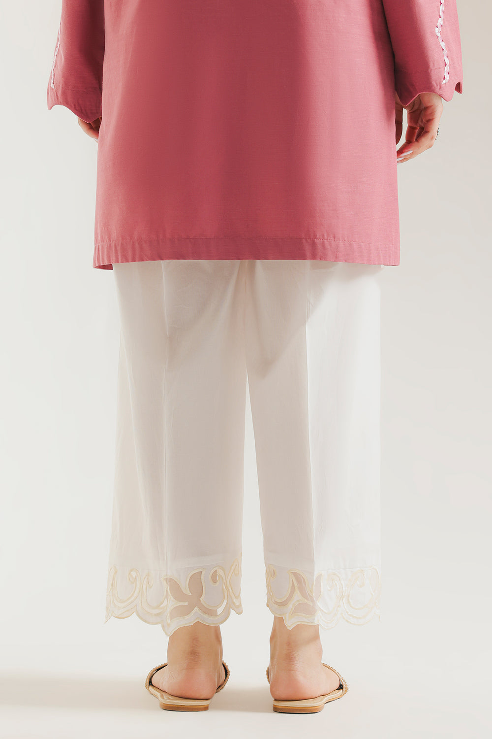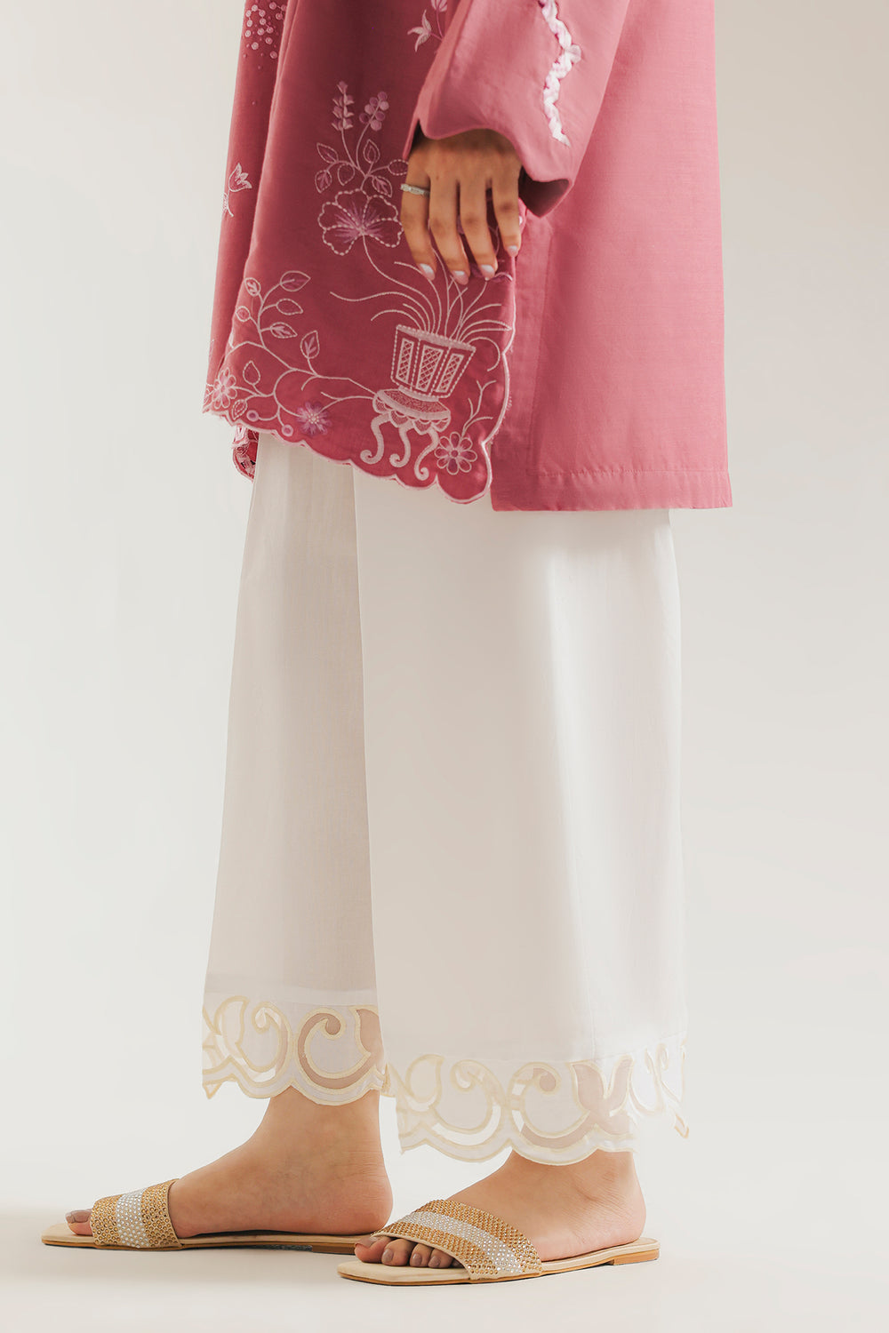 Enhance your look with the delicate elegance of this pure white trouser. This classic culotte fit trouser is crafted from a crisp white fabric. The defining feature is the hem, which is finished with an exquisite scalloped cutwork border. The intricate cut-out design is subtly highlighted with tonal thread embroidery, lending a sophisticated and airy finish. This trouser is the perfect piece to balance vibrant printed or embroidered kurtas.