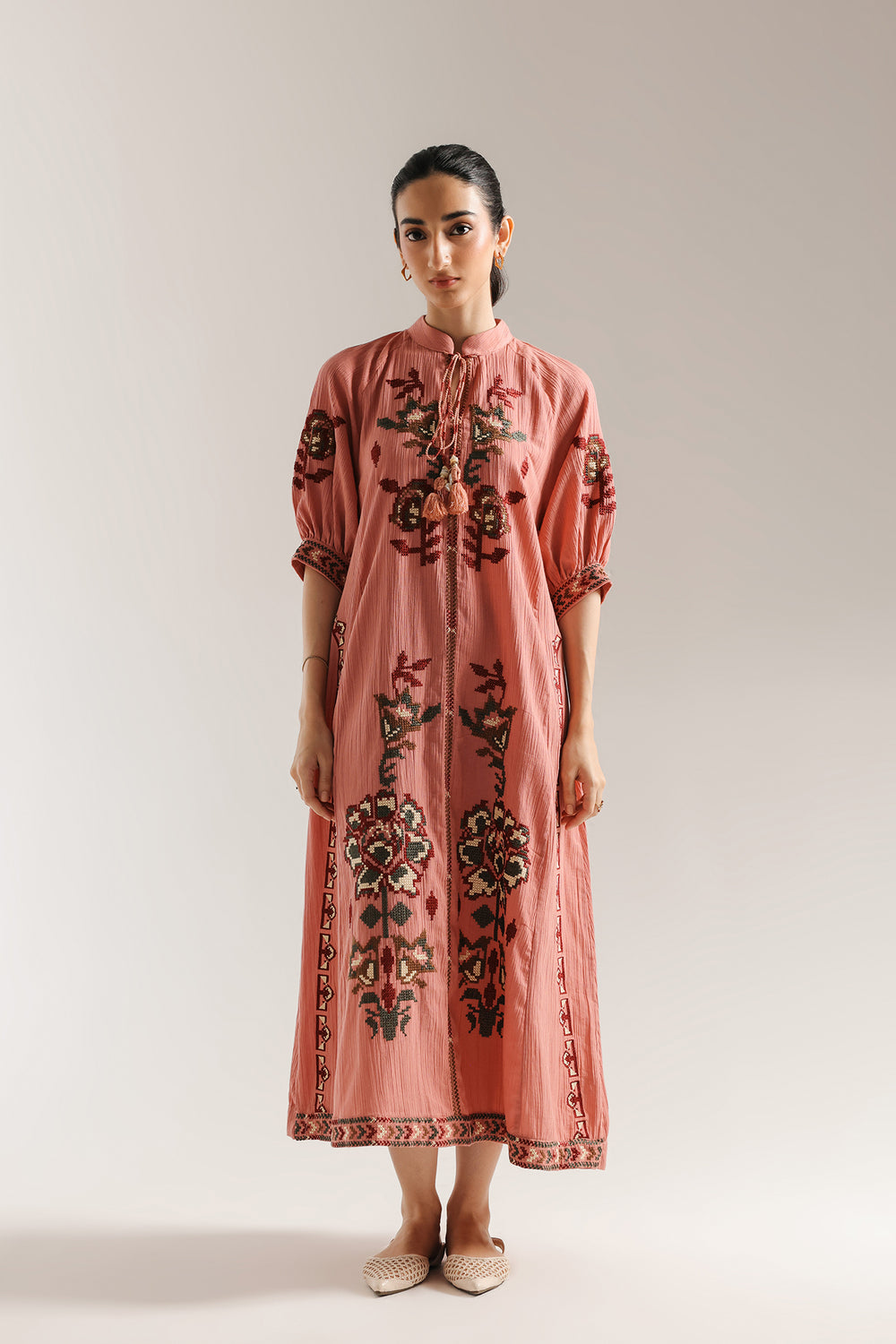 Make a statement in this stunning embroidered dress. This dress is a beautiful peach color and features intricate floral embroidery throughout. The long, flowing silhouette and the tie-up detail at the neckline add to its unique and elegant charm. With its comfortable fit and beautiful design, this dress is perfect for any occasion.