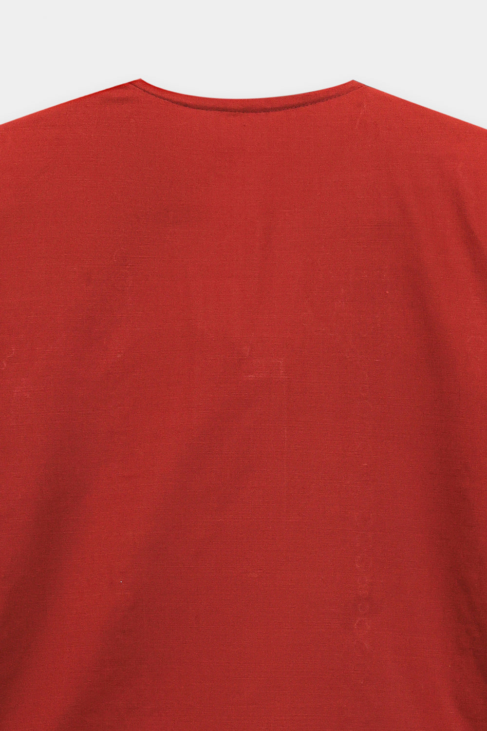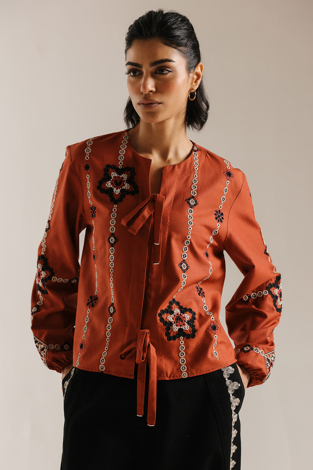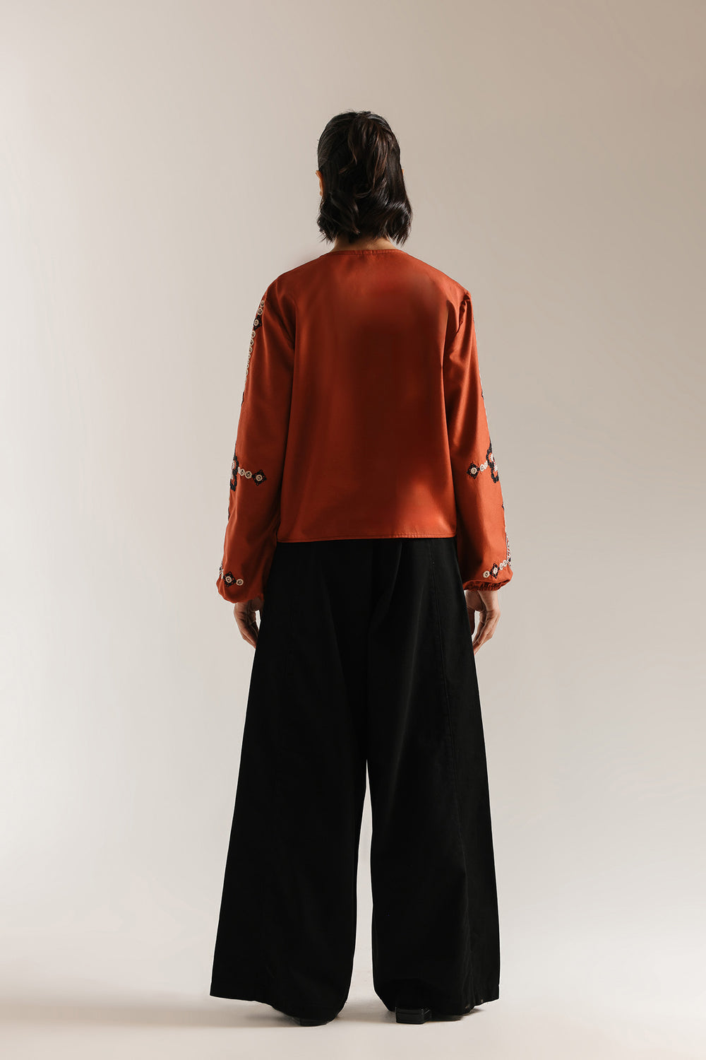 Elevate your wardrobe with this striking embroidered shirt. Rendered in a rich, deep red, this cropped blouse features voluminous balloon sleeves that taper elegantly at the wrists, paired with a relaxed V-neckline adorned with delicate tie details. The garment showcases intricate vertical striping and bold floral-geometric embroidery in contrasting dark and cream tones, creating visual depth and authentic cultural appeal that blend heritage aesthetics with modern silhouettes.