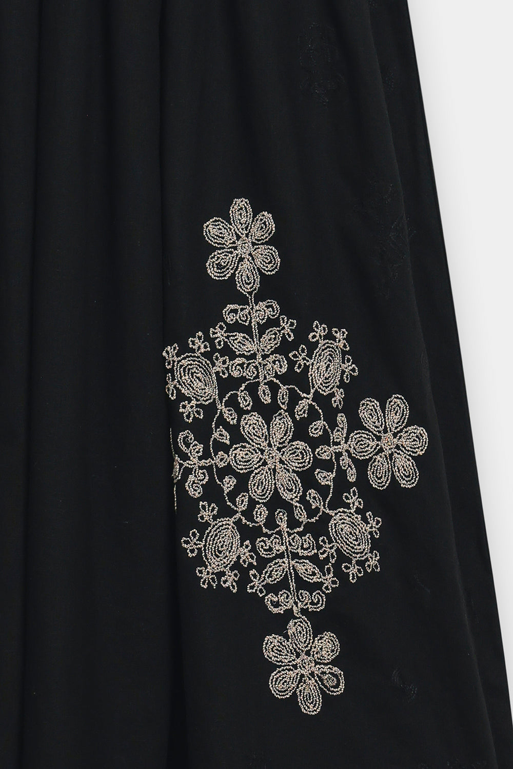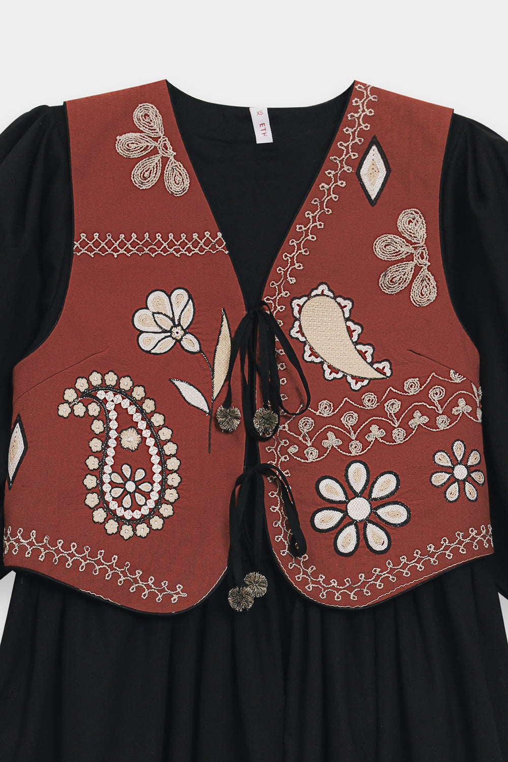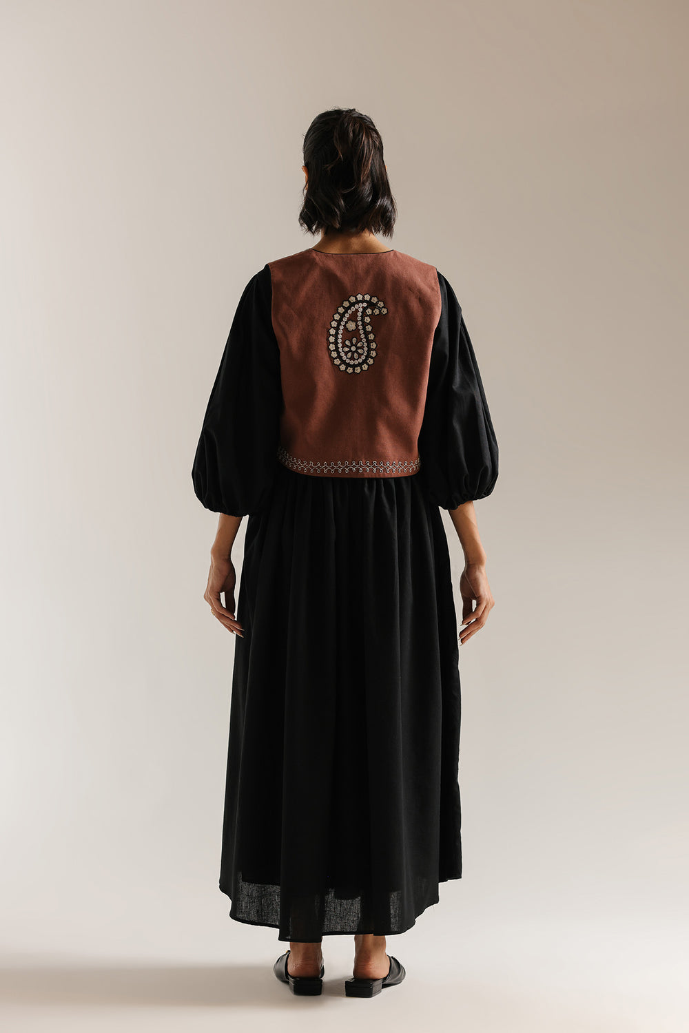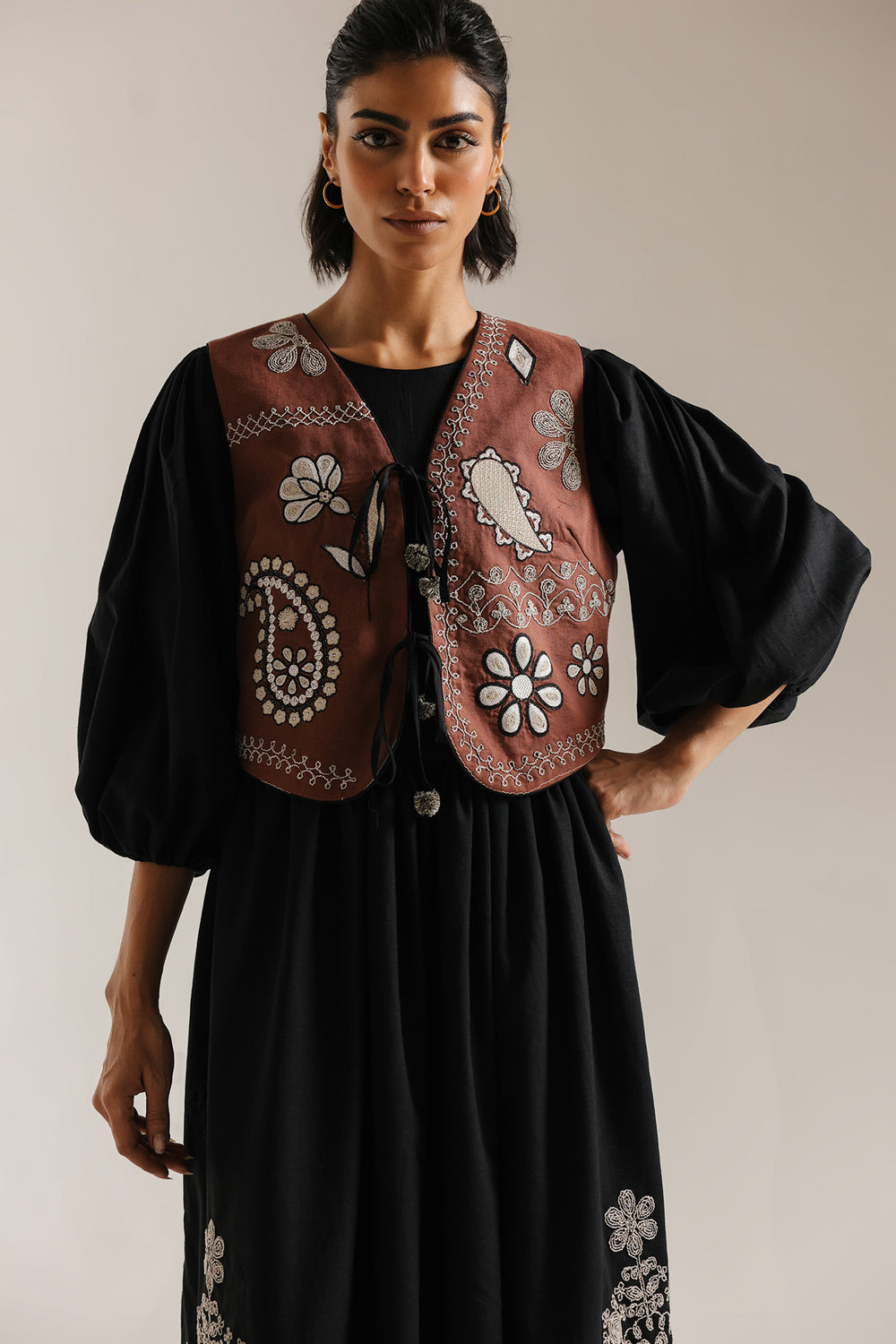 Elevate your wardrobe with this striking embroidered shirt, where traditional craftsmanship meets contemporary silhouette. The standout terracotta-brown waistcoat features intricate paisley and floral embroidery in contrasting white and black, creating visual depth and cultural authenticity. Layered over a voluminous black maxi dress, this ensemble balances structured tailoring with flowing elegance. Dramatic balloon sleeves and a generous A-line skirt deliver romantic movement, while the earthy waistcoat anchors the monochromatic base with warmth and dimension. Perfect for those seeking sophisticated folk-inspired fashion with timeless appeal.