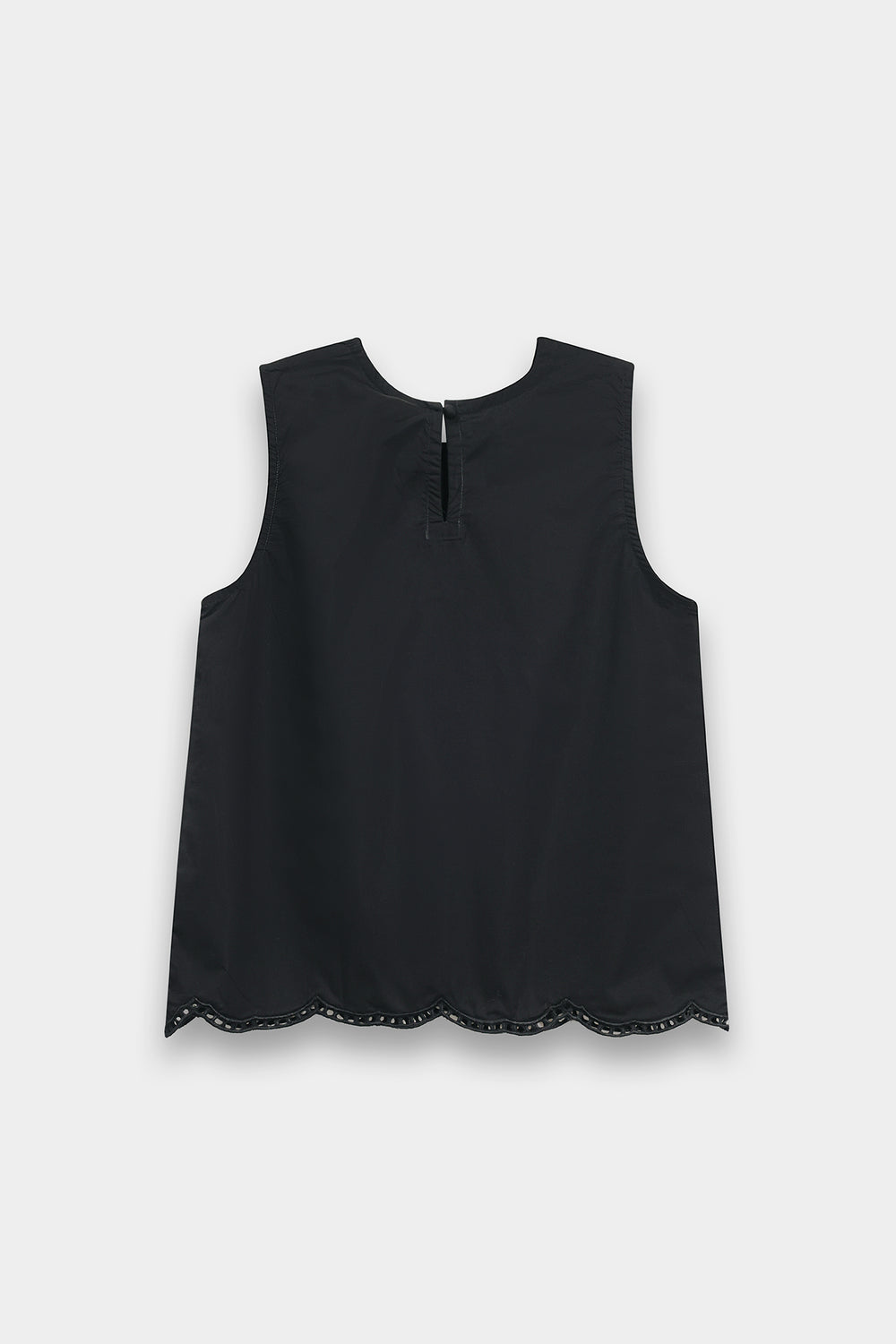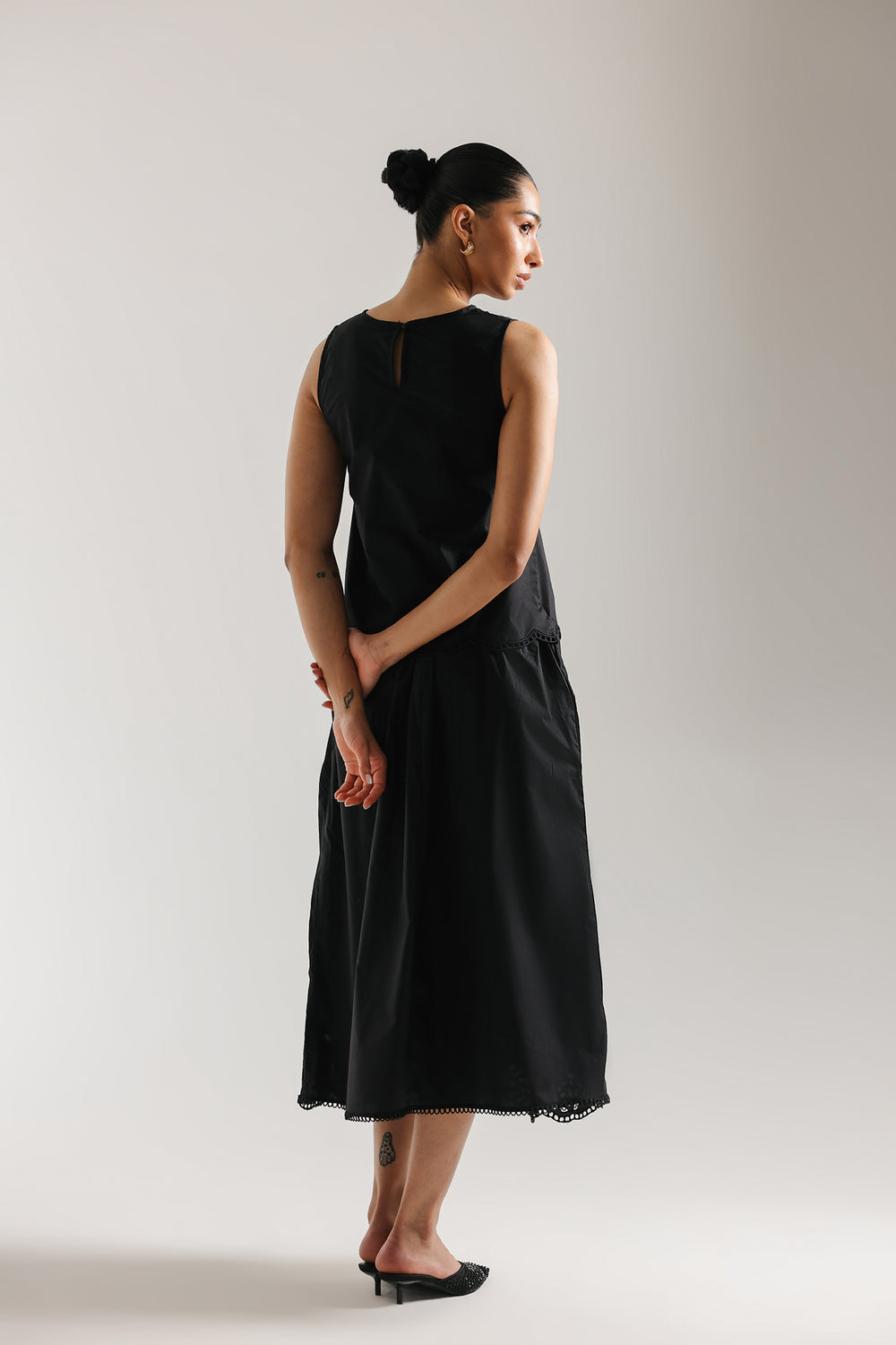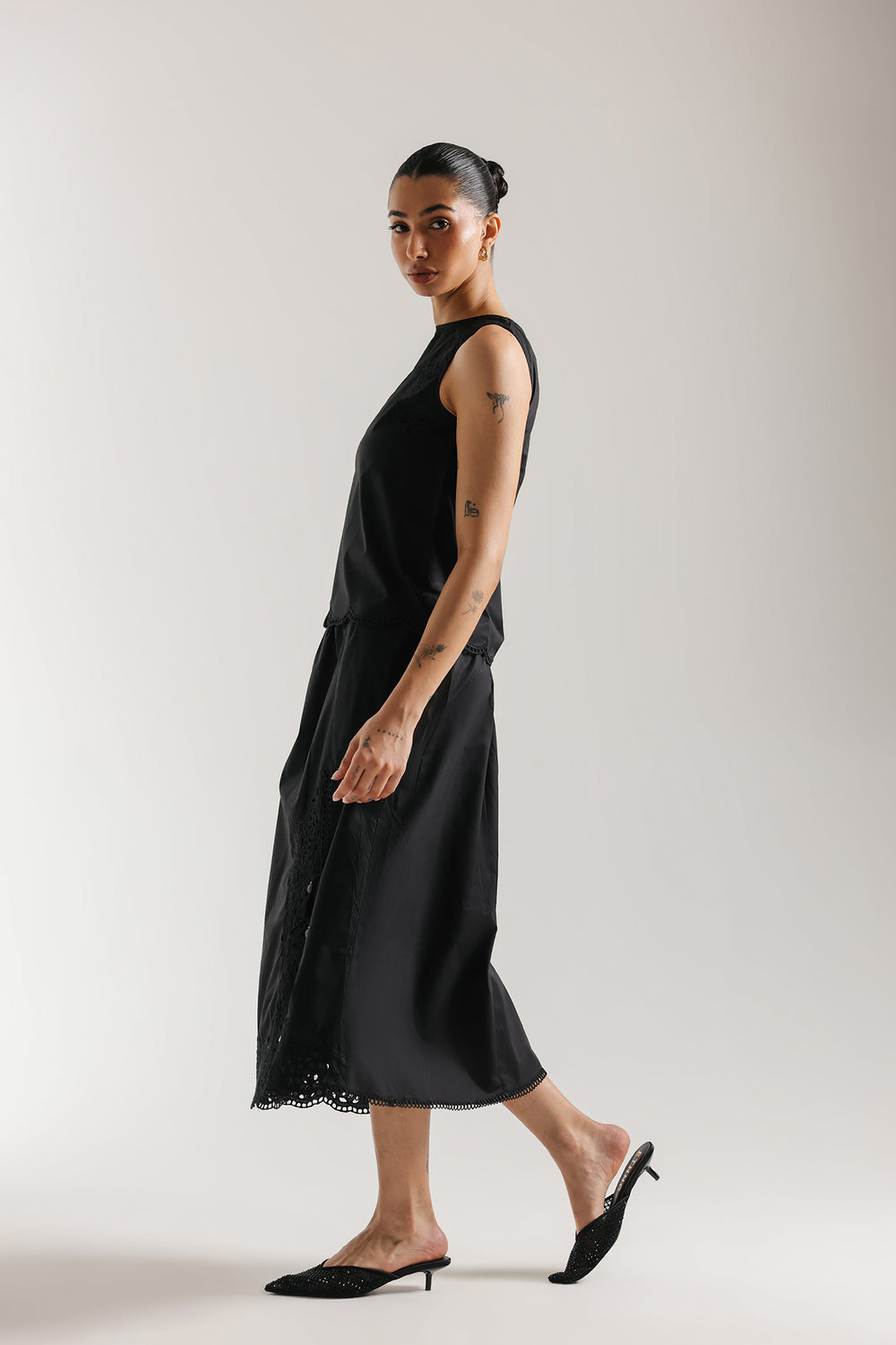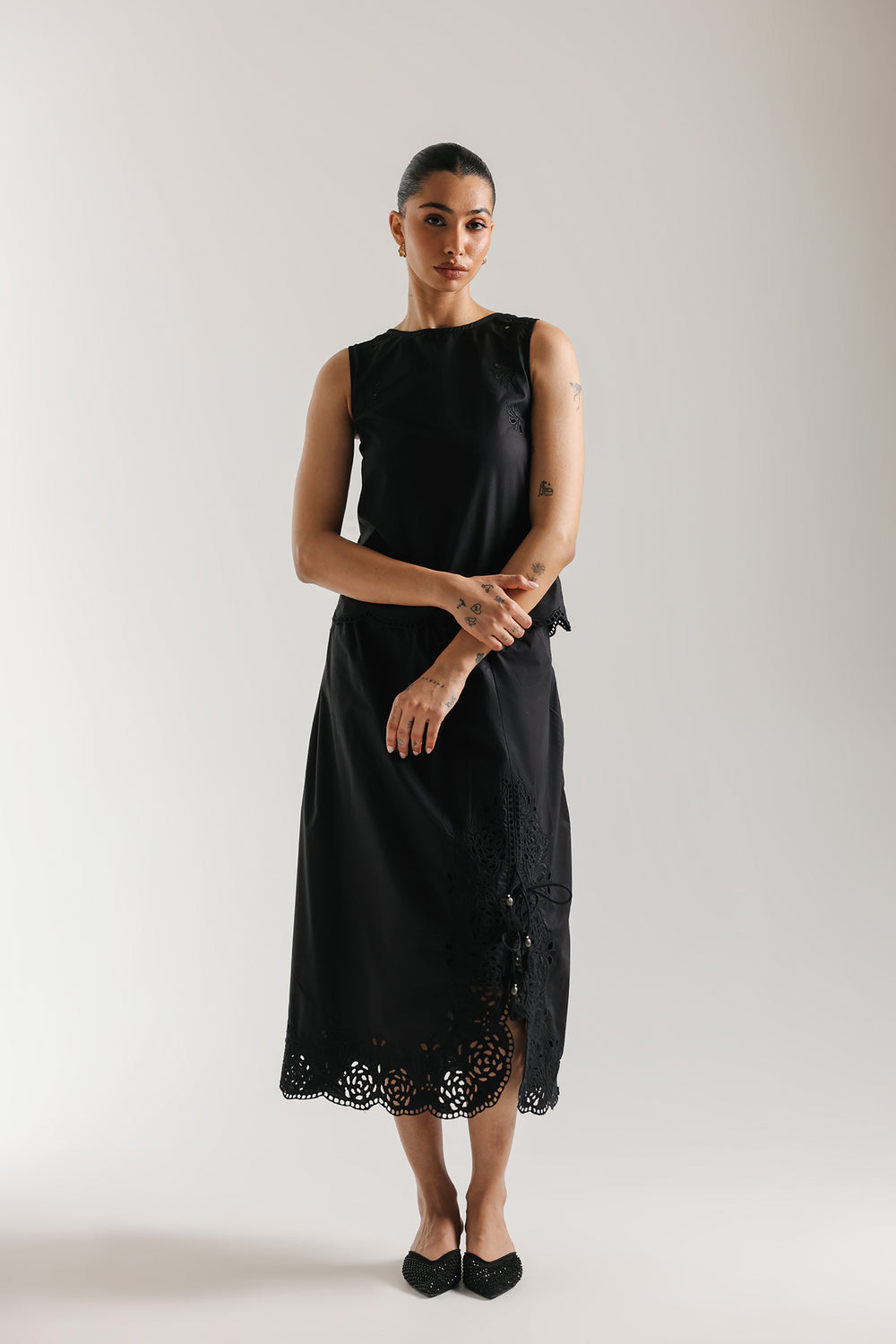 Elevate your wardrobe with this sophisticated two-piece ensemble featuring a sleeveless, high-neck shell top in premium lightweight fabric with a subtle sheen. The relaxed, straight-cut silhouette pairs seamlessly with a midi skirt adorned with an asymmetrical lace appliqué that climbs gracefully up one side. The scalloped lace detailing adds a delicate, vintage-inspired touch to this modern black design, creating an effortlessly elegant look perfect for any occasion.