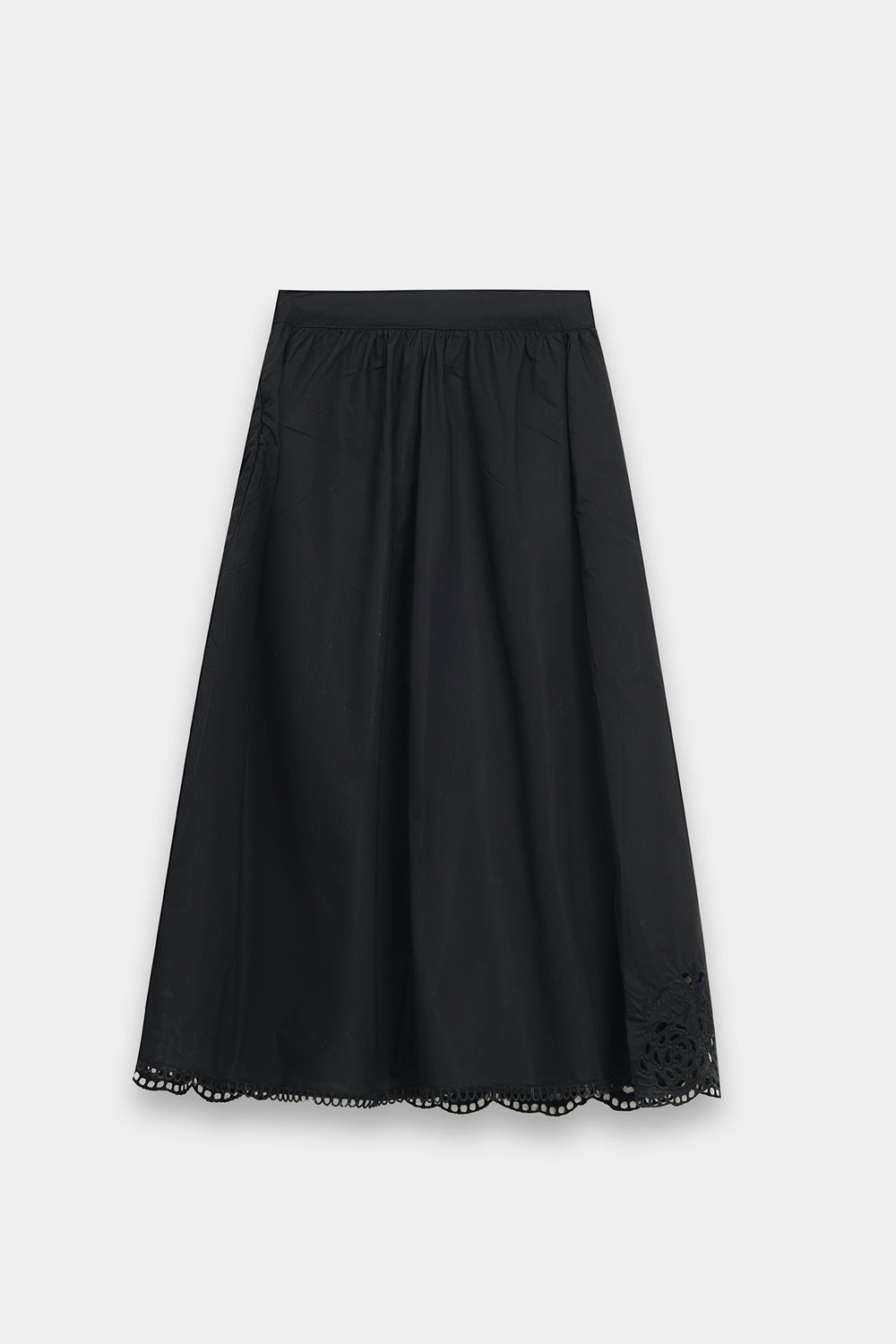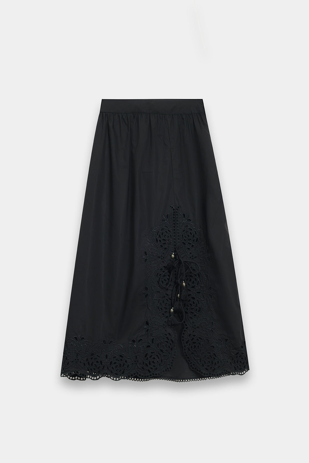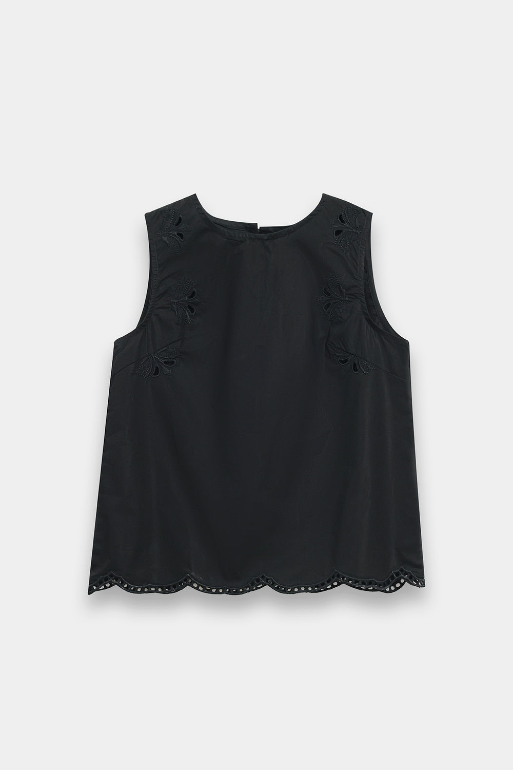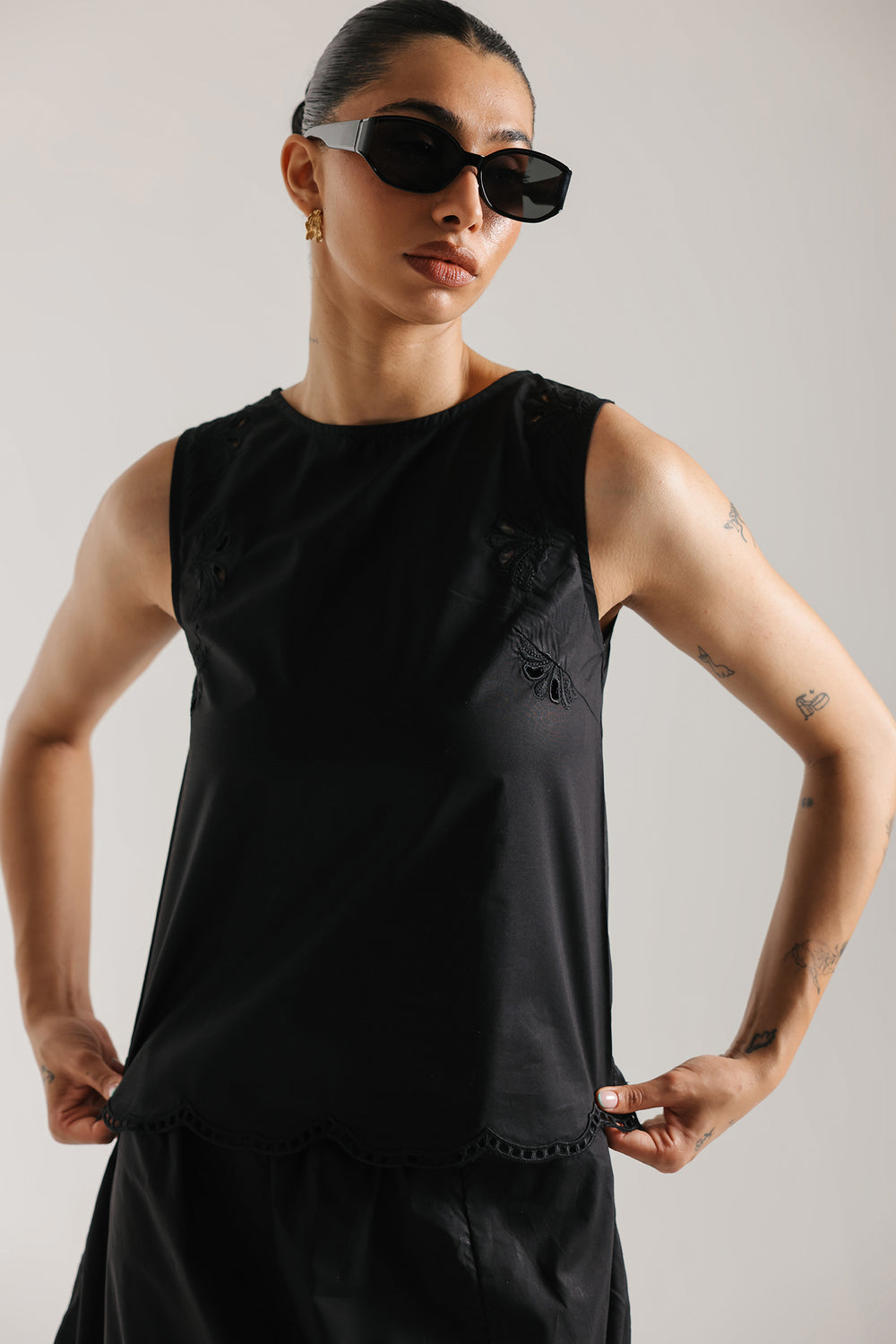 Elevate your wardrobe with this sophisticated two-piece ensemble featuring a sleeveless, high-neck shell top in premium lightweight fabric with a subtle sheen. The relaxed, straight-cut silhouette pairs seamlessly with a midi skirt adorned with an asymmetrical lace appliqué that climbs gracefully up one side. The scalloped lace detailing adds a delicate, vintage-inspired touch to this modern black design, creating an effortlessly elegant look perfect for any occasion.