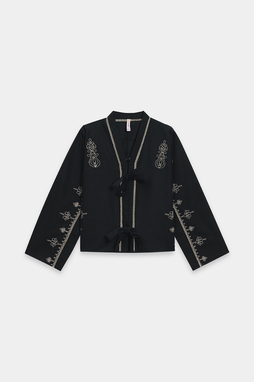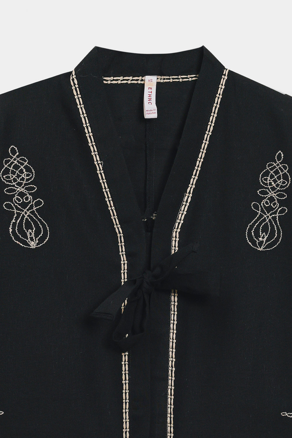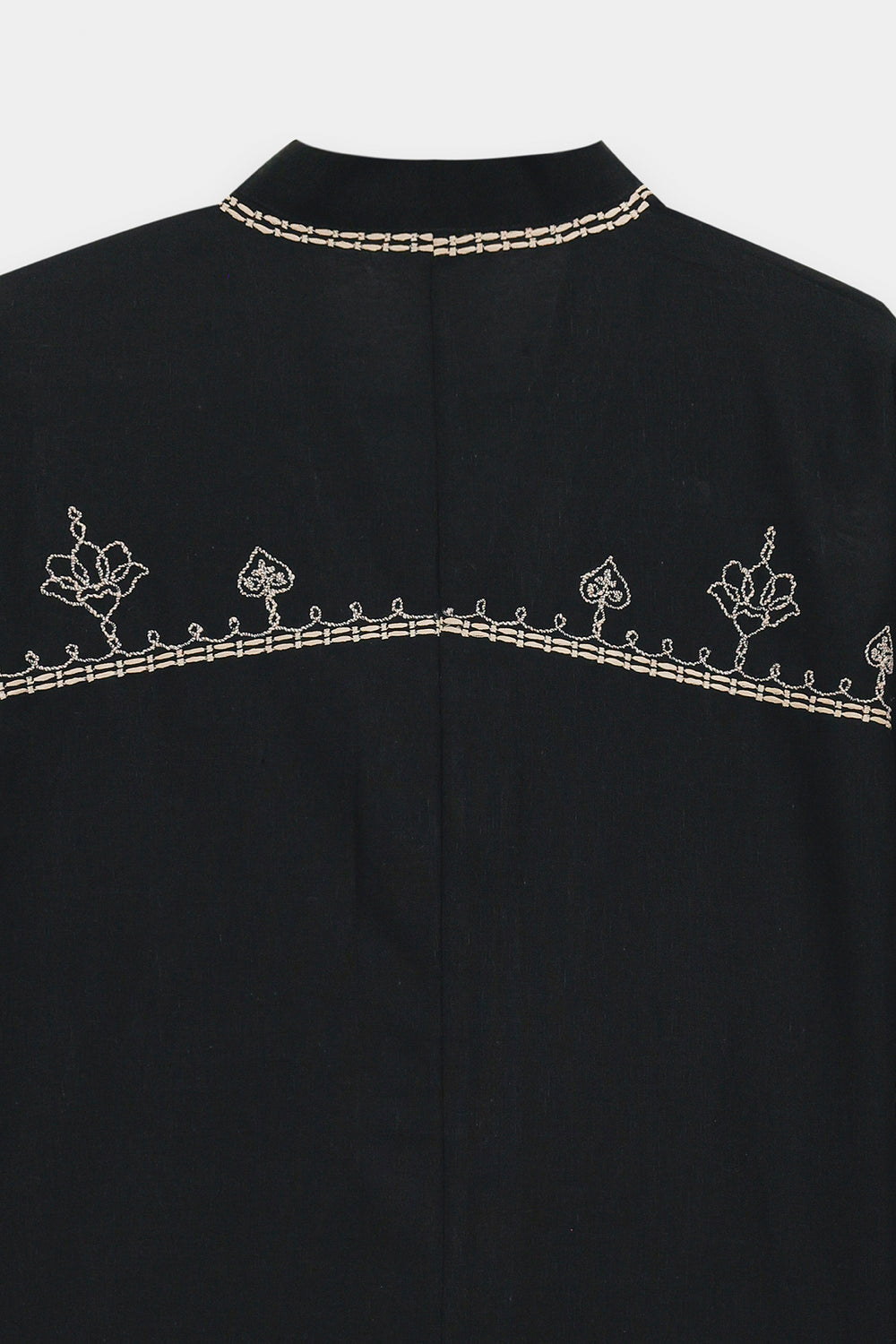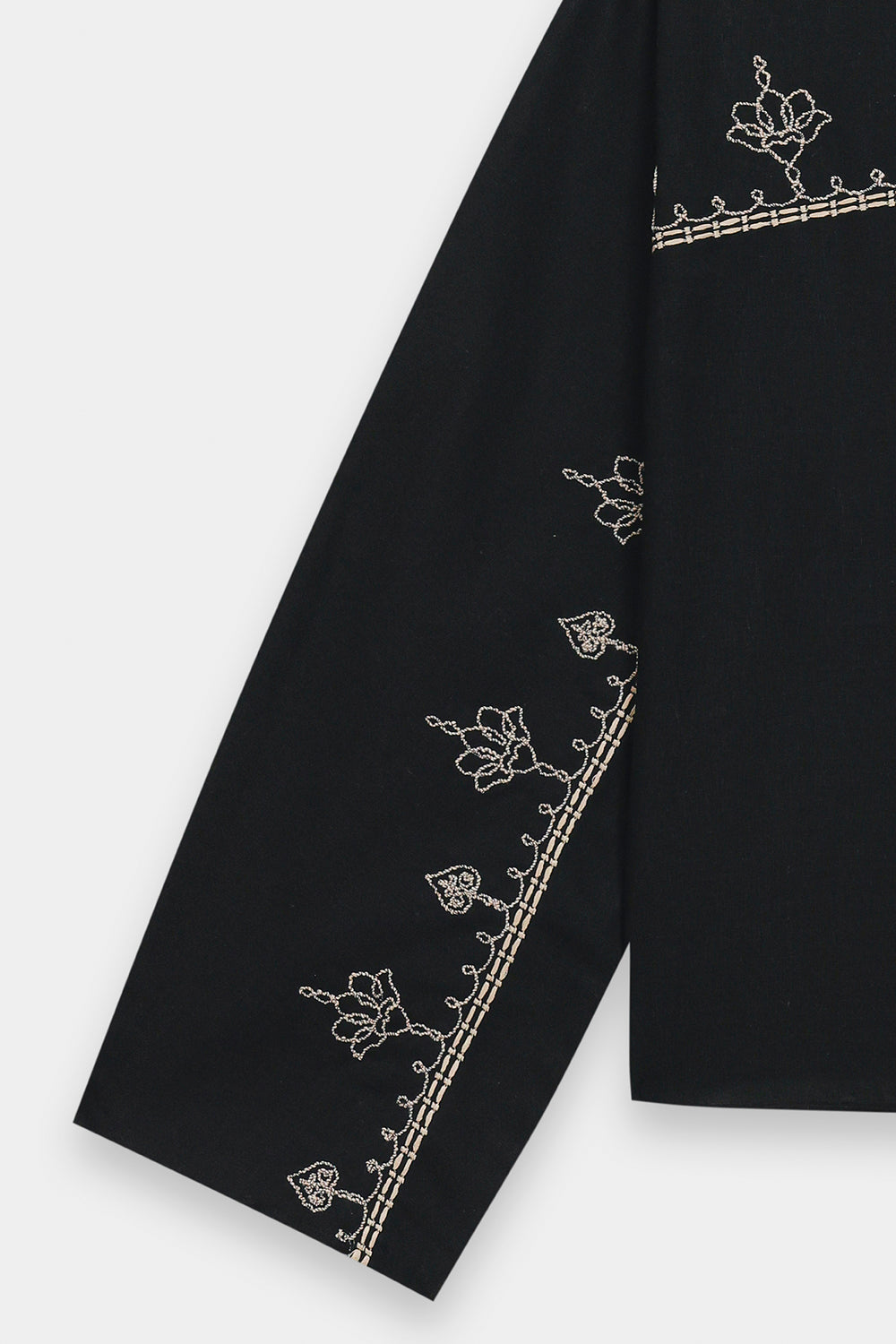 Make a statement with this striking embroidered top that celebrates traditional craftsmanship. Rendered in solid black fabric, this relaxed-fit piece features intricate embroidery in white and black, showcasing geometric and stylized floral motifs with authentic folk-art character. The detailed embellishments concentrate around the neckline, drawing focus to the garment's artisanal quality. Generous sleeves and an easy silhouette ensure comfort throughout the day, while a decorative tasseled tie at the neck adds finishing elegance.