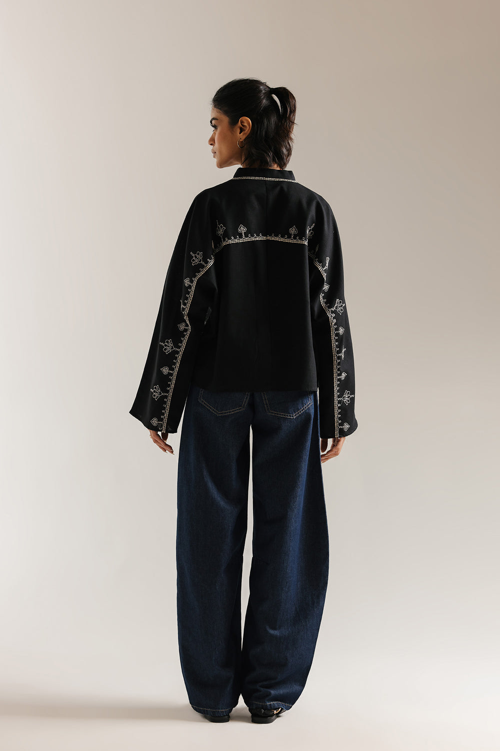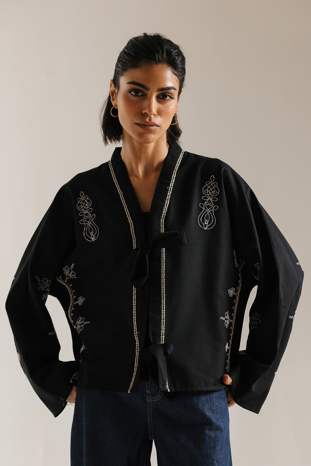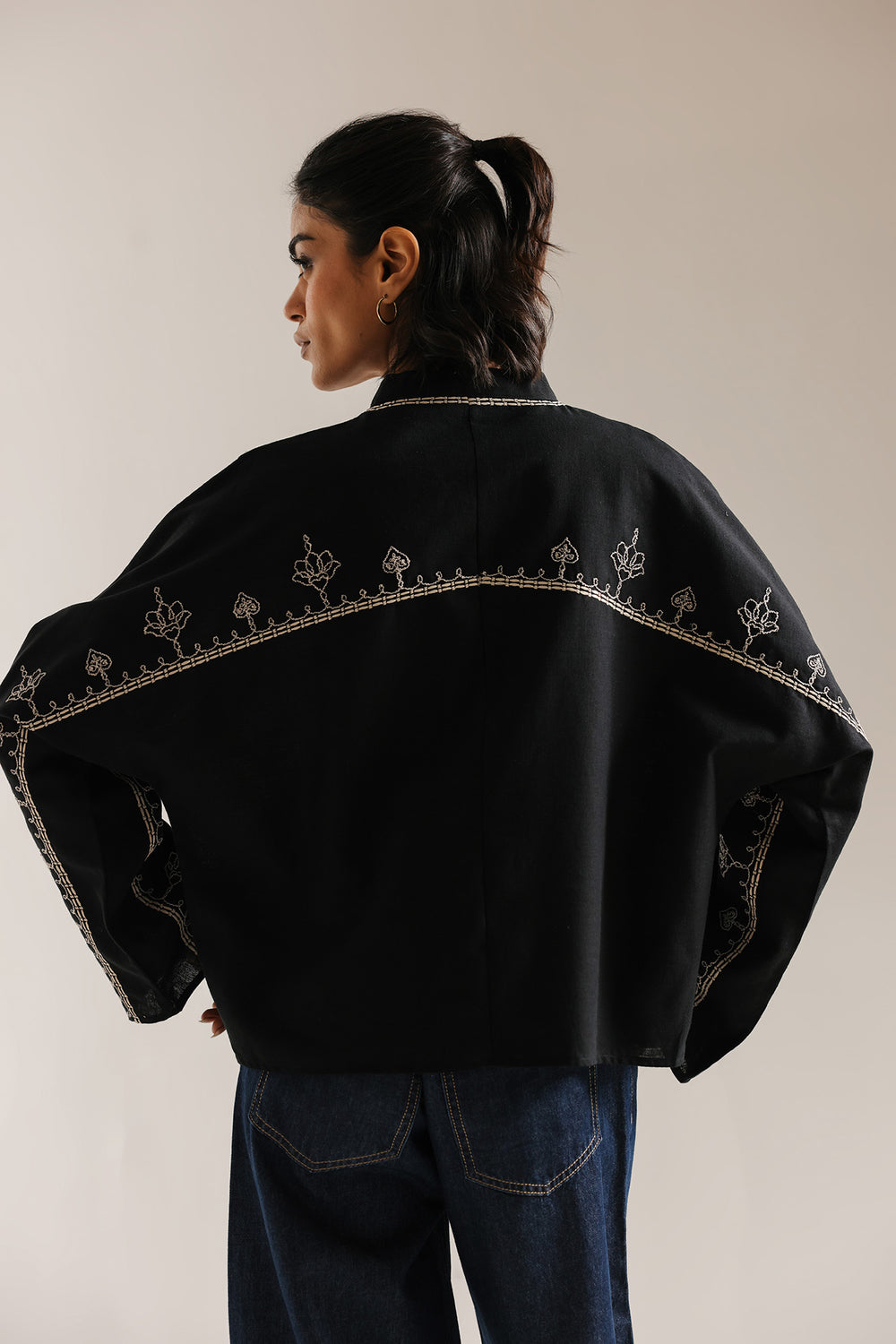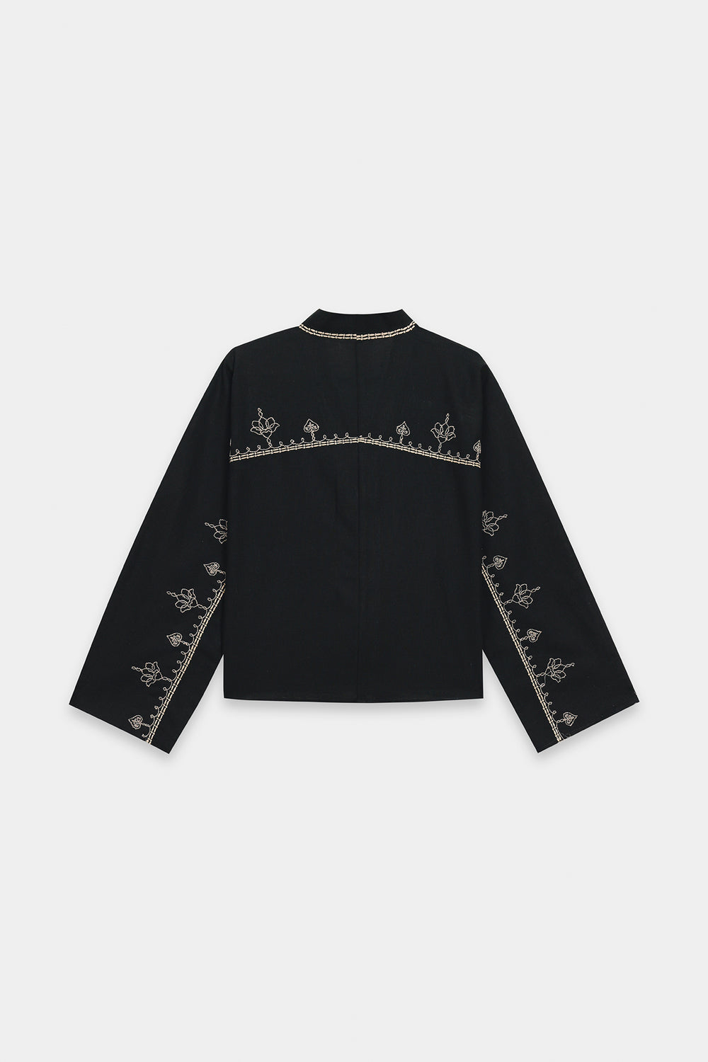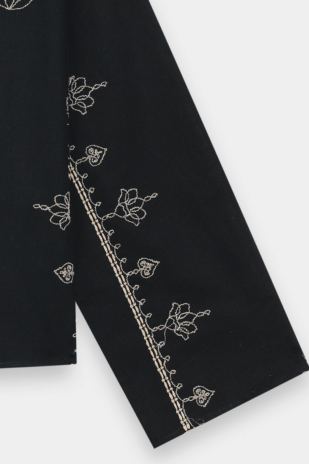 Make a statement with this striking embroidered top that celebrates traditional craftsmanship. Rendered in solid black fabric, this relaxed-fit piece features intricate embroidery in white and black, showcasing geometric and stylized floral motifs with authentic folk-art character. The detailed embellishments concentrate around the neckline, drawing focus to the garment's artisanal quality. Generous sleeves and an easy silhouette ensure comfort throughout the day, while a decorative tasseled tie at the neck adds finishing elegance.