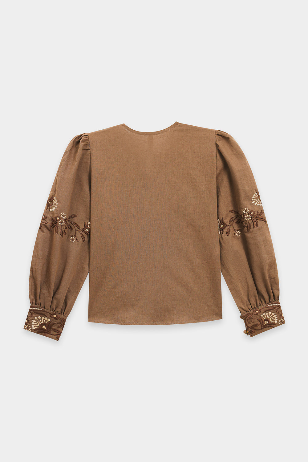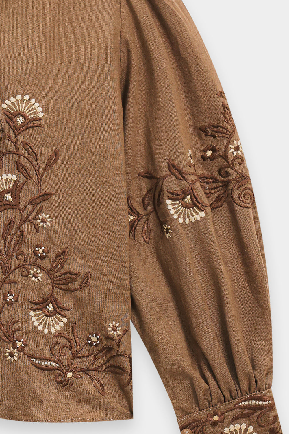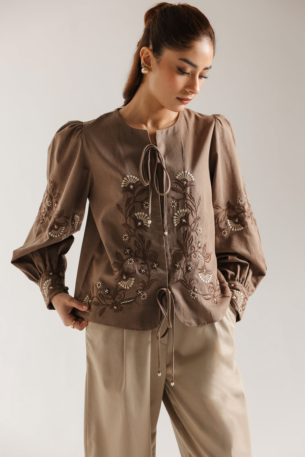 Elevate your wardrobe with this sophisticated embroidered top. The relaxed silhouette features a round neckline with front tie-closure and adjustable drawstring hem for personalized fit. Voluminous bishop sleeves with gathered shoulders and fitted cuffs create an elegant silhouette, while intricate floral embroidery and beadwork in rich browns, beiges, and pearl tones adorn the chest and sleeves. A refined piece that seamlessly transitions from casual to elevated occasions.