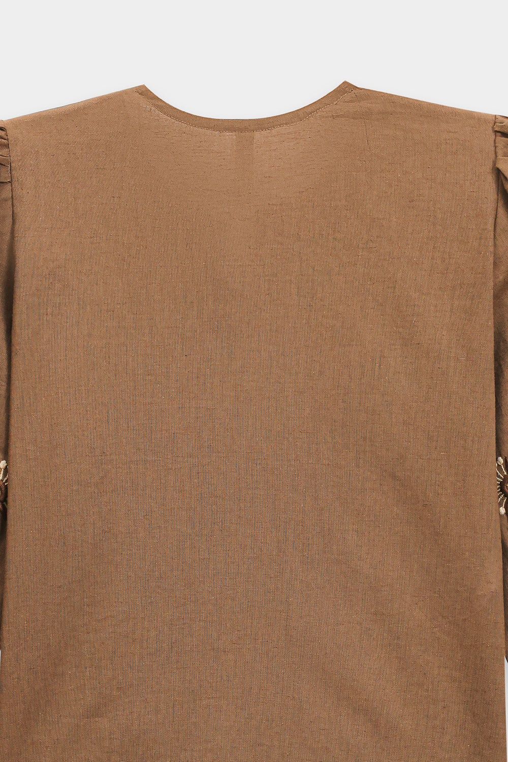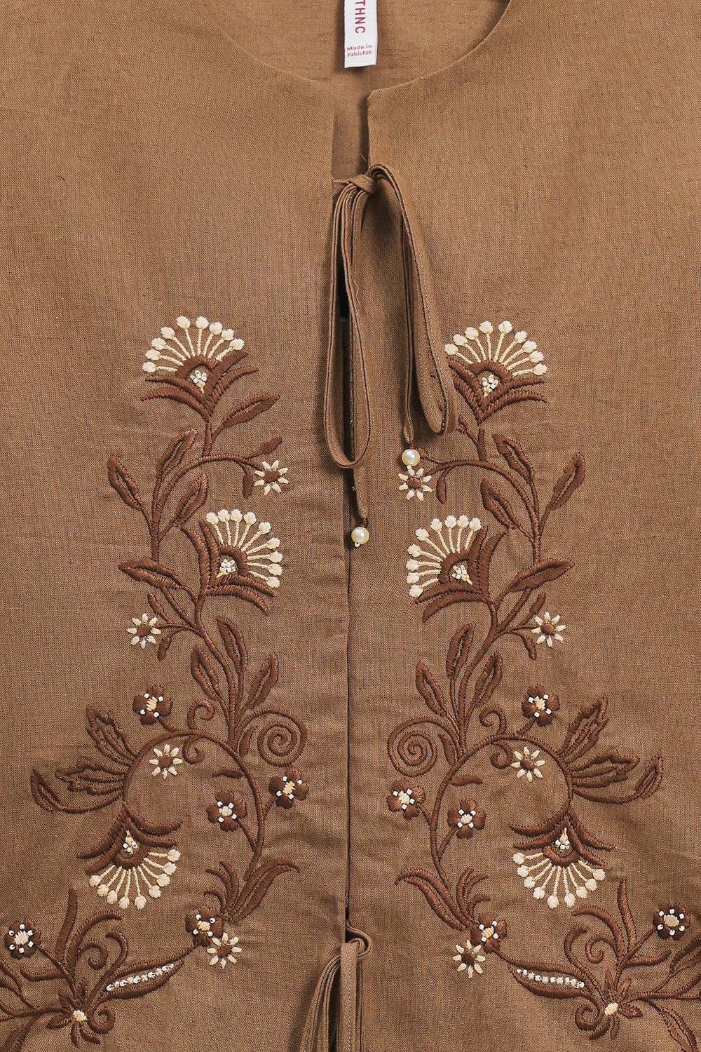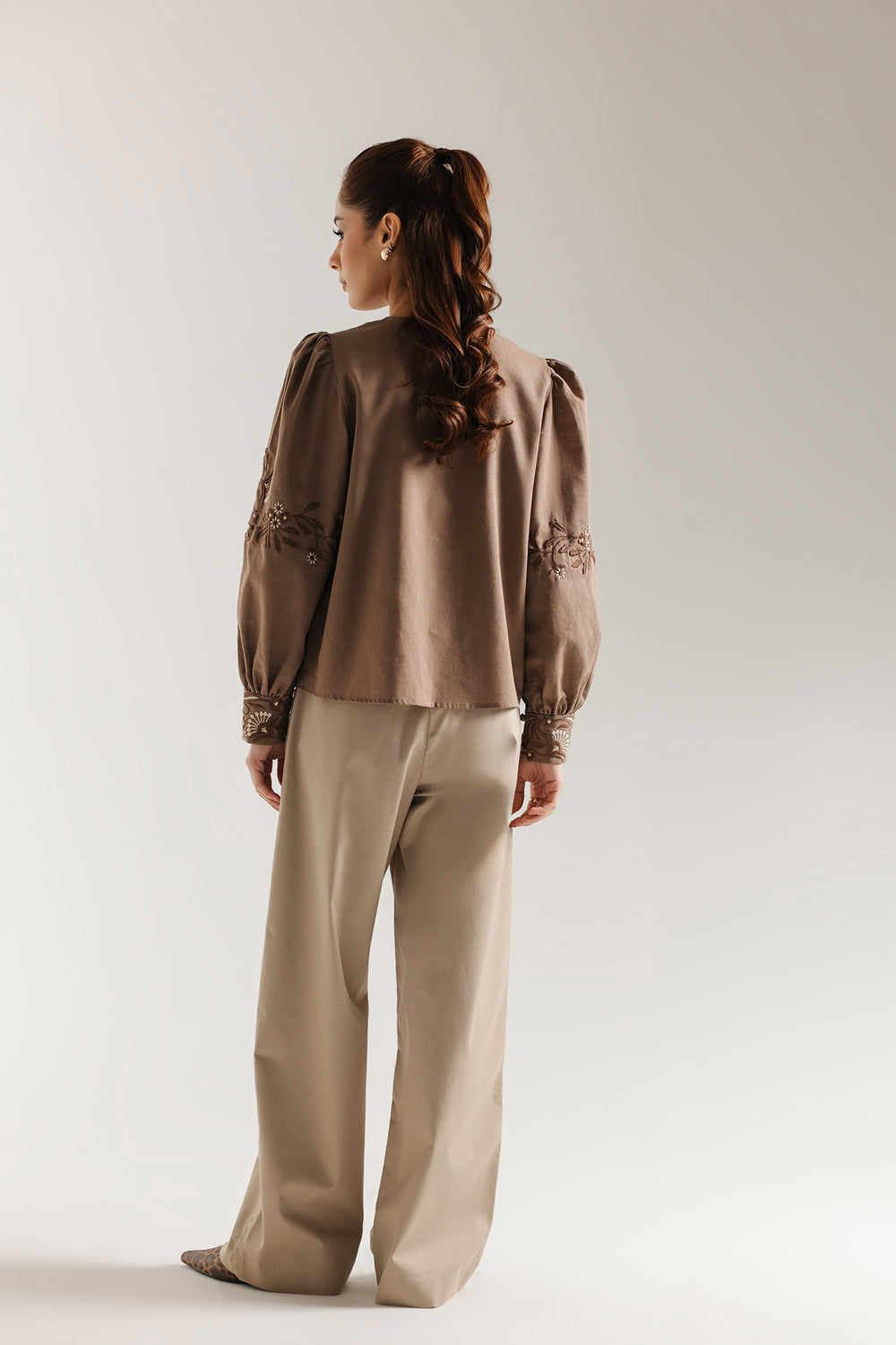 Elevate your wardrobe with this sophisticated embroidered top. The relaxed silhouette features a round neckline with front tie-closure and adjustable drawstring hem for personalized fit. Voluminous bishop sleeves with gathered shoulders and fitted cuffs create an elegant silhouette, while intricate floral embroidery and beadwork in rich browns, beiges, and pearl tones adorn the chest and sleeves. A refined piece that seamlessly transitions from casual to elevated occasions.
