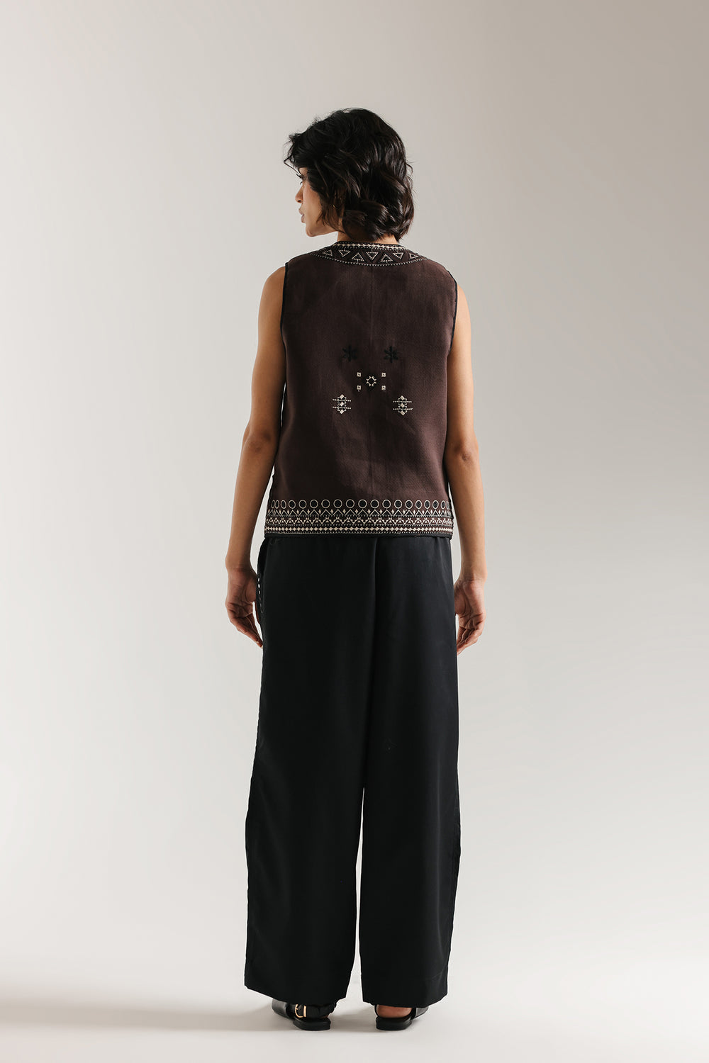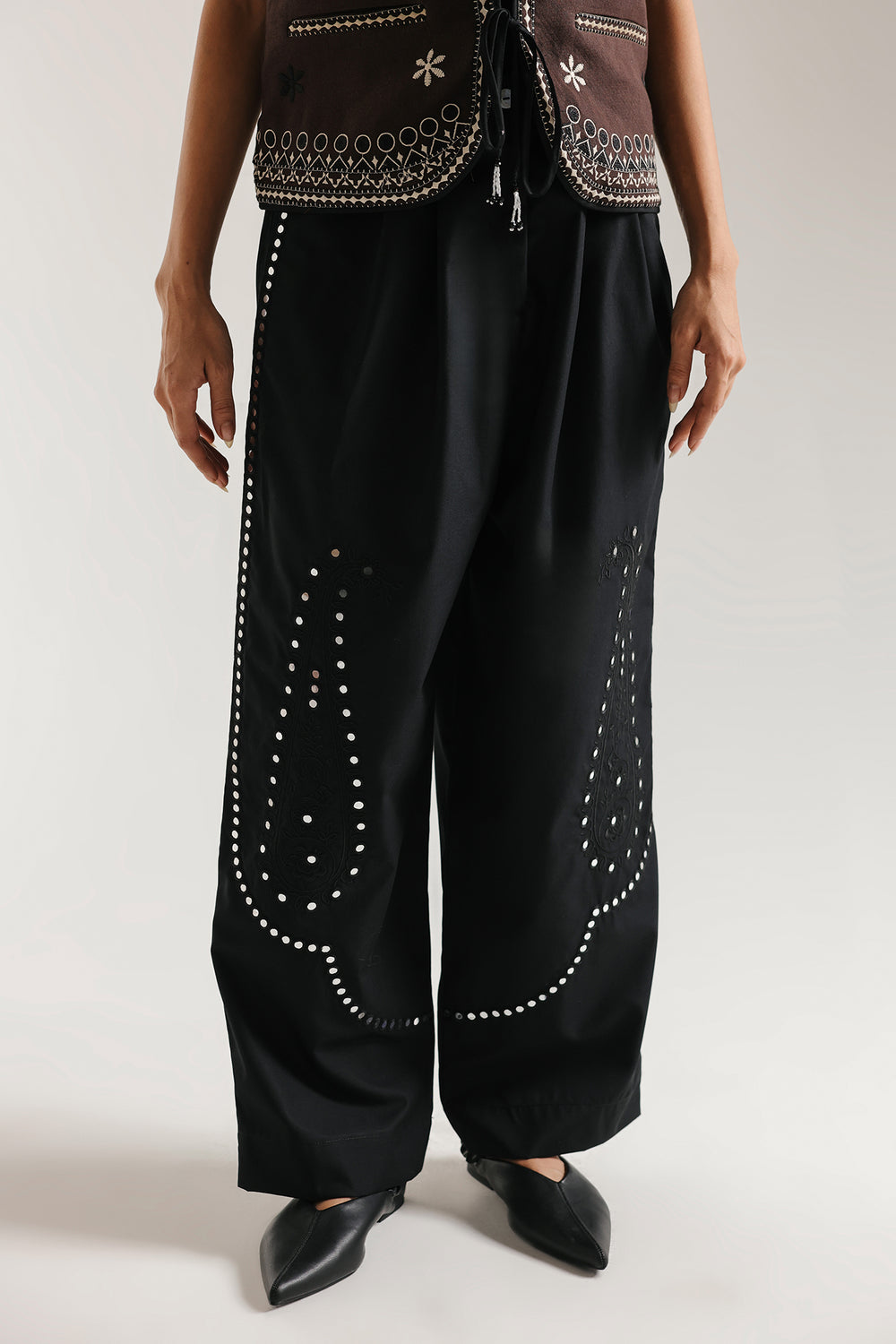 Elevate your everyday wardrobe with these sophisticated embroidered trouser, designed for those who appreciate refined craftsmanship. The generously straight fit trendy silhouette drapes beautifully in luxurious black fabric, while delicate paisley embroidery enhanced with mirror embellishments adds an artistic dimension. This thoughtful design balances comfort with elegance, offering effortless versatility that transitions seamlessly across occasions.