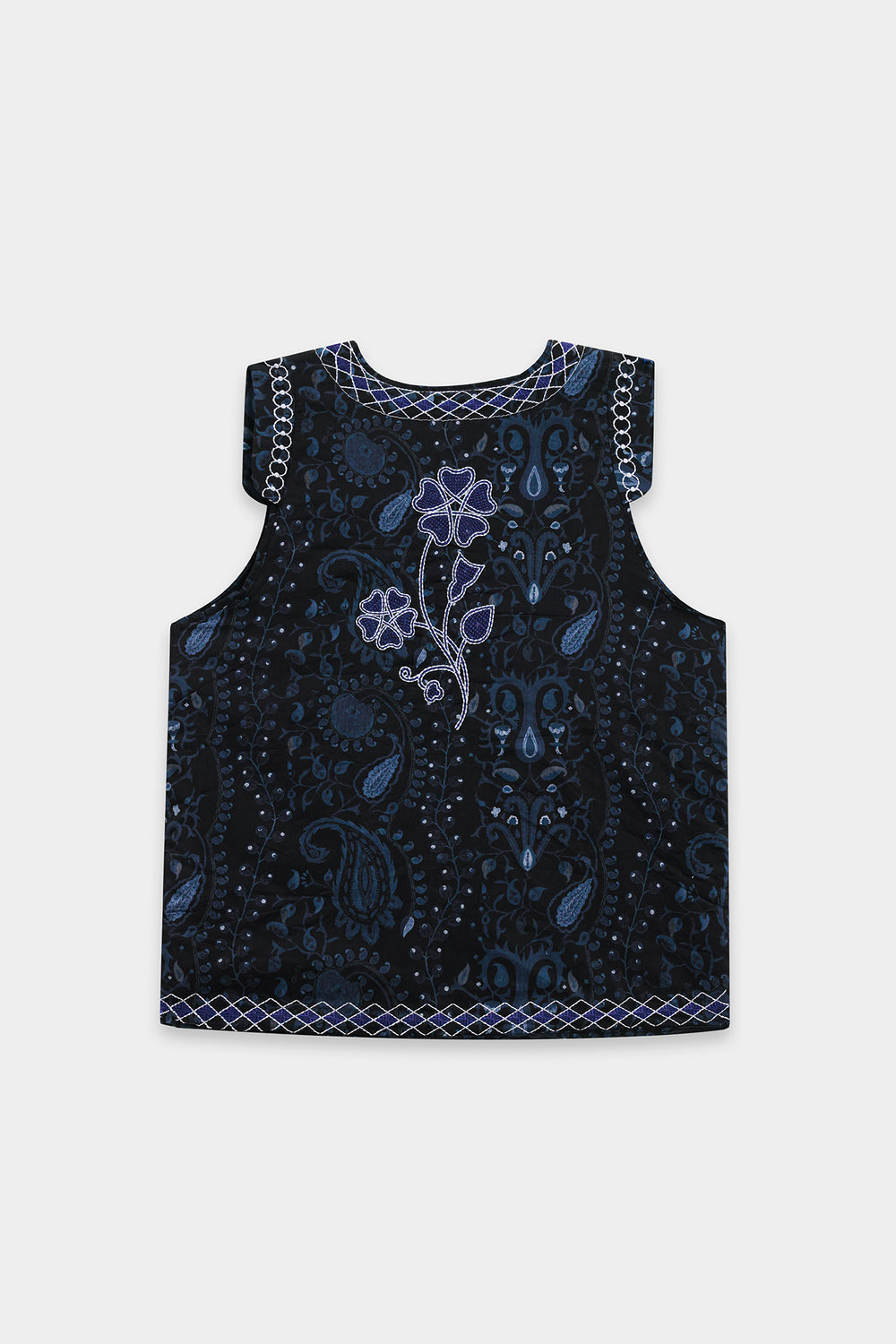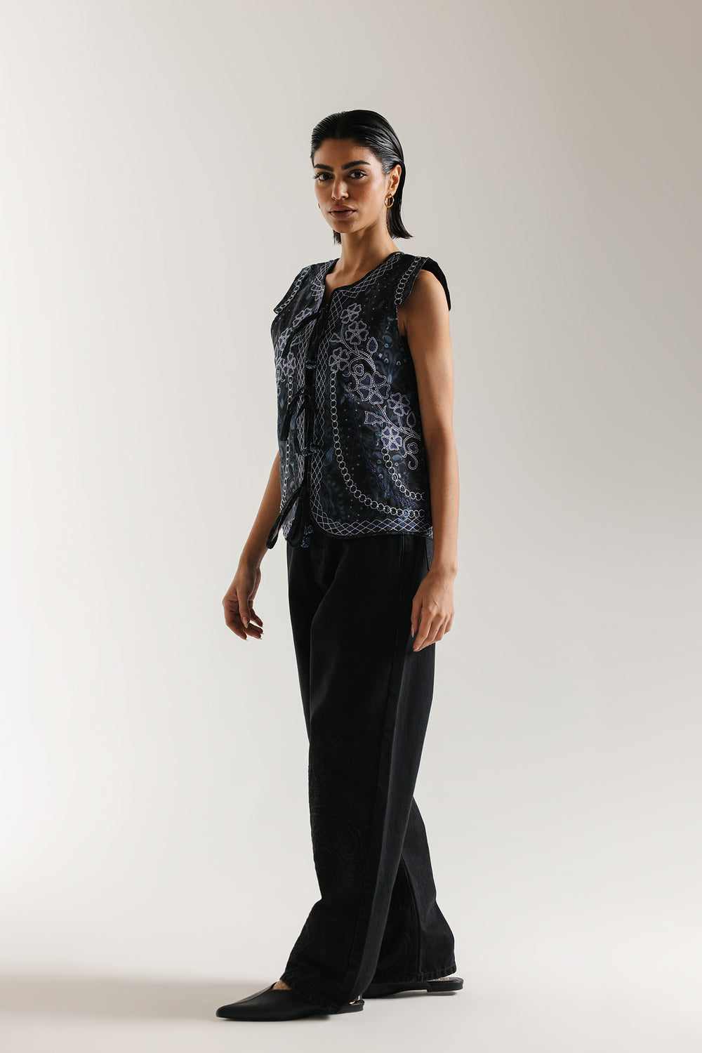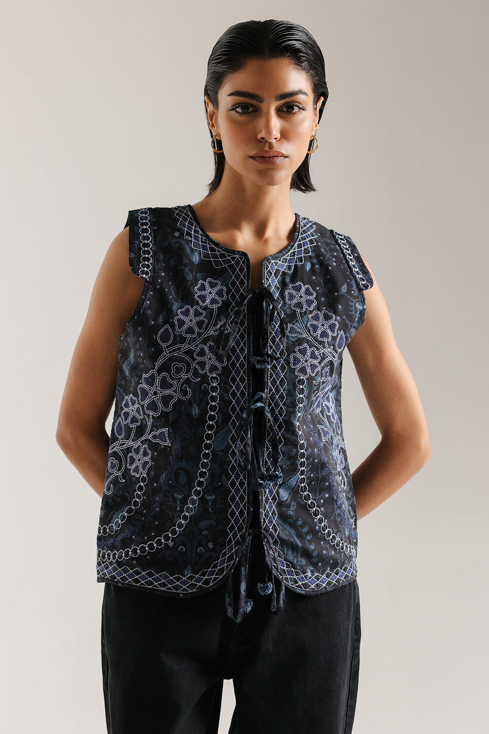 This intricately patterned embroidered waistcoat is a statement piece that demands thoughtful styling to showcase its detailed craftsmanship. The visually rich design pairs beautifully with understated basics that allow the vest's artistry to take center stage. Layer it over a navy turtleneck with dark wash denim for a sophisticated monochromatic look, or style it casually with a grey marl sweatshirt and olive cargo pants for weekend ease. A versatile investment that transitions seamlessly from casual to polished occasions.