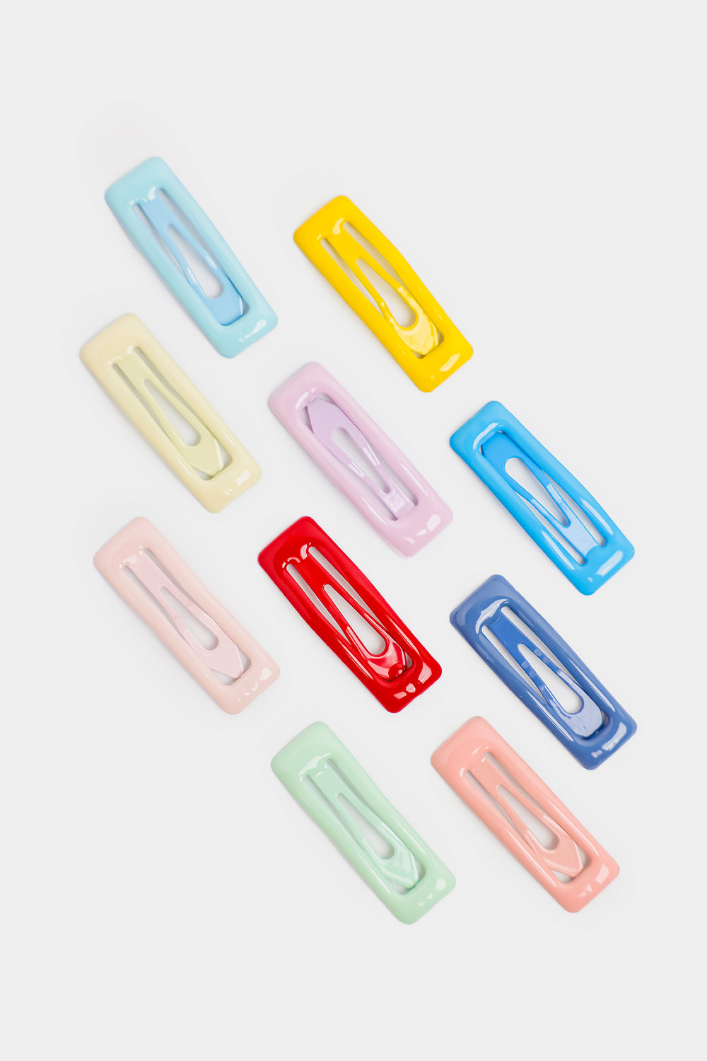 Vibrant multi-color rectangular pins designed for children's hair styling needs. This collection features an array of bright, eye-catching hues that appeal to young personalities while offering practical functionality. The rectangular shape provides excellent grip and hold, these pins are gentle on delicate hair and comfortable for extended wear. The diverse color palette allows kids to mix, match, and express their individual style preferences. An ideal accessory for everyday hairstyles, school, or playtime adventures.