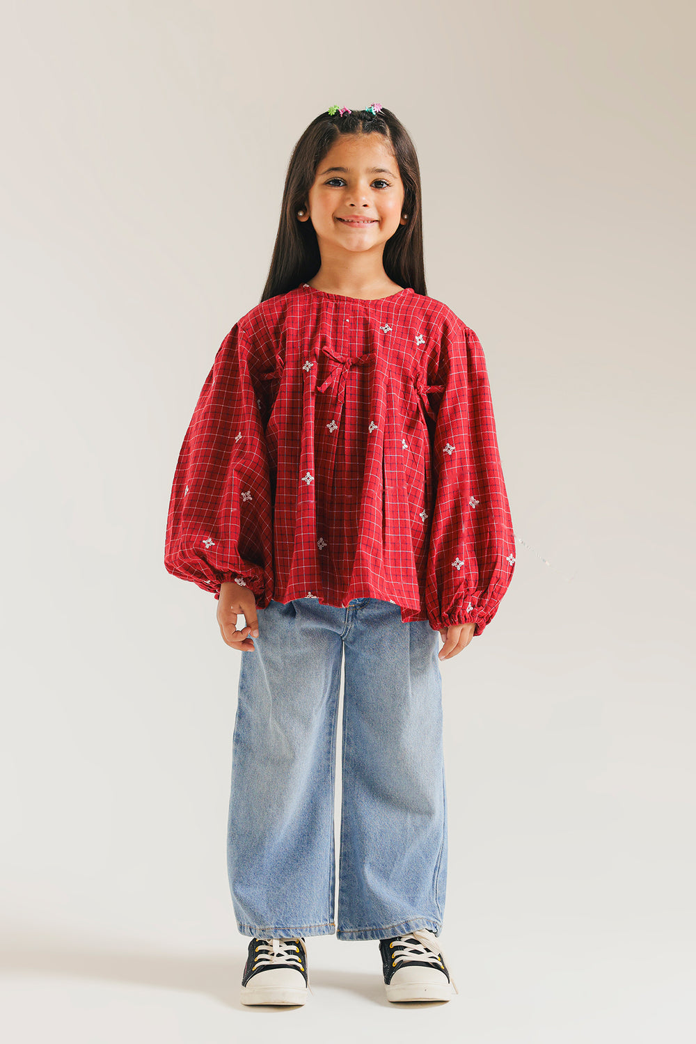 Elevate your kids wardrobe with this sophisticated wine-colored blouse, designed with romantic balloon sleeves that create an effortlessly elegant silhouette. Delicate small bows adorning the front add a refined touch of femininity, while the printed detailing brings visual interest and versatility to your styling options. Perfect for both professional settings and casual occasions, this piece seamlessly transitions from day to evening wear.