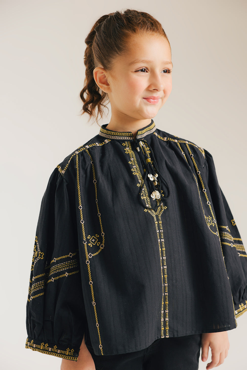 Elevate your kid's wardrobe with this expertly crafted blouse featuring a sophisticated ban sleeve design paired with elegant slits that enhance movement. The flowing sleeves create a graceful silhouette while the short length offers versatile styling options for both casual and formal occasions. Intricate embroidery detailing adds a refined touch, making this piece a standout addition to your collection. Perfect for those who appreciate quality craftsmanship and contemporary design.