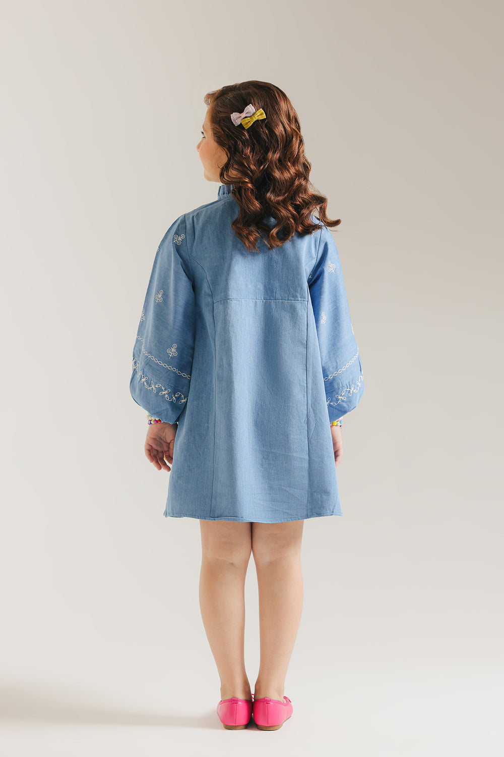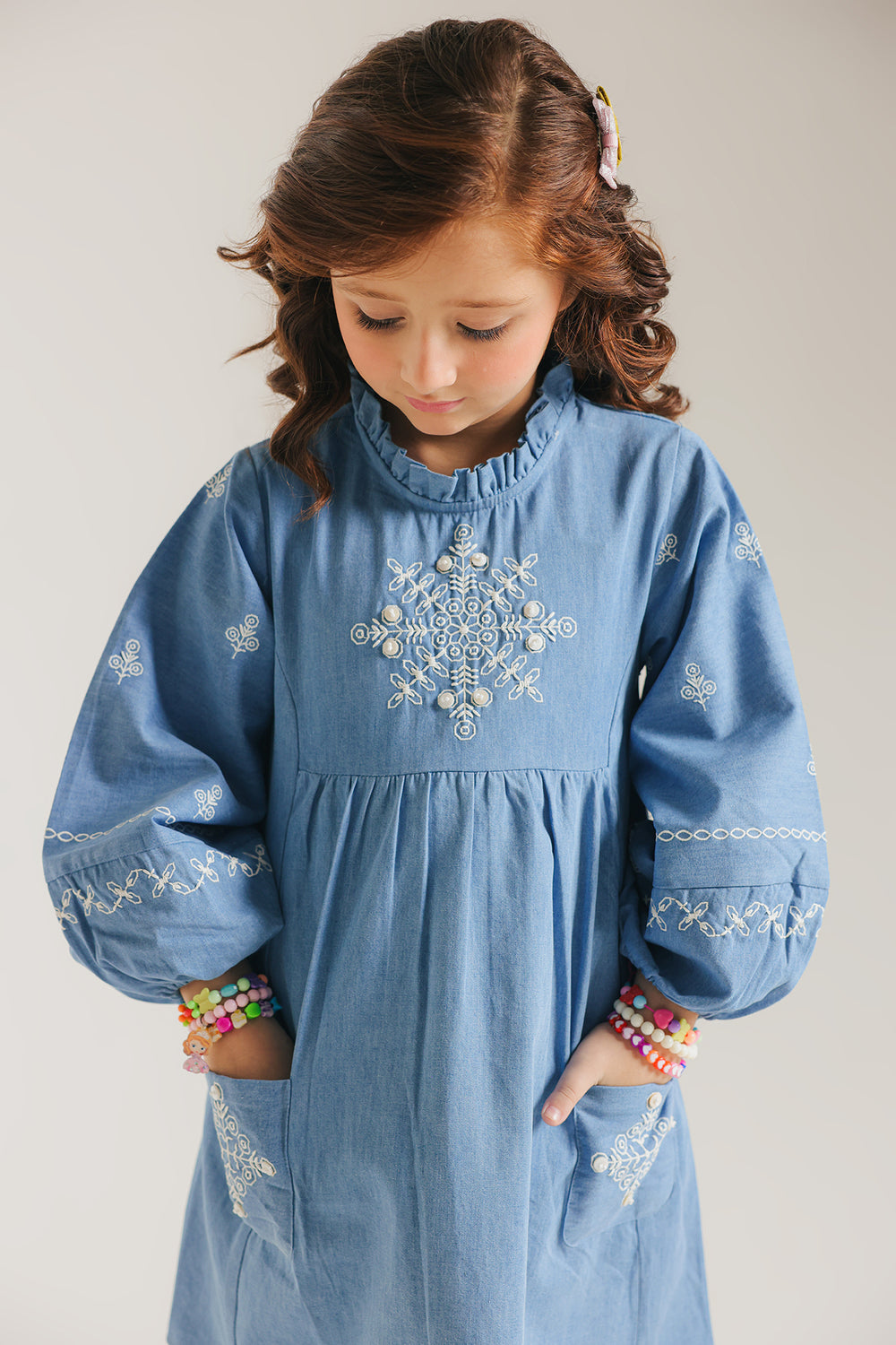 Let her imagination bloom in this adorable and charming blue embroidered dress. This delightful mini-dress is crafted from a soft light wash chambray or denim-look fabric in a cheerful light blue. It features beautiful, contrast white floral embroidery scattered across the yoke, skirt, and charming patch pockets. The design includes an elegant high neck with a subtle ruffle trim, a softly gathered waistline, and playful long balloon sleeves finished with elasticated cuffs for comfort. This dress is a perfect blend of sweet innocence and playful bohemian style.