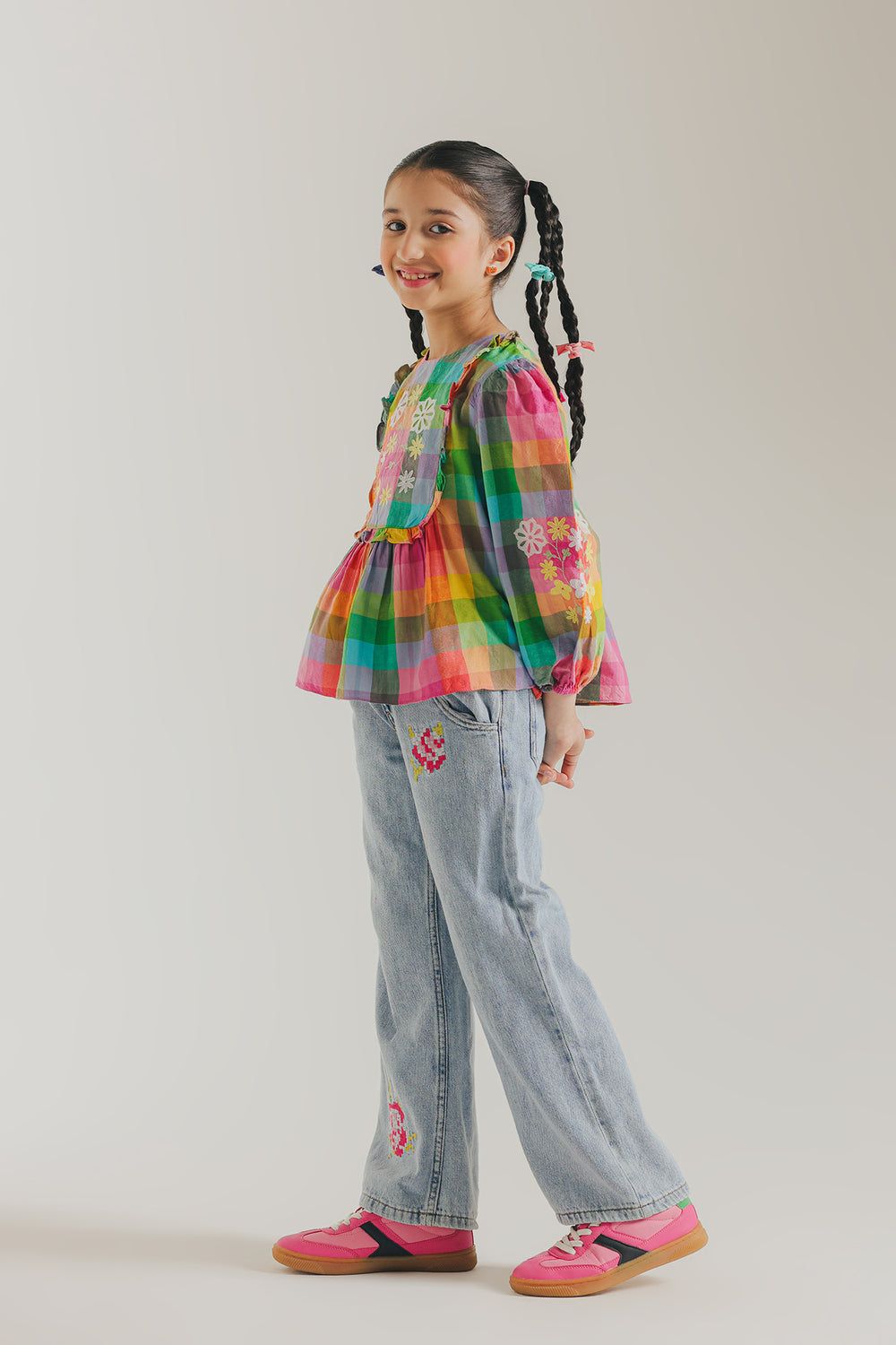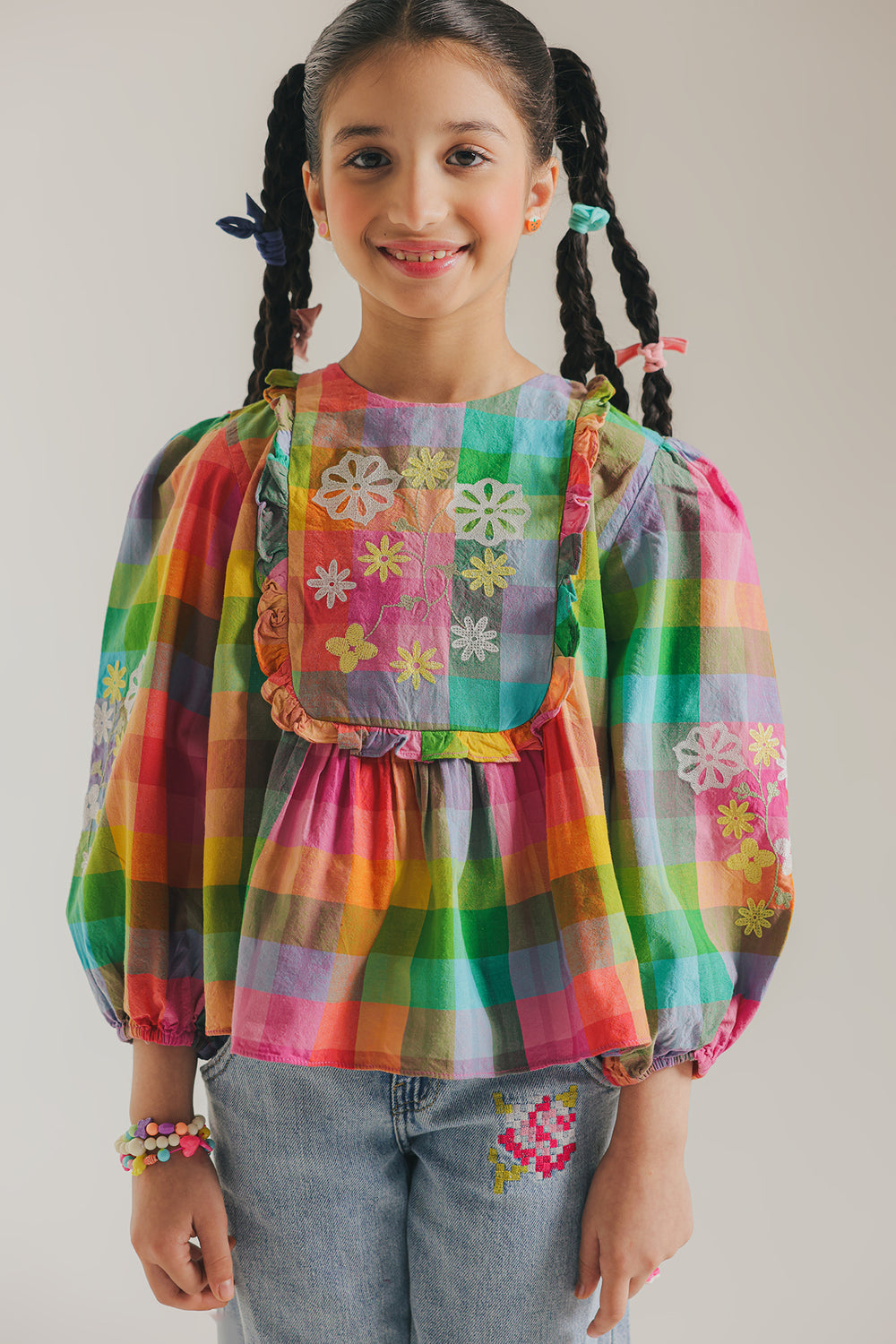 Bring joyful color and whimsical charm to her wardrobe with this playful top. This vibrant piece features a lively multi-colored plaid pattern in a delightful rainbow of hues. The top has a comfortable, flowing silhouette with a gathered waist, voluminous puff sleeves, and a ruffled trim detail around the yoke. Further enhancing its charming appeal, the garment is adorned with colorful floral embroidery on the chest and wrists. Paired with light wash denim trousers, this top is the perfect piece to make a happy, vibrant statement.