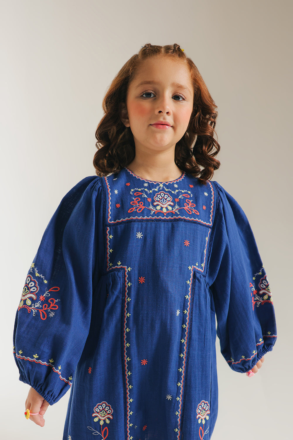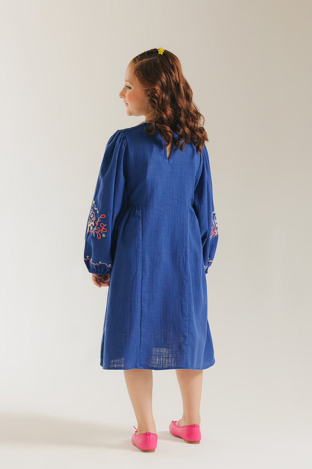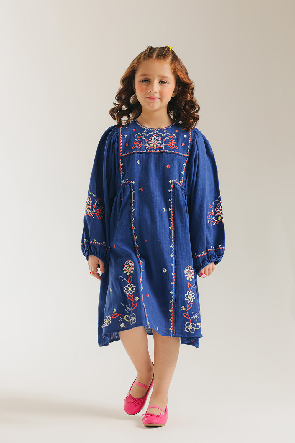 Enchant your little one with this charming blue embroidered dress. The knee-length frock is crafted from a soft blue fabric and features a beautiful square yoke design with delicate red, white, and pink floral embroidery that frames the neckline and bodice. The loose, voluminous sleeves and flowing silhouette create a comfortable yet elegant look, making it a perfect choice for special occasions.