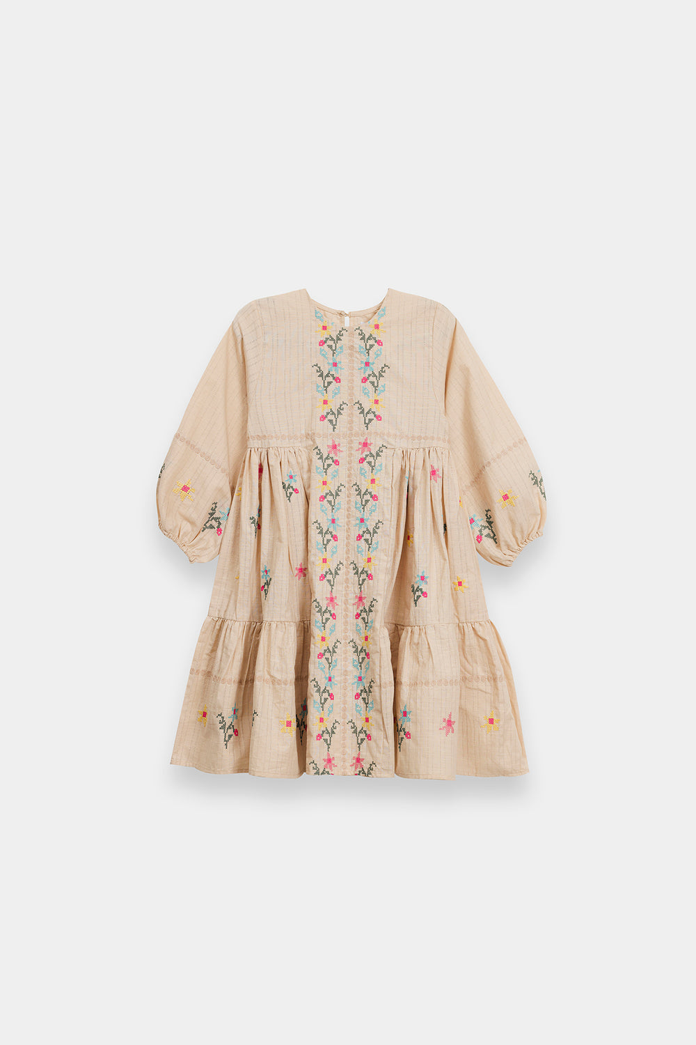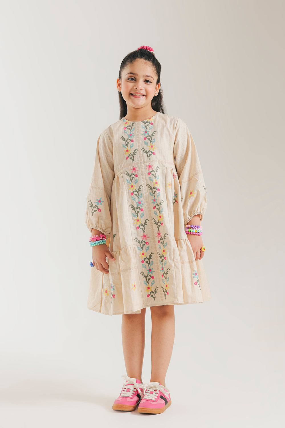 Introduce your little one to timeless elegance with this charming two-tiered embroidered frock. Crafted in soft pastel hues, the dress features delicate embroidery work that adds a touch of sophistication to everyday wear. The full sleeves provide comfort and coverage, making it perfect for various occasions—from family gatherings to casual outings. The layered silhouette creates beautiful movement and dimension, while the expert craftsmanship ensures durability through countless wears. An ideal choice for parents seeking quality and style in your kid.