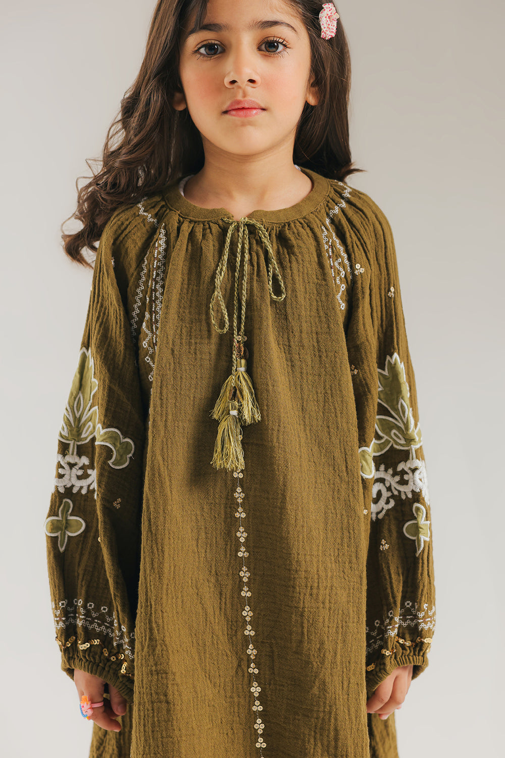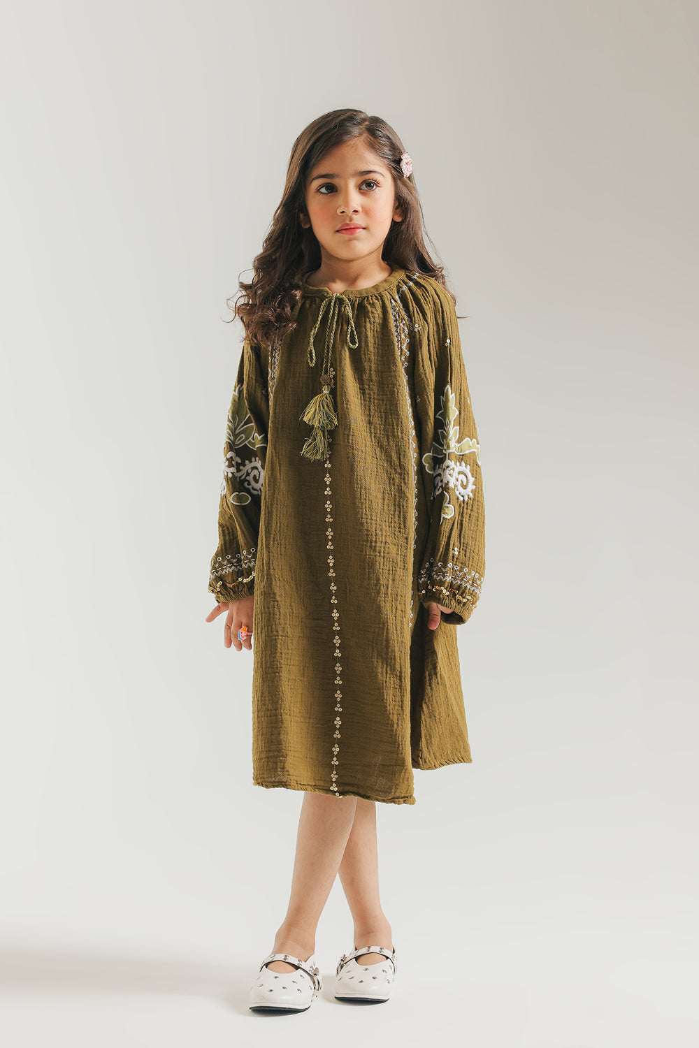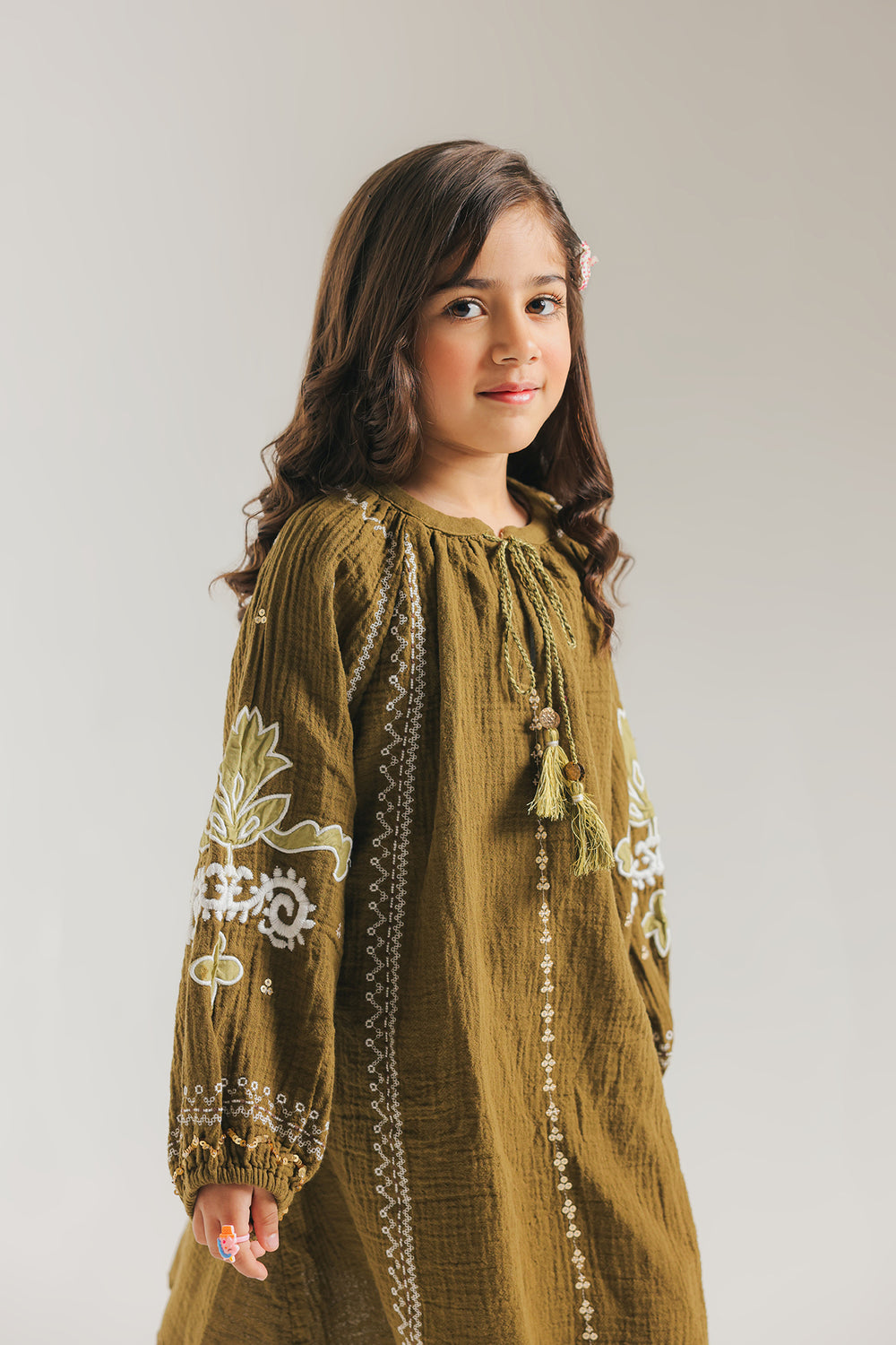 Rich, warm, and effortlessly elegant — this olive dress is a charming addition to any young wardrobe. Featuring delicate embroidery on the sleeves and subtle detailing along the front, it brings a refined yet playful touch. The gathered neckline and relaxed silhouette offer comfort and ease of movement, making it perfect for festive occasions, family gatherings, or special outings. Crafted from soft, breathable fabric, this piece combines style and comfort for a graceful, standout look.
