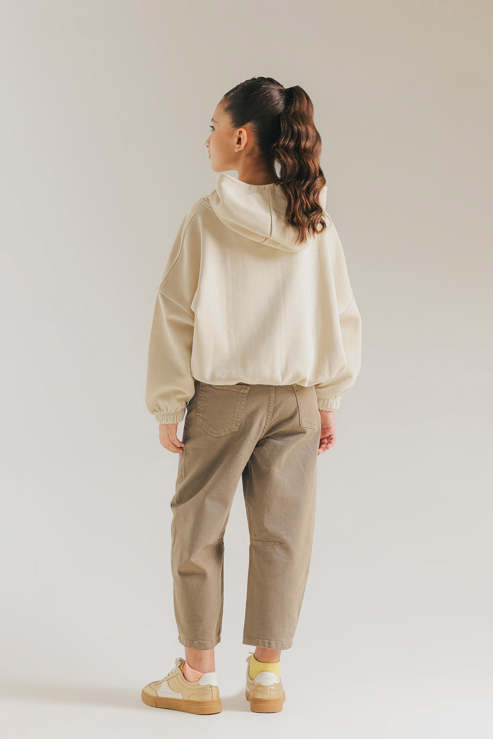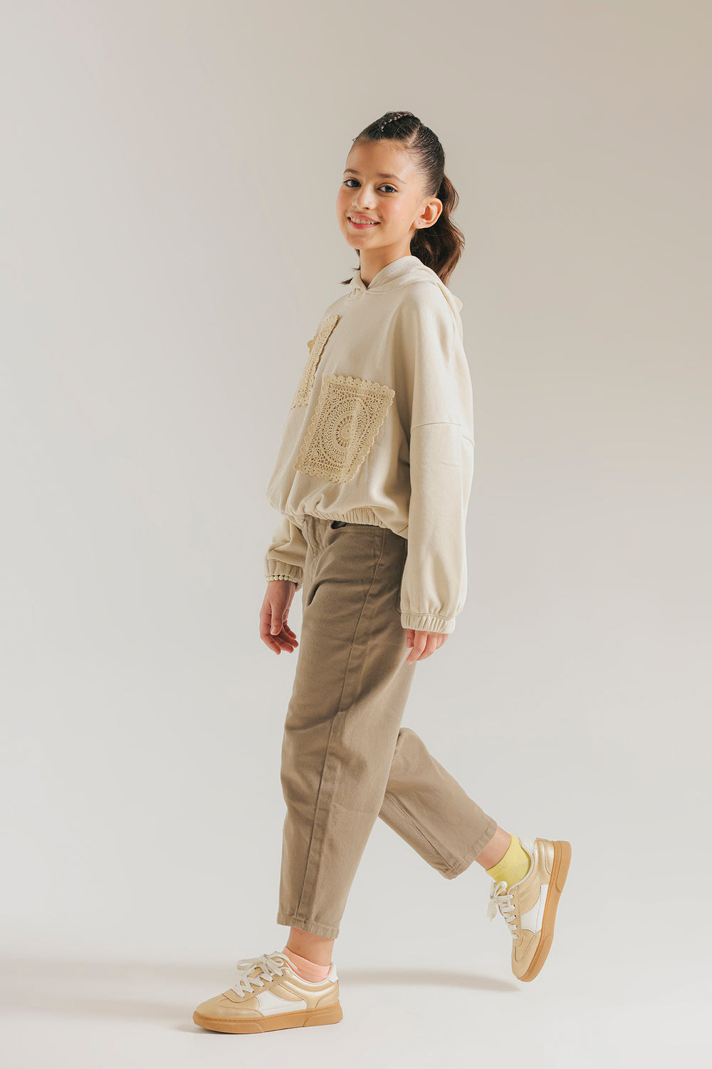 Elevate her casual style with this artistic and cozy ivory crochet-patch hoodie. Crafted in a soft, creamy ivory shade, this hoodie is a perfect blend of modern comfort and vintage-inspired charm. The design features a relaxed, oversized silhouette with dropped shoulders and voluminous sleeves, ensuring a comfortable fit for all-day wear. Its standout feature is the duo of intricate crochet lace patches on the front, adding a beautiful artisanal texture to the minimalist aesthetic. Finished with a snug, elasticated hem and cuffs to maintain its shape, this hoodie is a versatile piece that pairs effortlessly with neutral-toned trousers and gold sneakers for a polished, contemporary look.