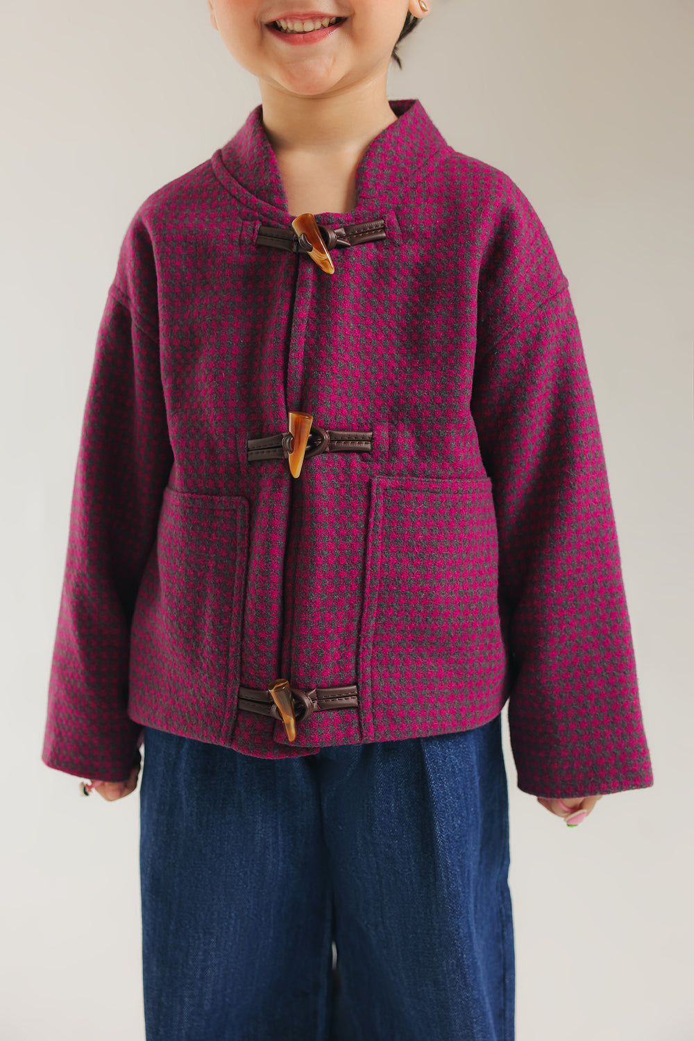 Wrap your little one in cozy, playful style with this charming jacket. The jacket is crafted in a rich, textured fabric featuring a subtle maroon and magenta geometric pattern. It features a classic asian-inspired silhouette with a band collar and a sophisticated, slightly cropped length. The standout detail is the trio of chunky, contrast-color toggle closures on the front, adding a touch of rustic charm to this warm and fun outerwear piece.
