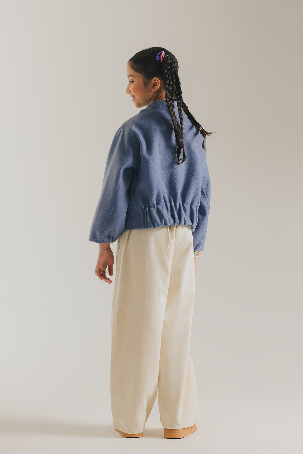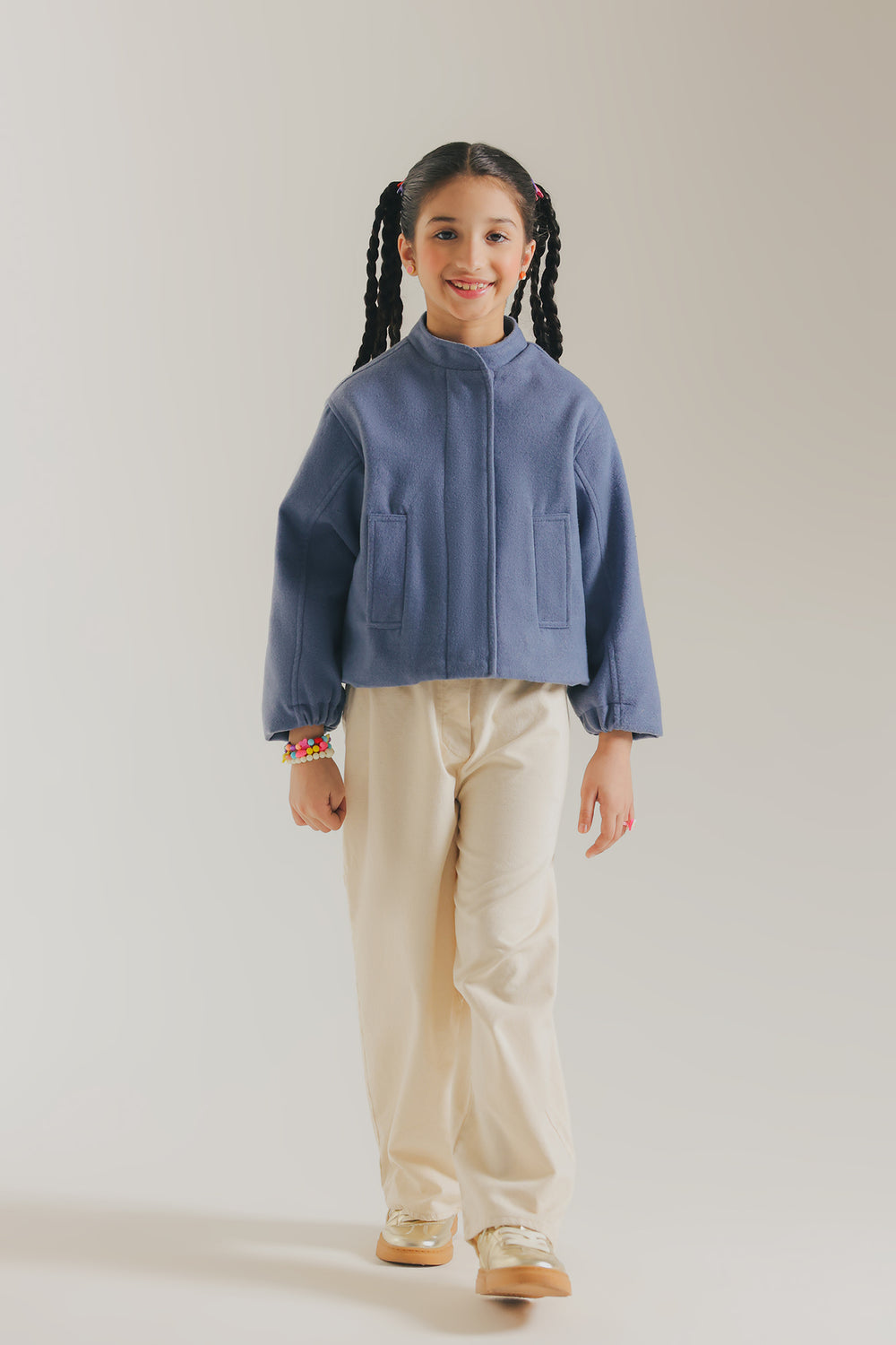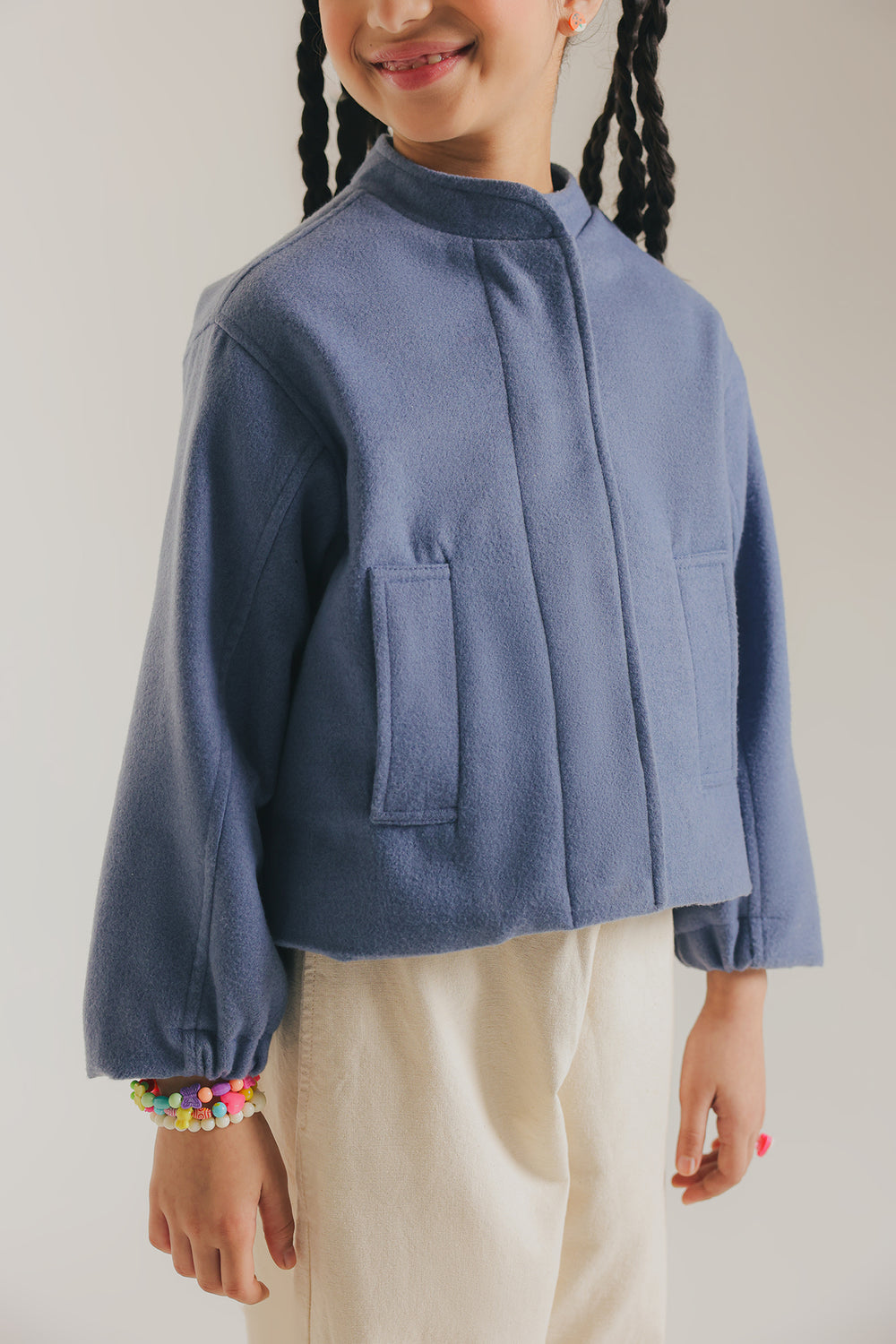 Inject effortless cool into her layering with this stylish jacket. This contemporary piece, designed for comfort and warmth, is crafted from a soft, textured fabric in a beautiful grey blue hue. The jacket features a short, boxy silhouette with long sleeves and a neat, high band collar. Practical details include subtle side pockets, making this a versatile and chic outer layer perfect for casual outings or layering during cooler weather.