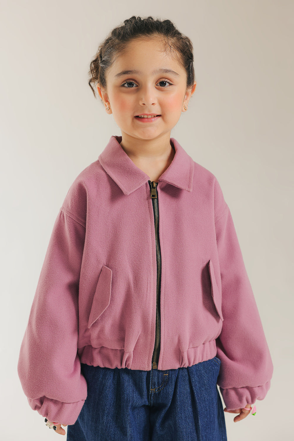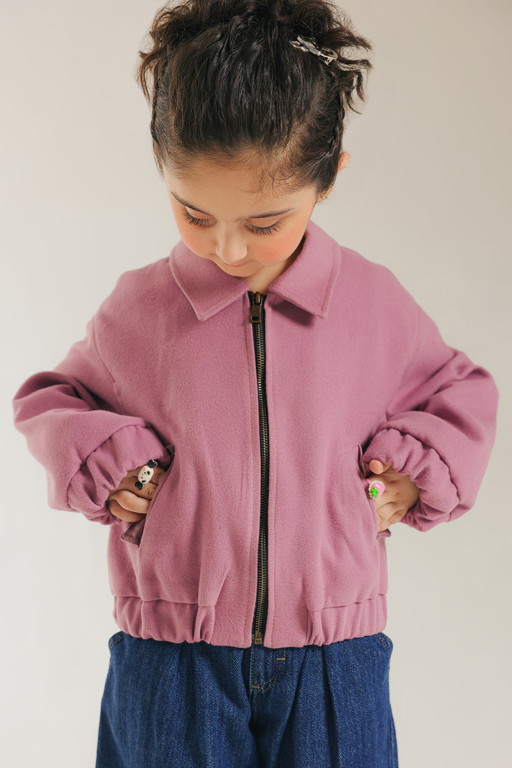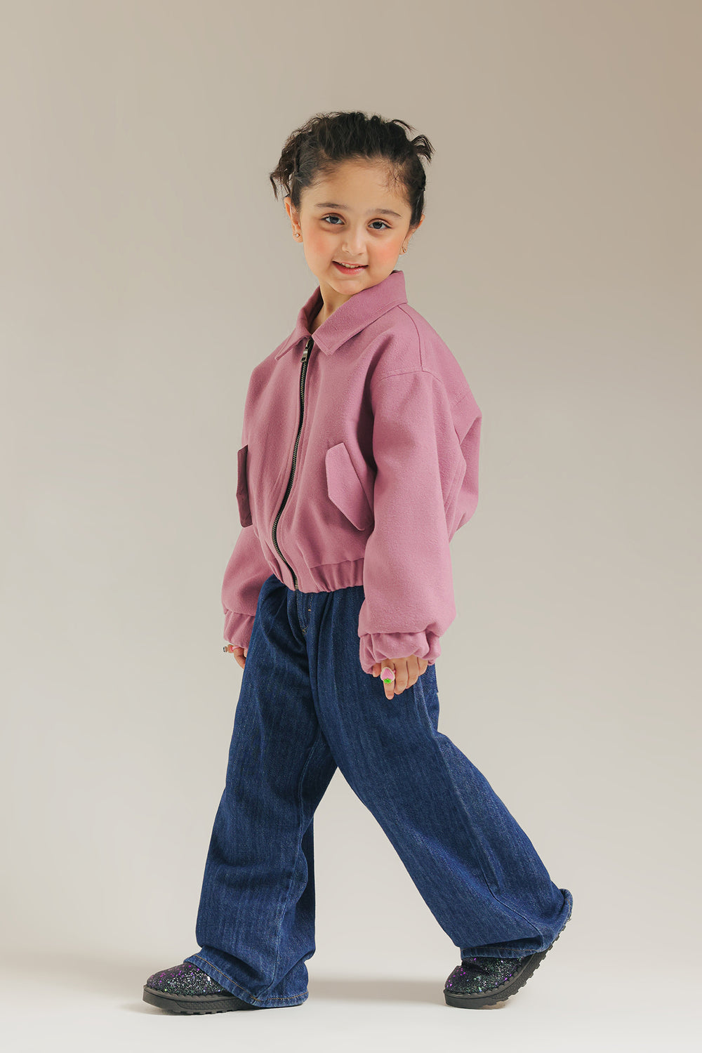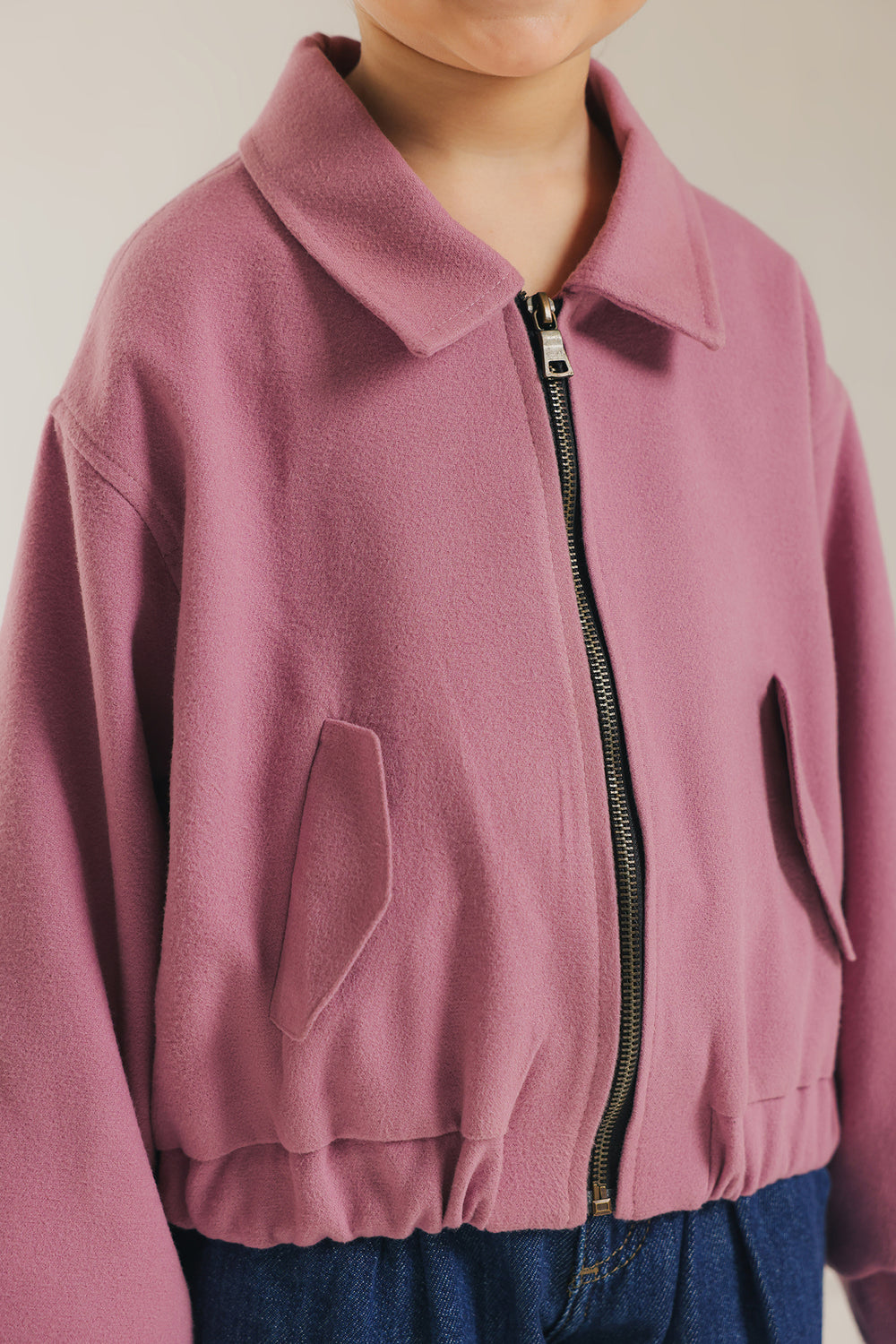 Channel playful, retro charm with this vibrant mauve Jacket. The cozy, wool-blend jacket features a cropped, boxy silhouette with a stylish wide collar and a full front zipper. The elasticated hem creates a slightly ballooned effect, giving it a fun, bomber-jacket feel. Paired with wide-leg pants, this jacket is a perfect statement piece for keeping your little one warm and fashionable.