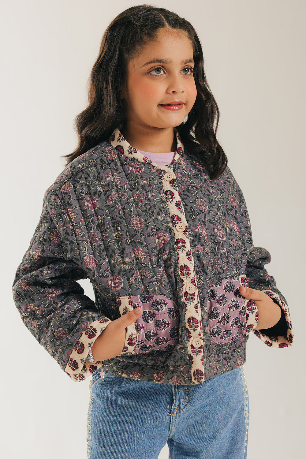 Unleash a charming, bohemian flair into her outerwear collection with this quilted Jacket. This short, stylish jacket features an all-over printed floral pattern in muted tones of slate grey, plum, and subtle green, giving it a cozy, vintage feel. The front is accented with an embroidered curved pocket detail on both sides of placket. This jacket is the perfect piece for adding both warmth and a unique, artistic layer to any outfit.