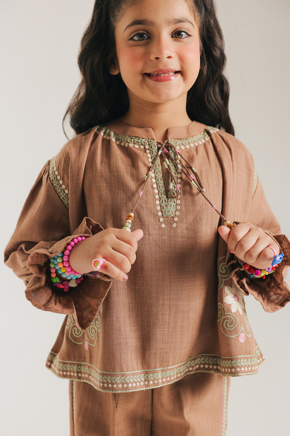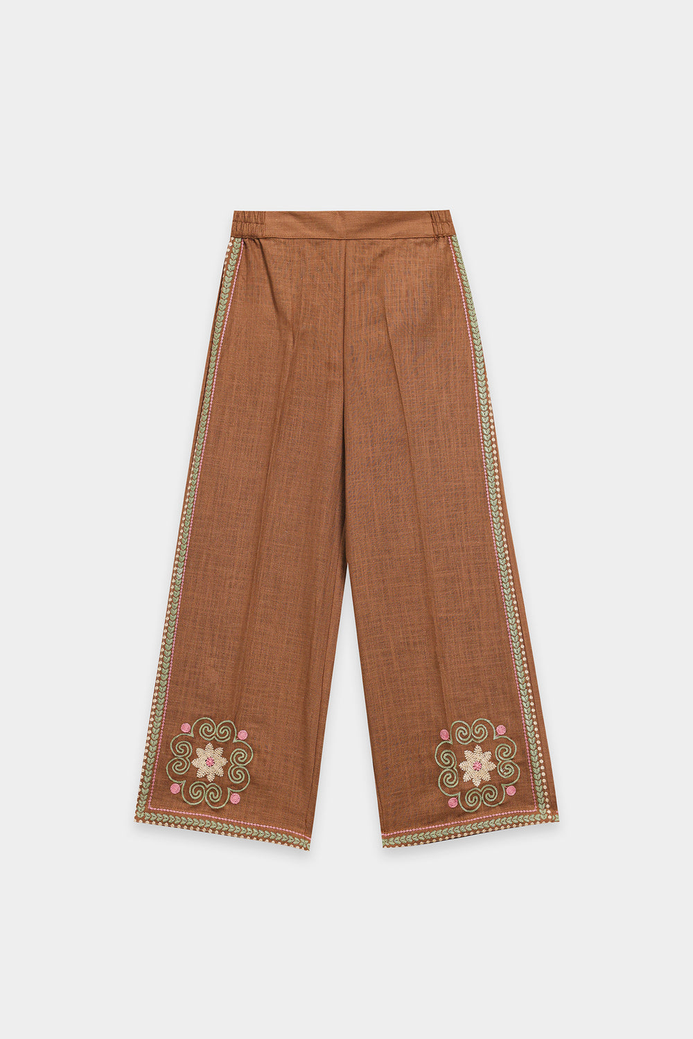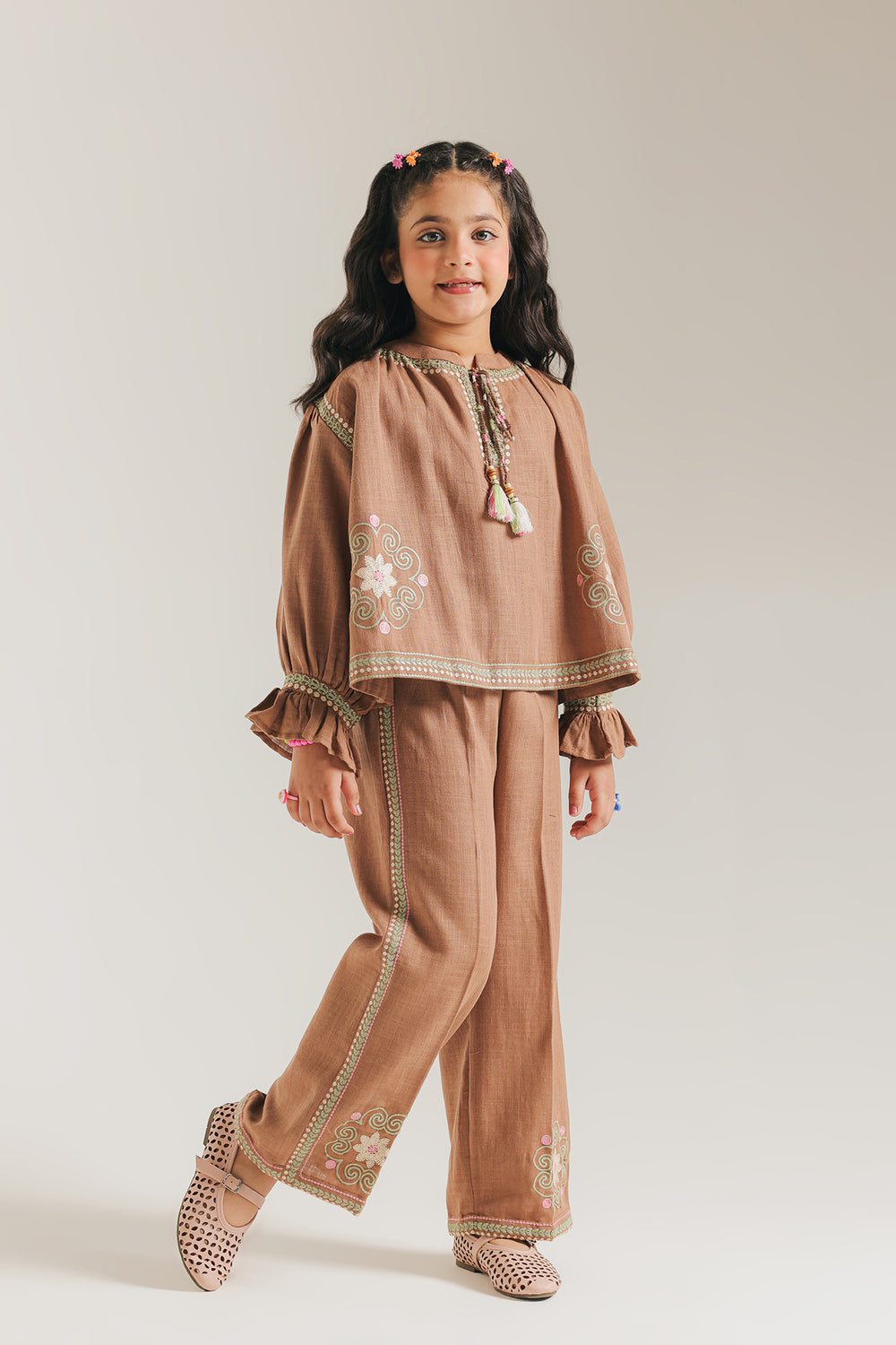 Capture the essence of cozy, artisanal style with this beautiful brown embroidered co-ord set. This stunning two-piece ensemble, featuring a peasant-style top and straight fit trouser, made from a rich, textured fabric in a warm caramel-brown hue. The top has a ban neckline with tassel ties and features intricate floral embroidery across the chest in shades of pink, blue, and green, framed by a delicate border stitch. The coordinating trouser maintain a chic straight fit silhouette and boast stunning matching floral embroidery framing the hem and outer seam, perfect for pairing with flats or sandals. This set effortlessly blends traditional threadwork with a relaxed, modern fit.