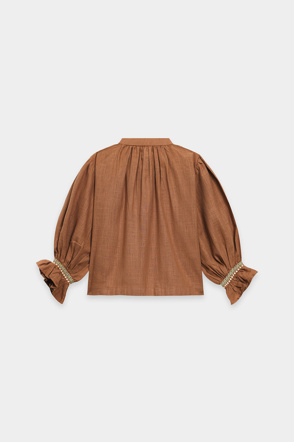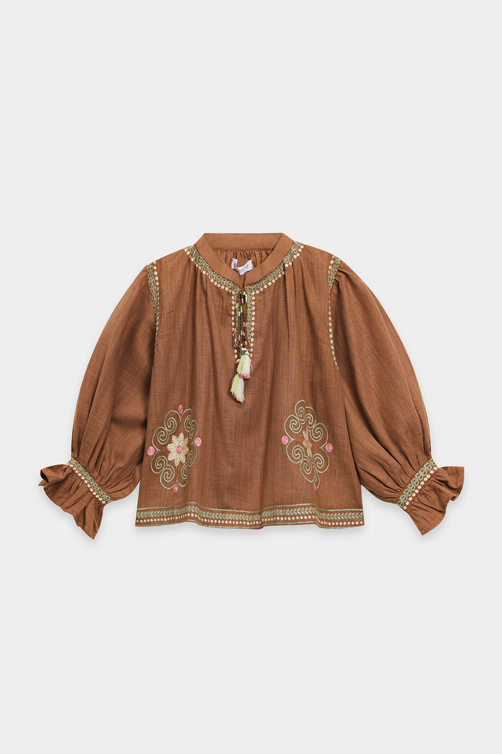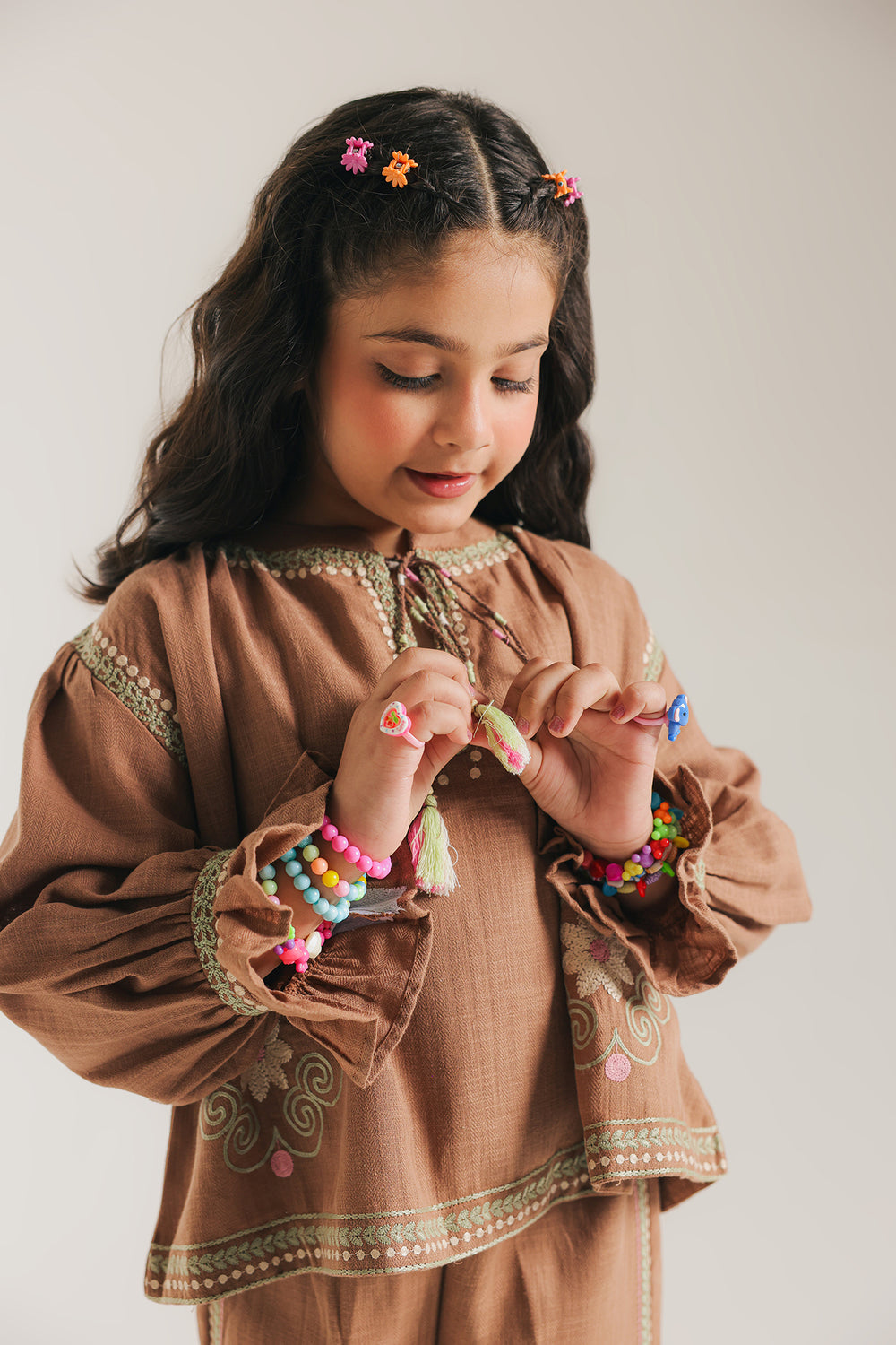 Capture the essence of cozy, artisanal style with this beautiful brown embroidered co-ord set. This stunning two-piece ensemble, featuring a peasant-style top and straight fit trouser, made from a rich, textured fabric in a warm caramel-brown hue. The top has a ban neckline with tassel ties and features intricate floral embroidery across the chest in shades of pink, blue, and green, framed by a delicate border stitch. The coordinating trouser maintain a chic straight fit silhouette and boast stunning matching floral embroidery framing the hem and outer seam, perfect for pairing with flats or sandals. This set effortlessly blends traditional threadwork with a relaxed, modern fit.