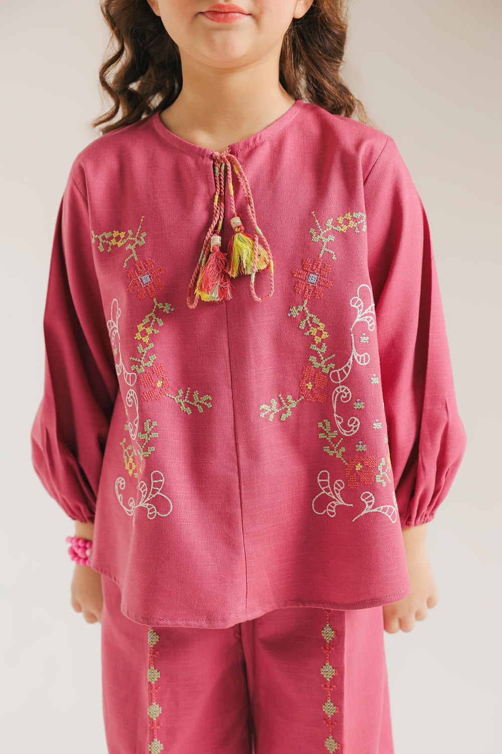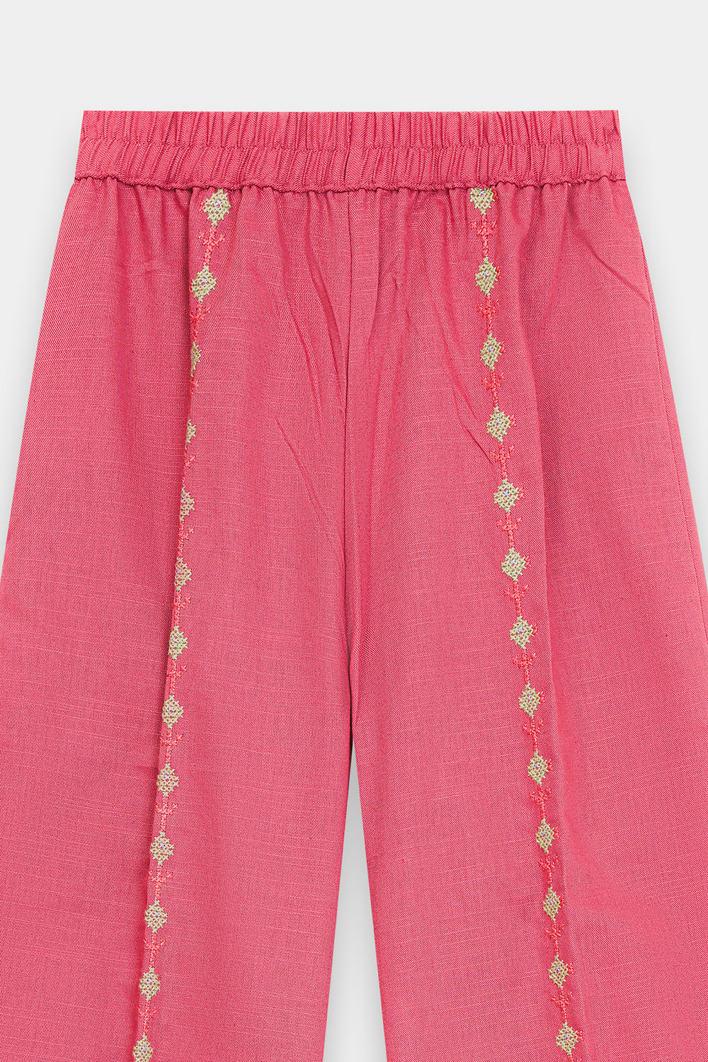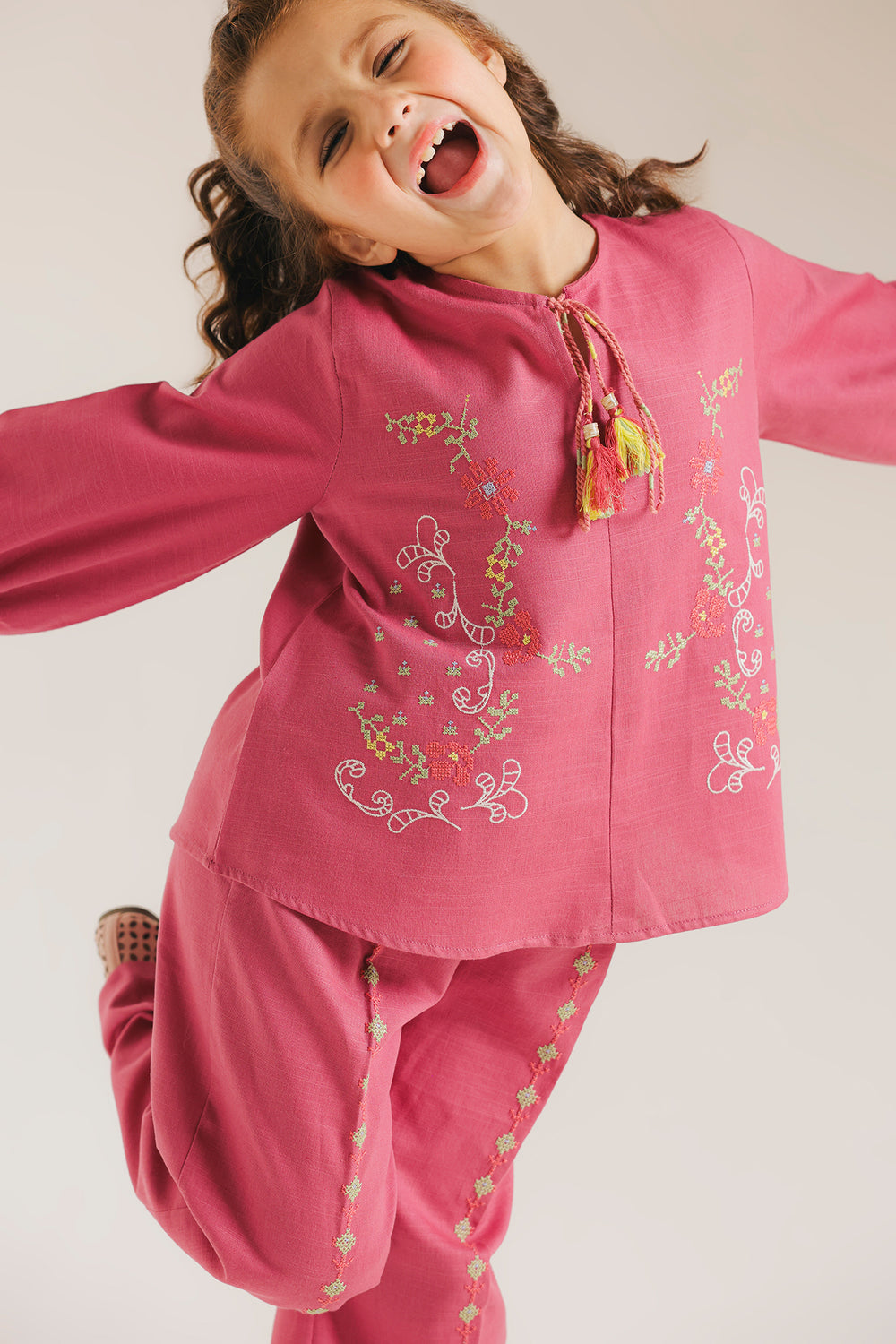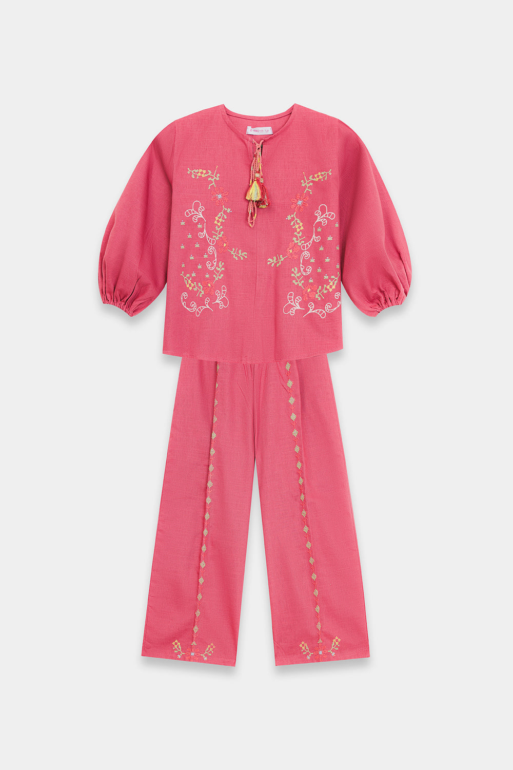 Kids Co-Ord Set in Bright Pink Make a bold statement with this vibrant bright pink co-ord set designed for kids. The matching top and bottom feature beautiful embroidery details that add elegance and charm. The round neckline includes a practical slit with attached strings for easy adjusting and a secure fit. Perfect for special occasions, celebrations, or when your child wants to look extra put-together. This coordinated set takes the guesswork out of styling while keeping comfort and quality at the forefront.