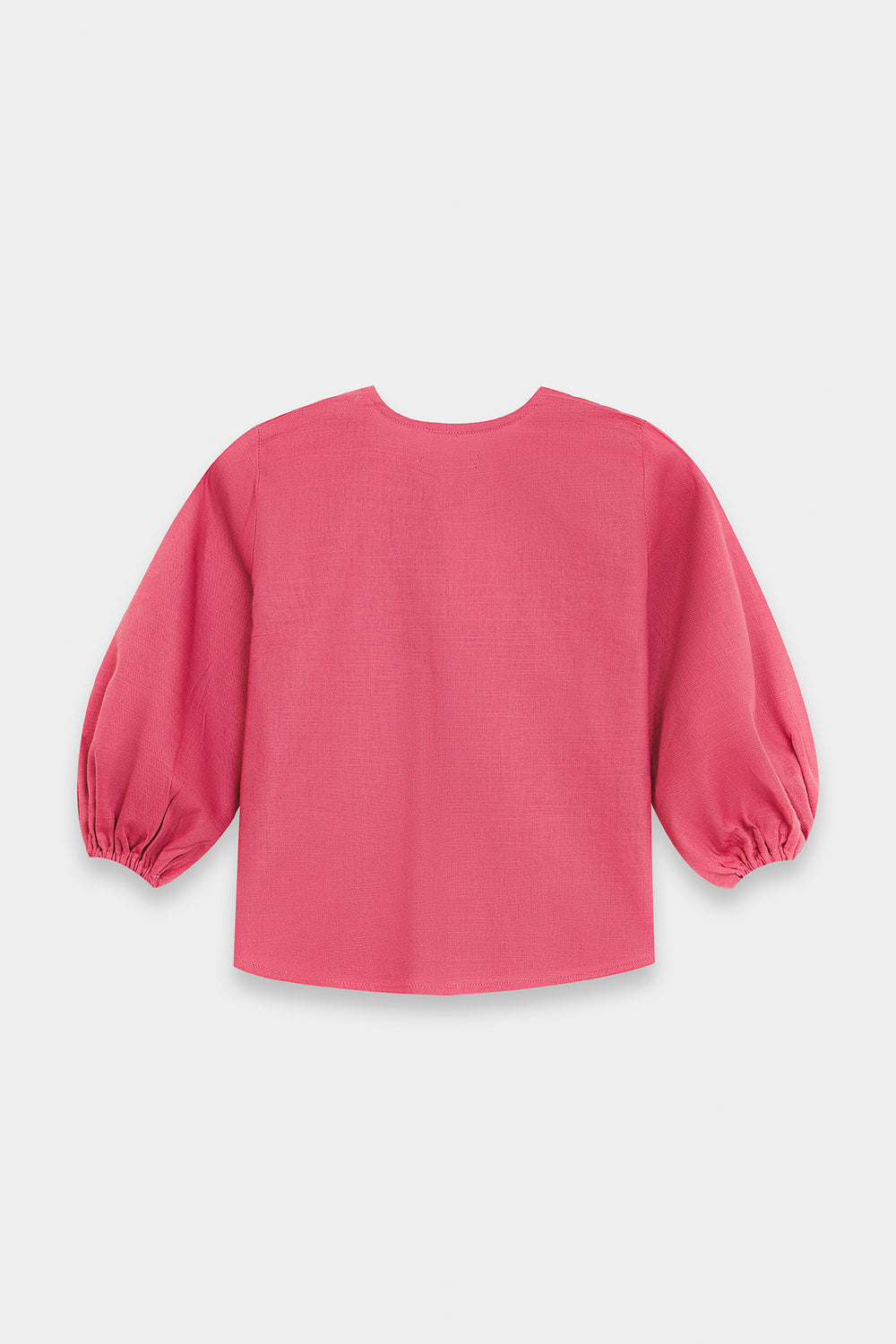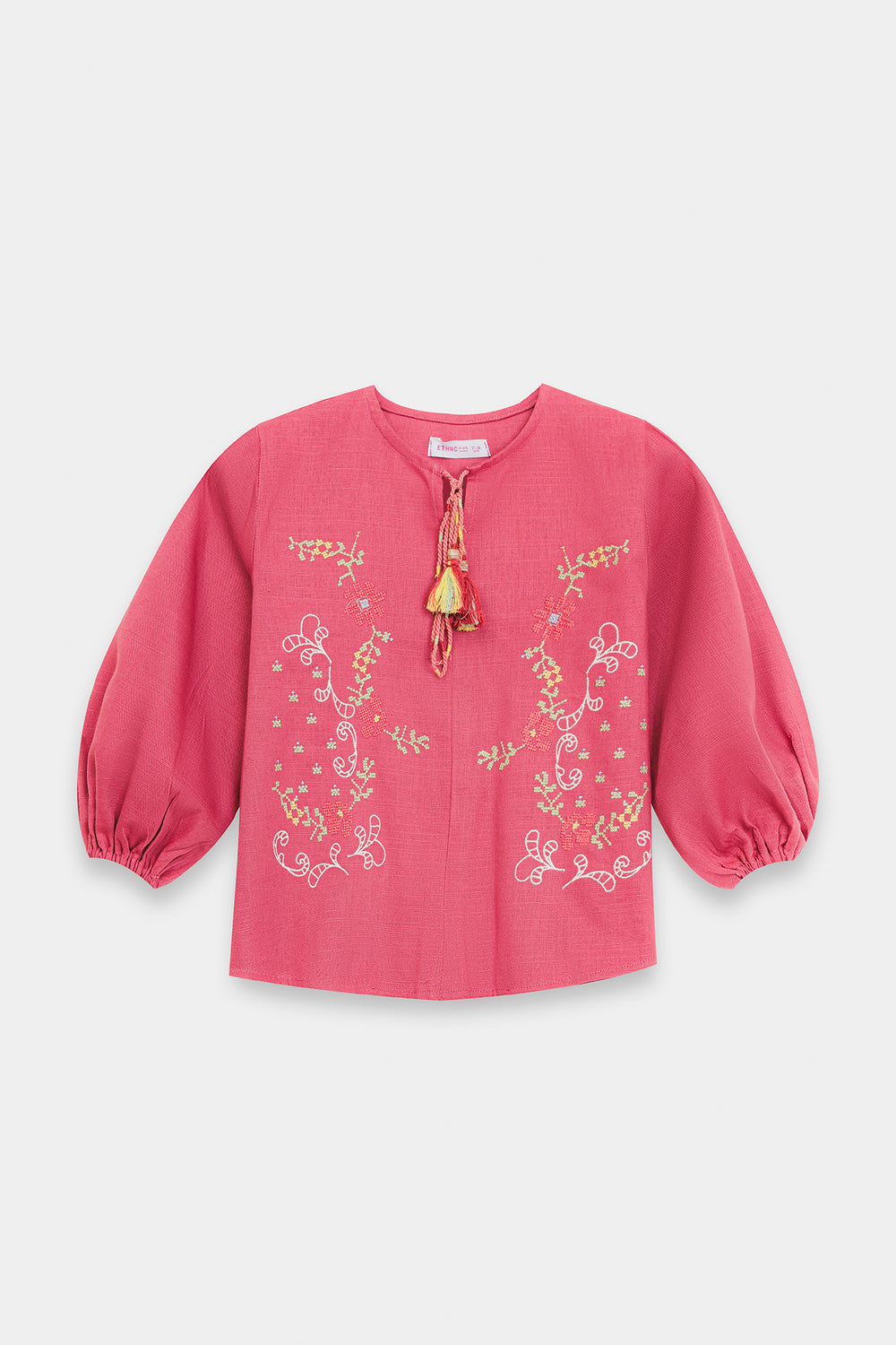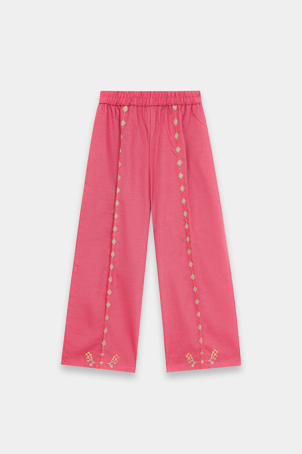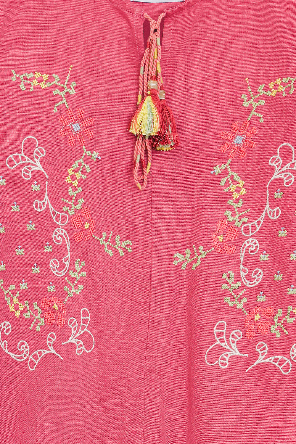 Kids Co-Ord Set in Bright Pink Make a bold statement with this vibrant bright pink co-ord set designed for kids. The matching top and bottom feature beautiful embroidery details that add elegance and charm. The round neckline includes a practical slit with attached strings for easy adjusting and a secure fit. Perfect for special occasions, celebrations, or when your child wants to look extra put-together. This coordinated set takes the guesswork out of styling while keeping comfort and quality at the forefront.