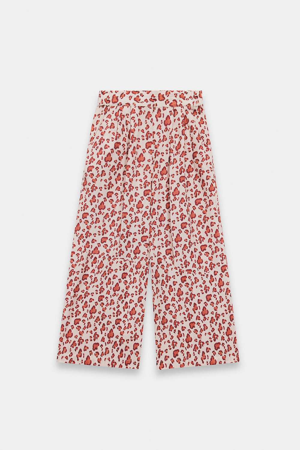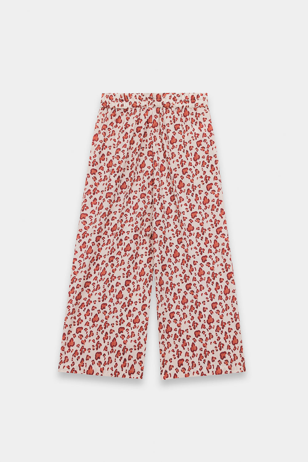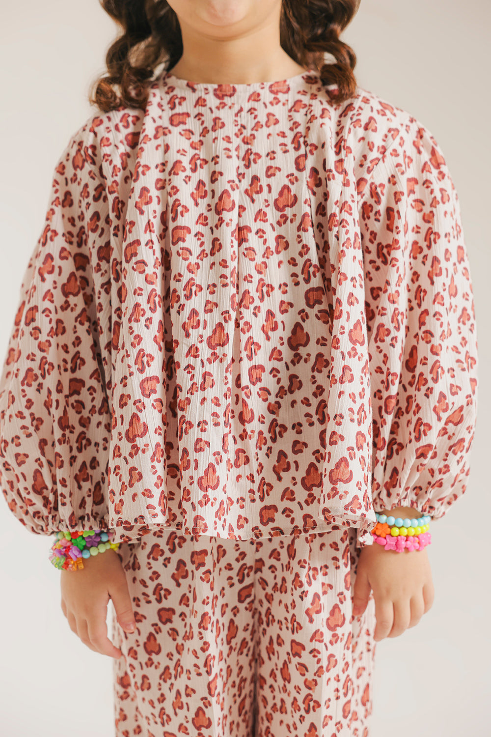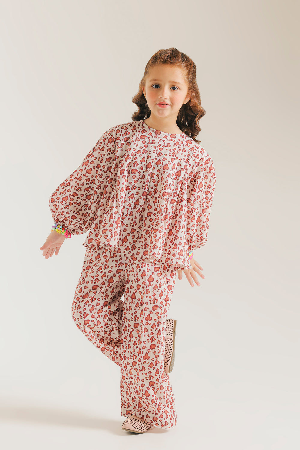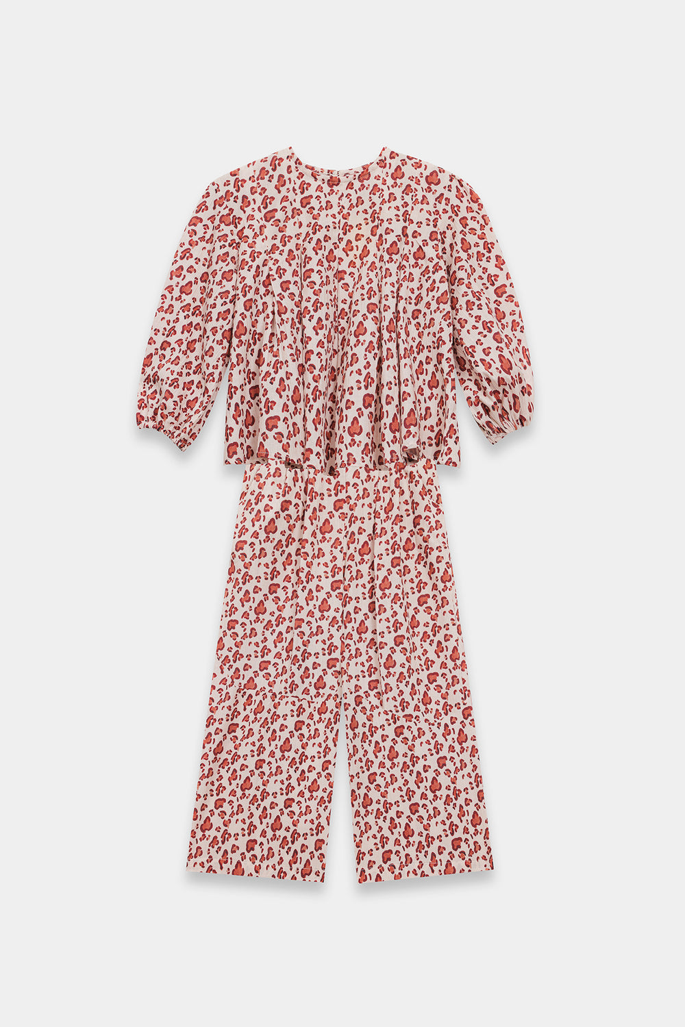 A charming two-piece outfit featuring a soft, flowy silhouette. The top has long, loose sleeves and a relaxed, airy fit, paired with a matching full-length, wide-leg pair of trousers. The fabric is printed with an all-over floral pattern in shades of red and pink on a light background, giving it a cute, playful, and summery feel.