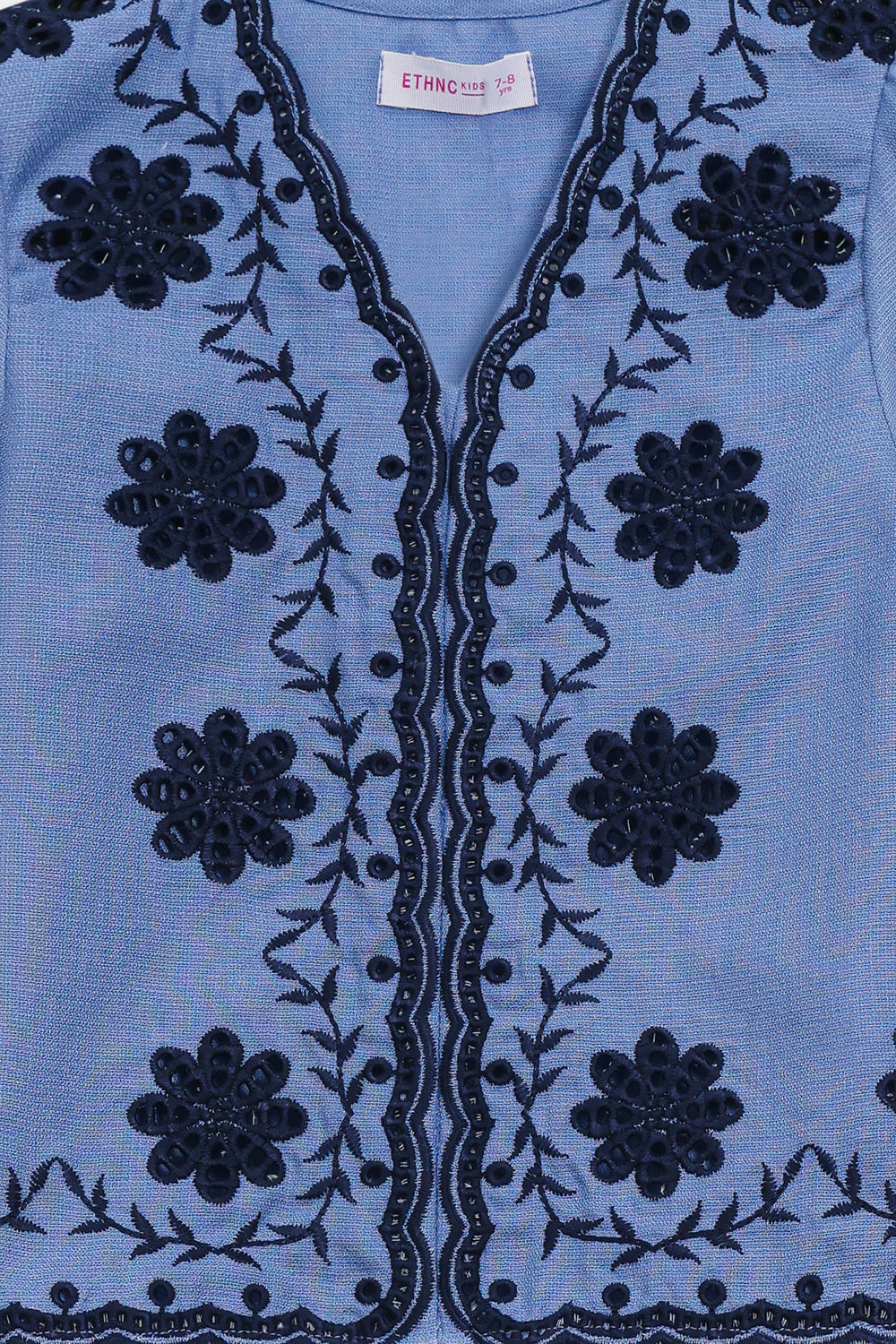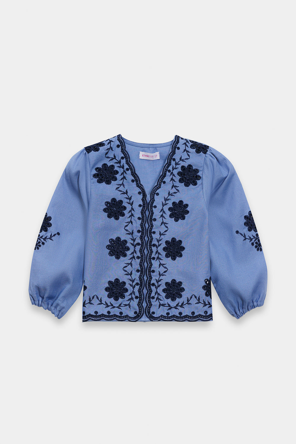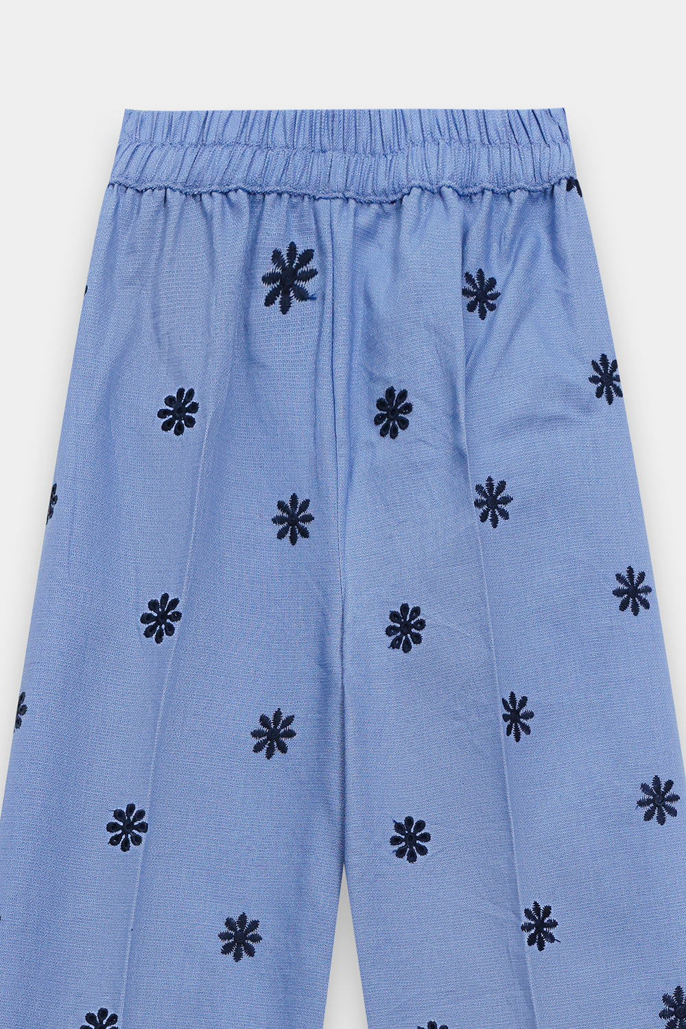 Elevate your ethnic wardrobe with this sophisticated co-ord set featuring a light periwinkle tunic paired with matching wide-leg trousers. The top showcases intricate dark blue floral embroidery concentrated at the V-neckline and center front, with delicate motifs extending across three-quarter length, gathered sleeves. The complementary palazzo pants feature dispersed embroidered details and an elasticated waistband for comfort. Perfect for casual gatherings, festive celebrations.