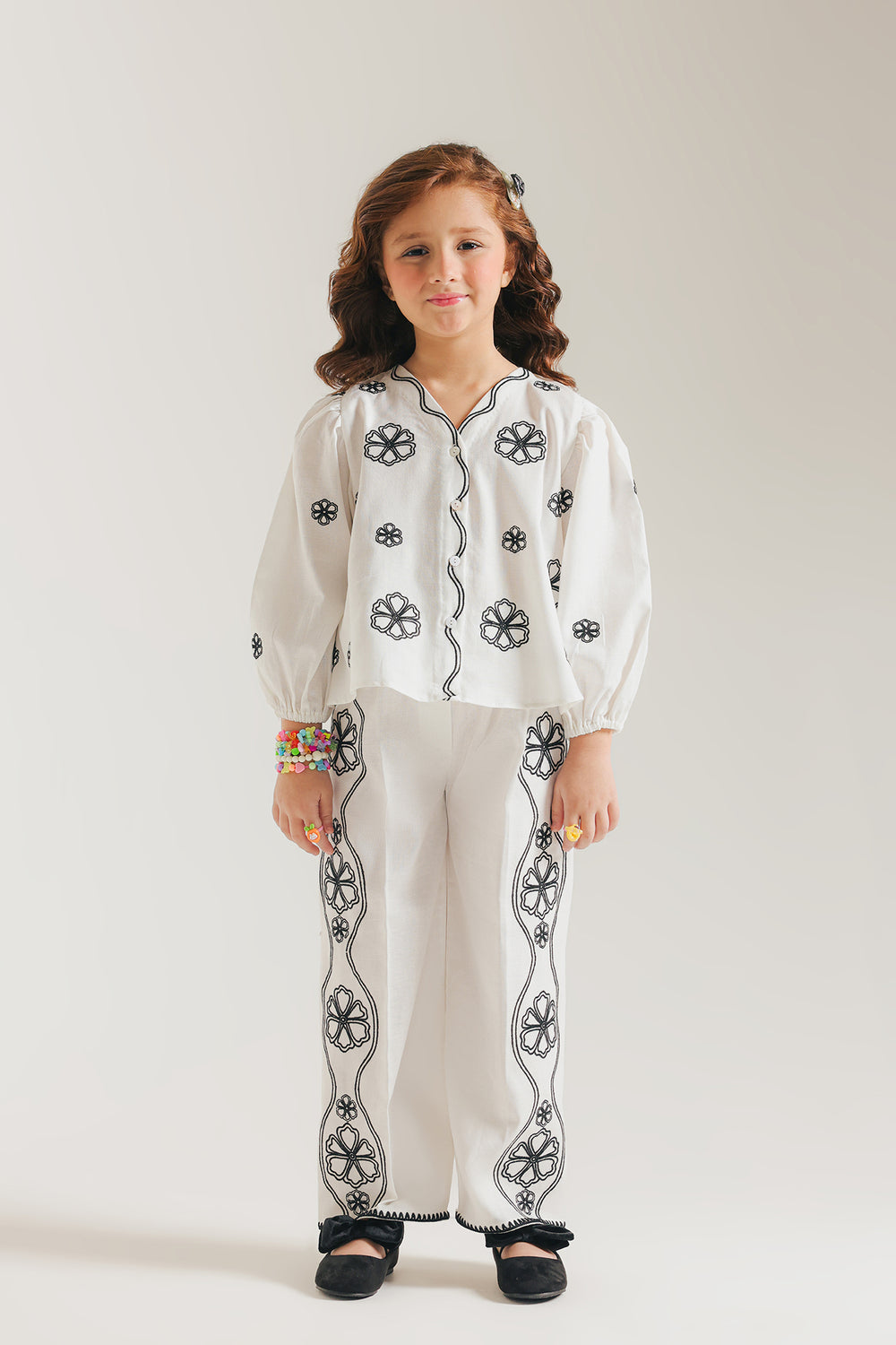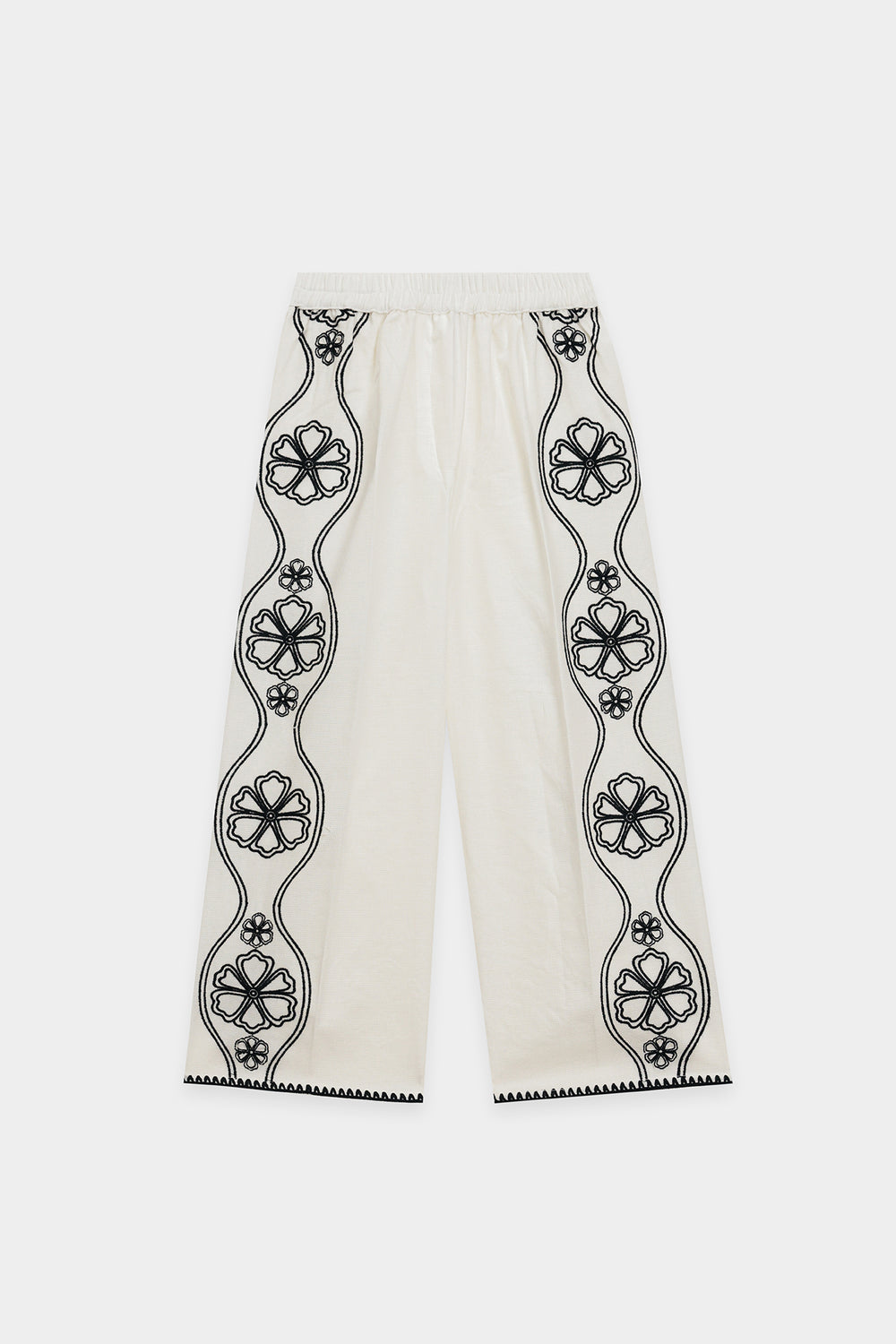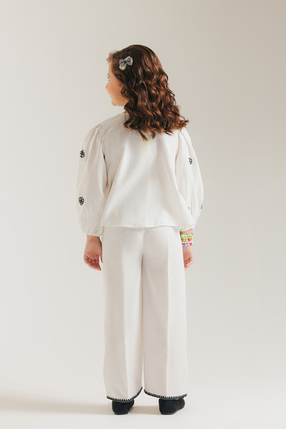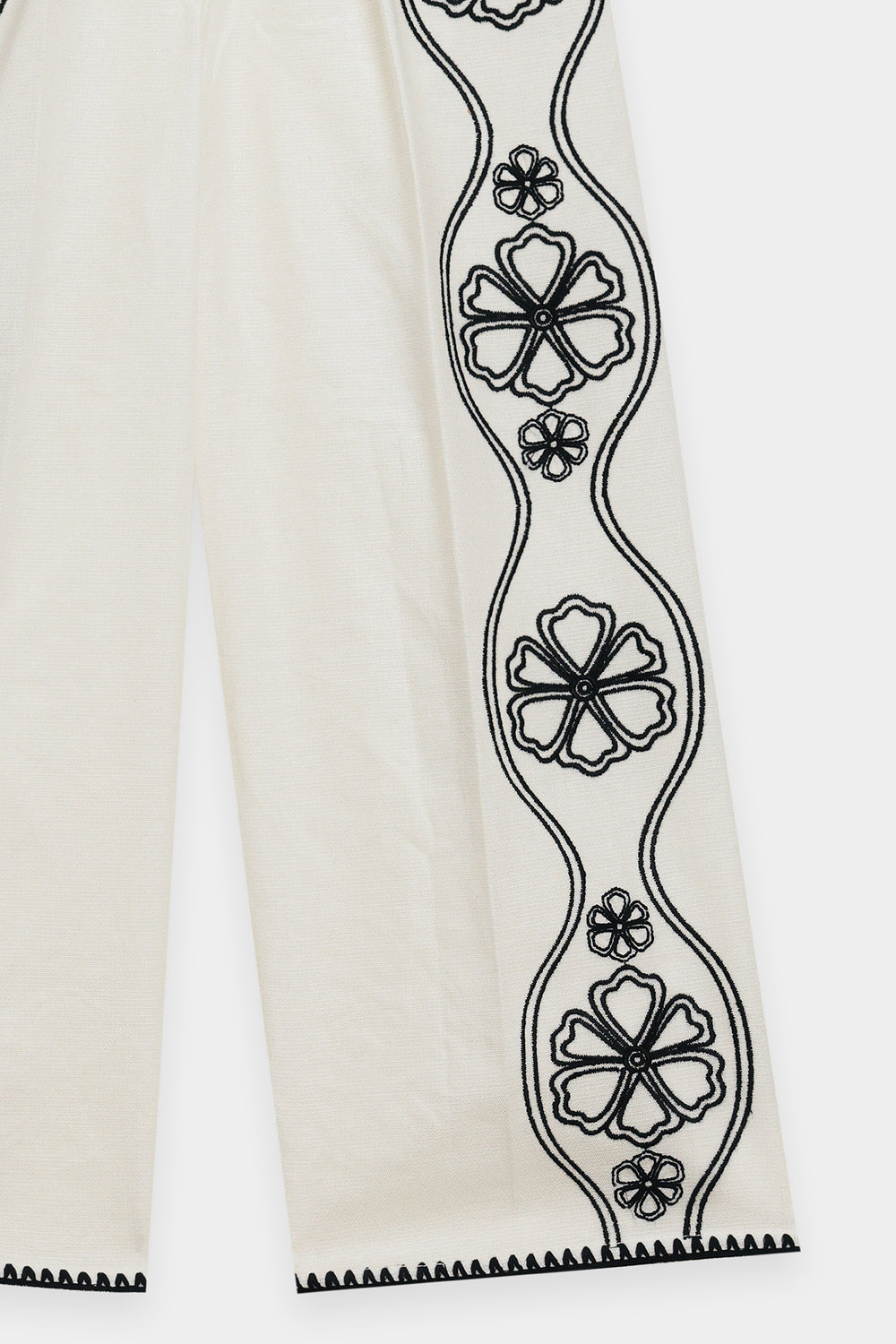 Achieve a chic and high-contrast look with this sophisticated white and black embroidered co-ord set. This striking two-piece features a short top and matching wide-leg trouser, both crafted from a clean white fabric. The top has a flattering V-neckline with scalloped black trim and is adorned with bold, contrasting black floral embroidery scattered across the body and puff sleeves. The coordinating trouser is cut in a contemporary wide-leg silhouette and feature large-scale black embroidered floral wave motifs running vertically down the sides. This ensemble beautifully balances modern shape with traditional artisan detail for an effortlessly refined look.