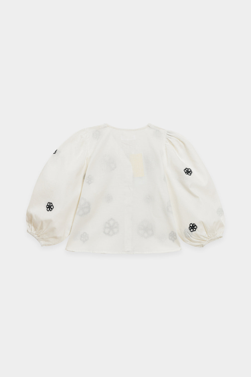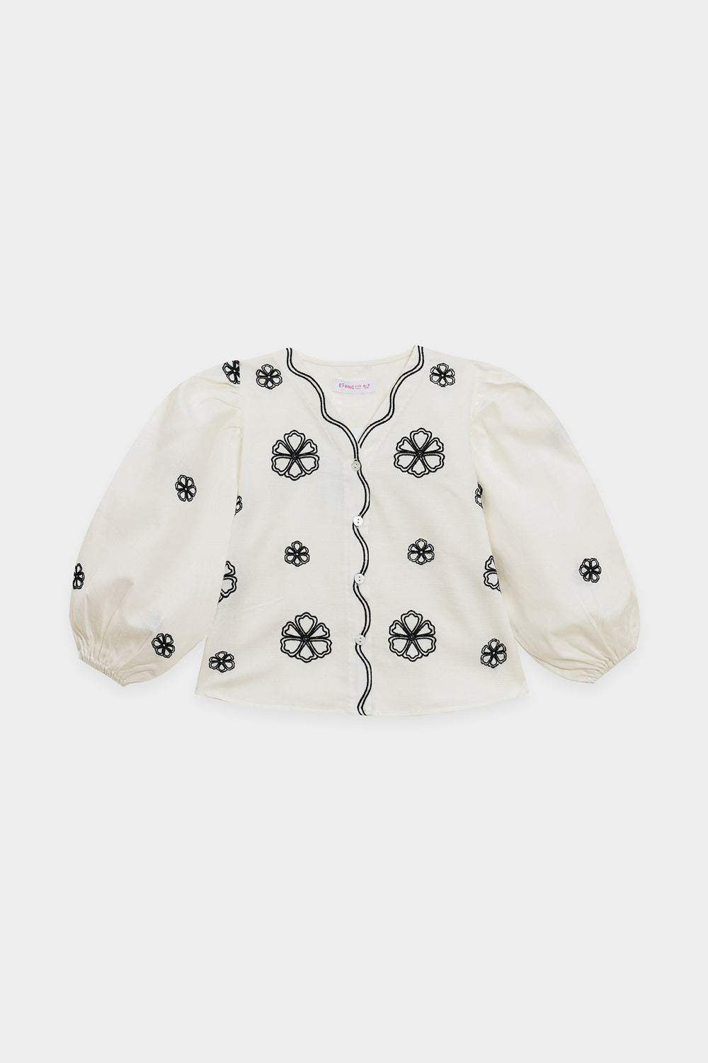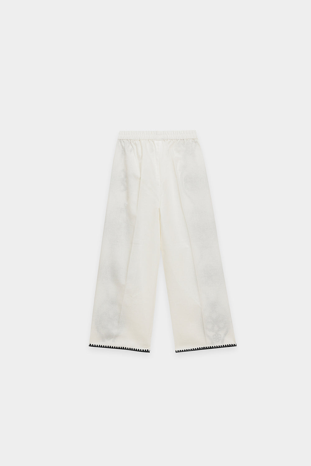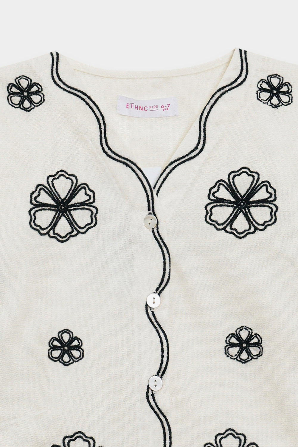 Achieve a chic and high-contrast look with this sophisticated white and black embroidered co-ord set. This striking two-piece features a short top and matching wide-leg trouser, both crafted from a clean white fabric. The top has a flattering V-neckline with scalloped black trim and is adorned with bold, contrasting black floral embroidery scattered across the body and puff sleeves. The coordinating trouser is cut in a contemporary wide-leg silhouette and feature large-scale black embroidered floral wave motifs running vertically down the sides. This ensemble beautifully balances modern shape with traditional artisan detail for an effortlessly refined look.