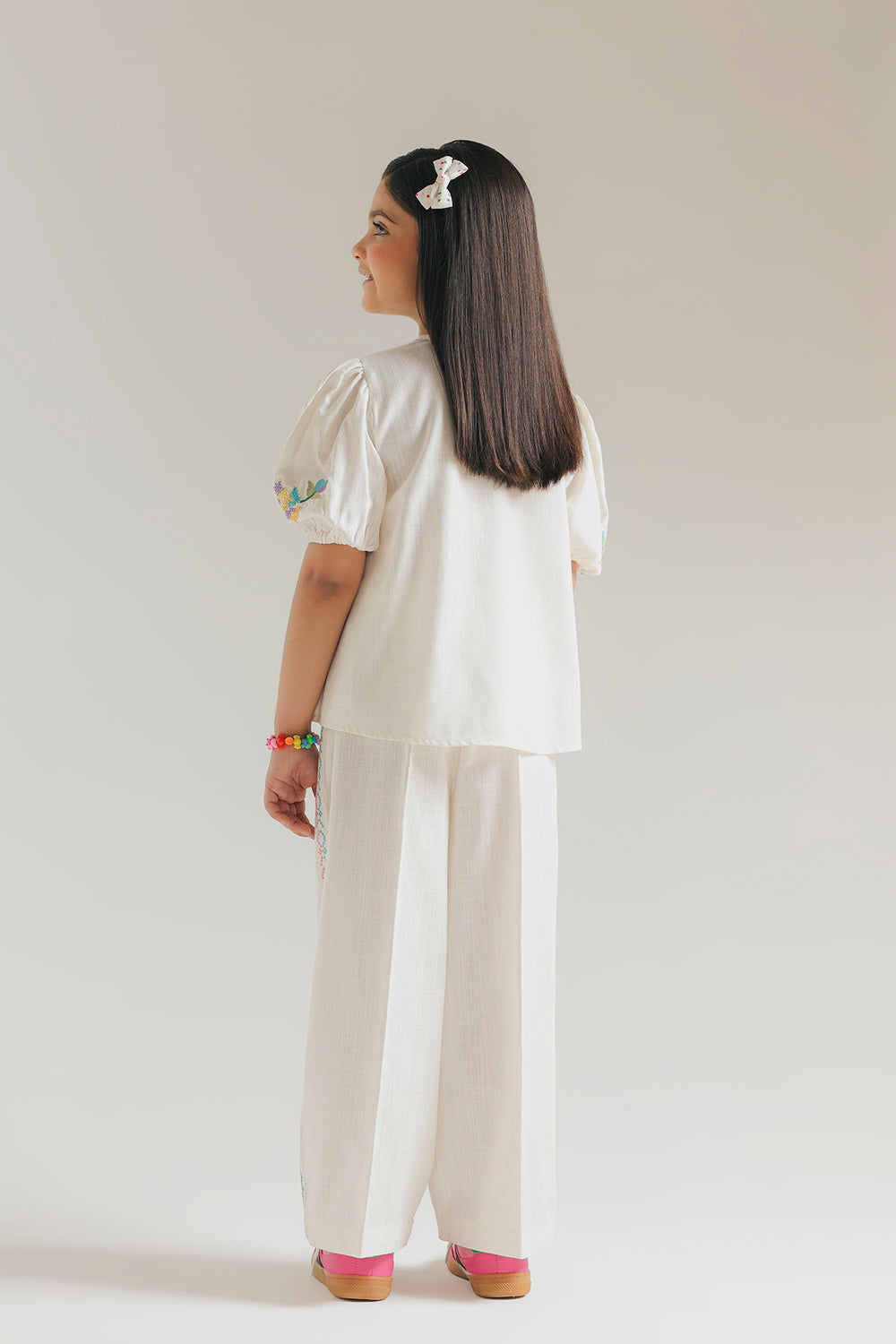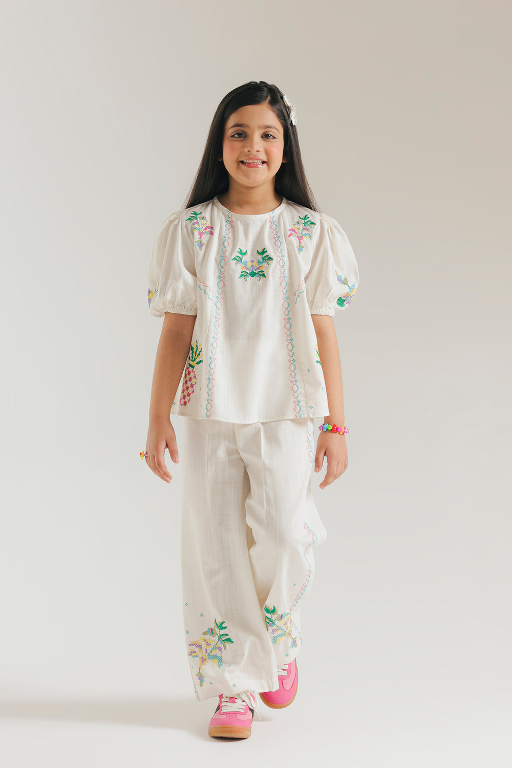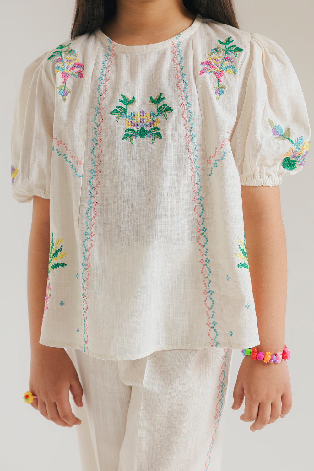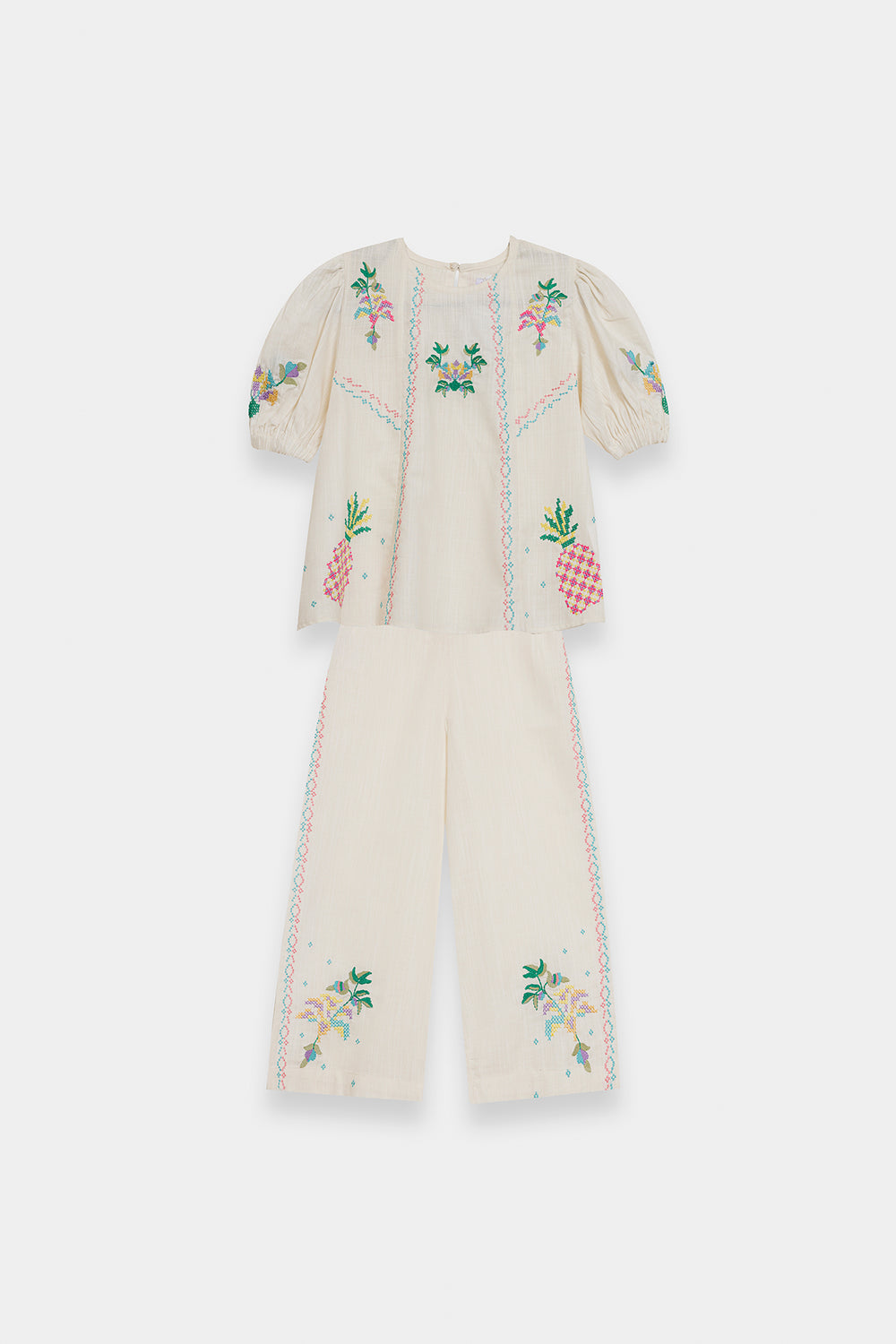This charming ivory co-ord set for girls exudes whimsical elegance with its vibrant, artisanal embroidery featuring playful pineapple and floral motifs. The breezy top, with its sweet puff sleeves, pairs perfectly with matching wide-leg trousers. Crafted for comfort and style, it’s a radiant choice for any festive occasion.