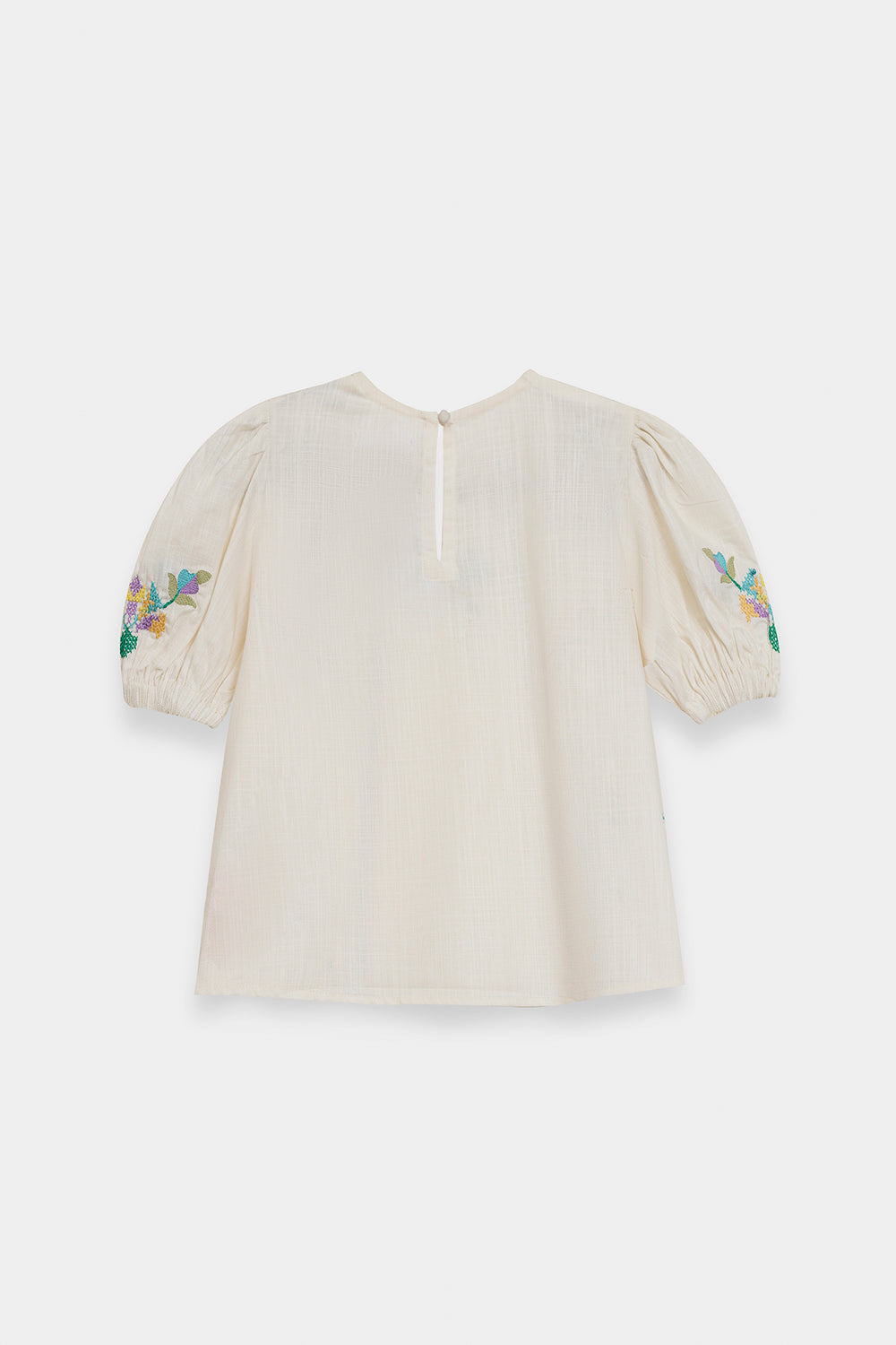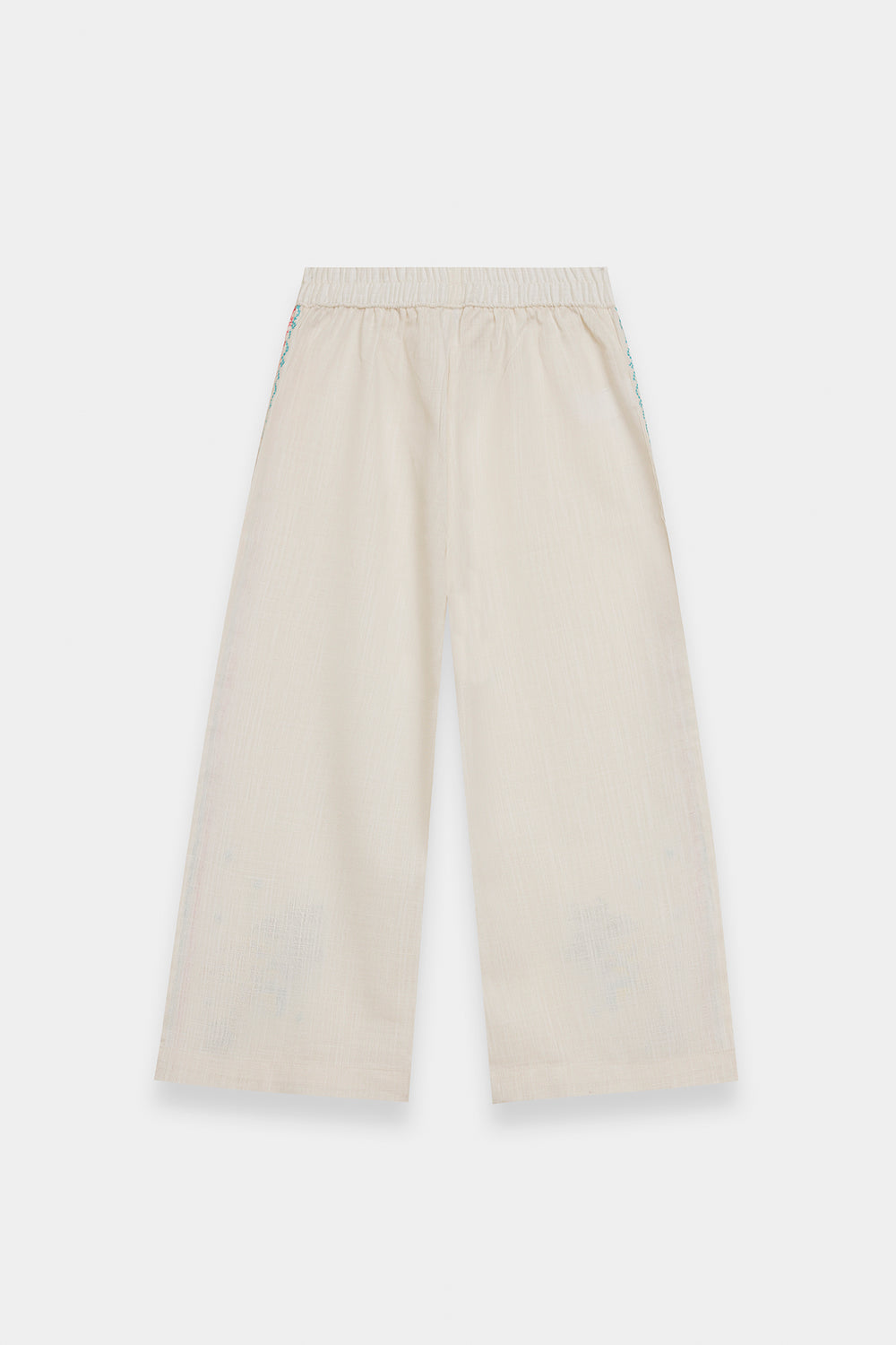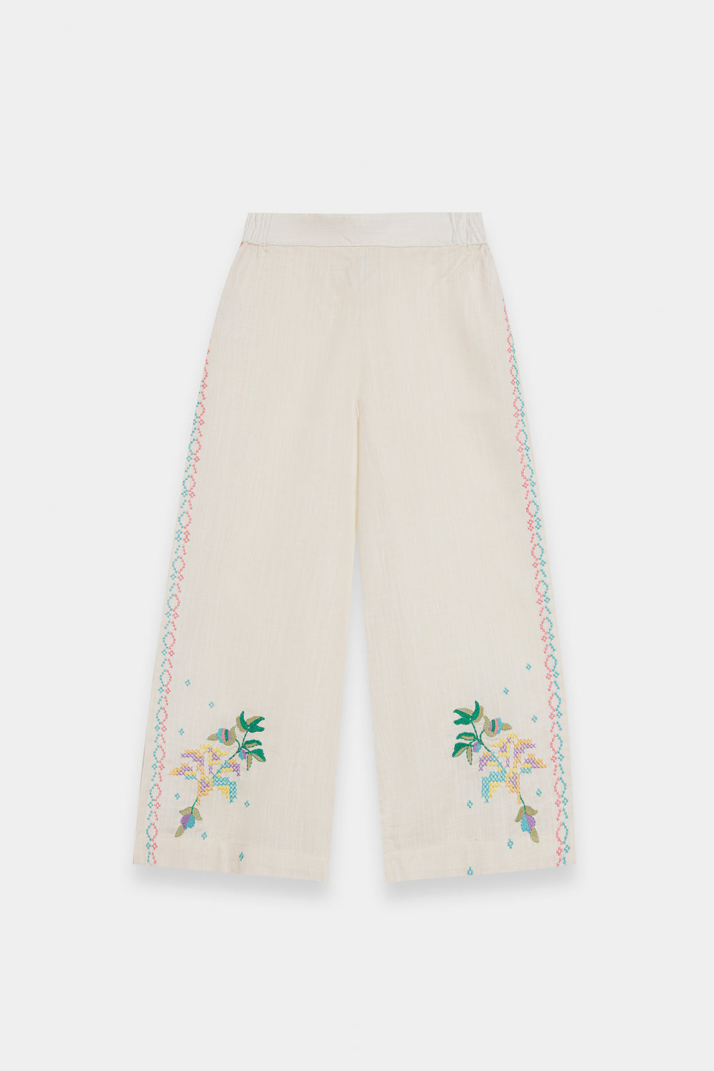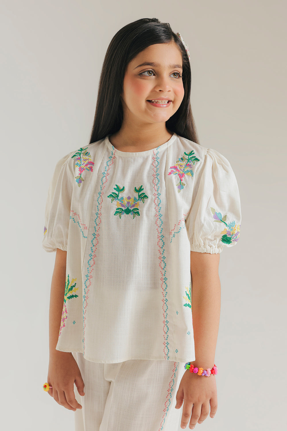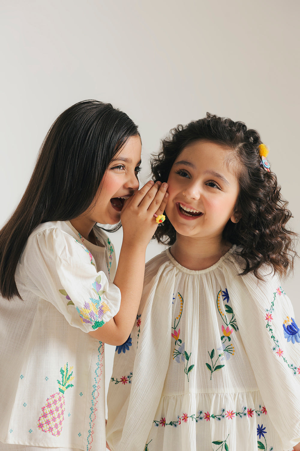 This charming ivory co-ord set for girls exudes whimsical elegance with its vibrant, artisanal embroidery featuring playful pineapple and floral motifs. The breezy top, with its sweet puff sleeves, pairs perfectly with matching wide-leg trousers. Crafted for comfort and style, it’s a radiant choice for any festive occasion.