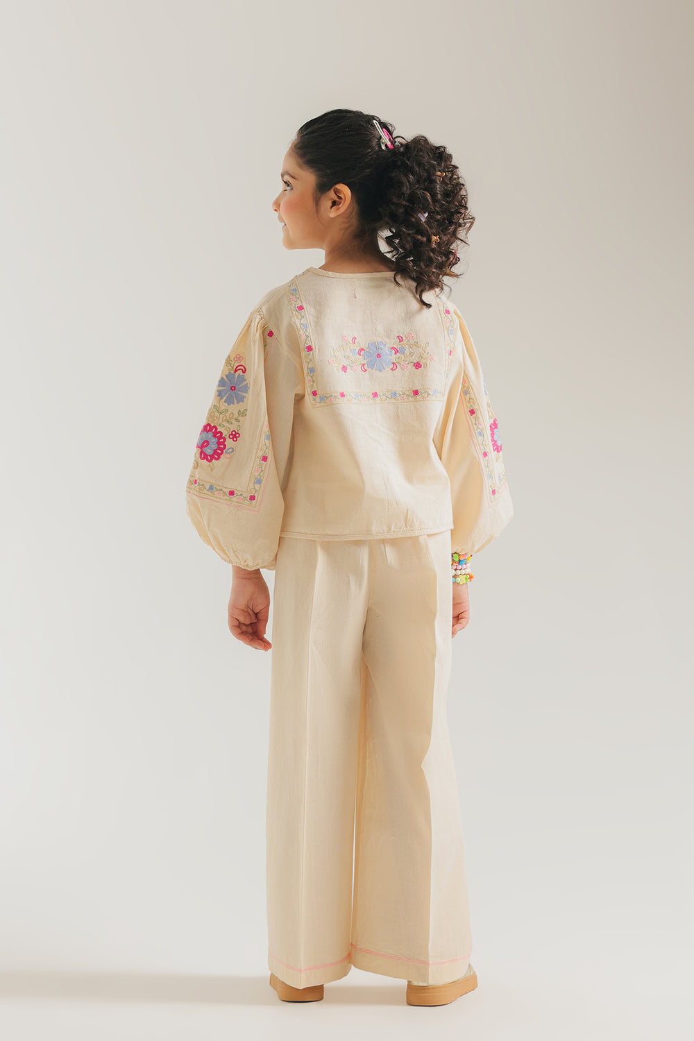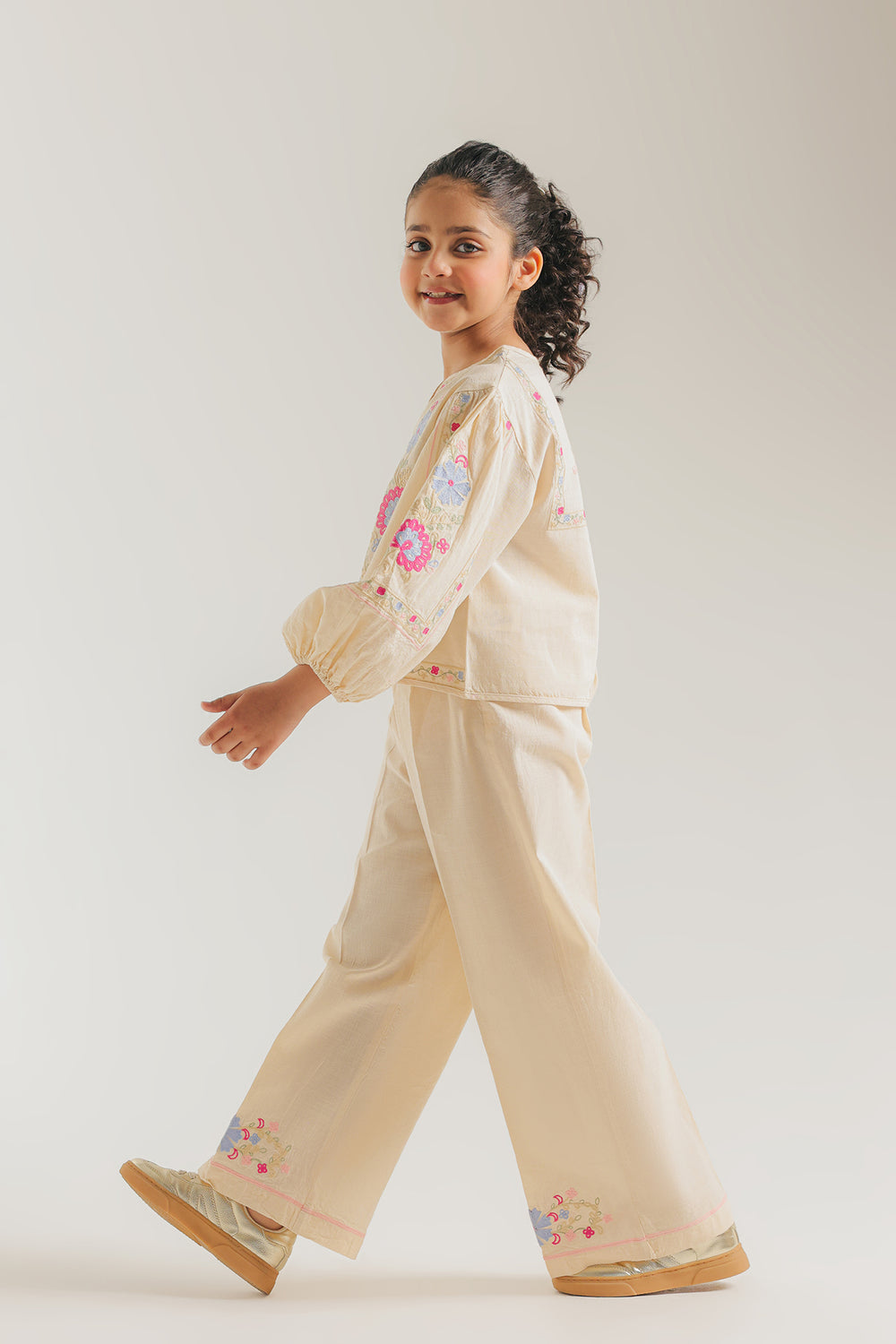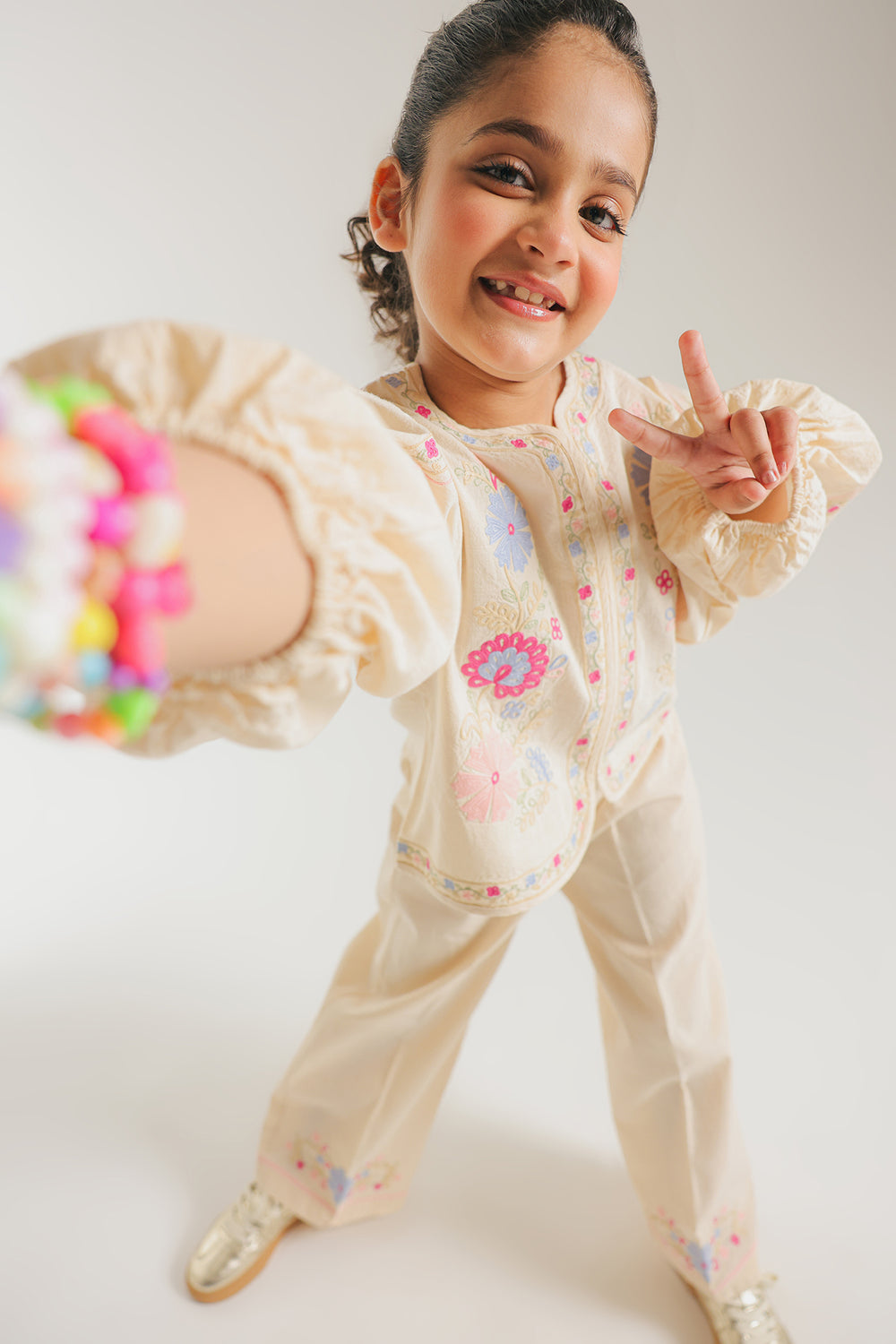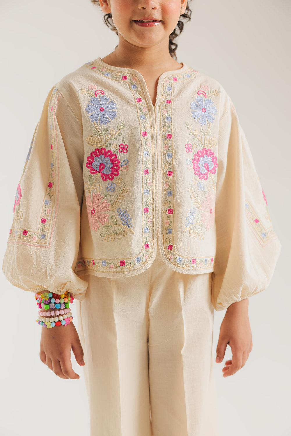 Celebrate her vibrant spirit with this enchanting Ivory Two-Piece Co-ord Set, designed for both style and play. The cream-toned top features dramatic, voluminous balloon sleeves and a clean split neckline, serving as a beautiful canvas for bold, multi-colored floral embroidery. Vivid blooms in shades of magenta, sky blue, and marigold are artfully placed across the bodice and sleeves, adding a joyful pop of color. The ensemble is completed with matching trouser, which feature a coordinating floral border at the hem for a polished, high-fashion finish.