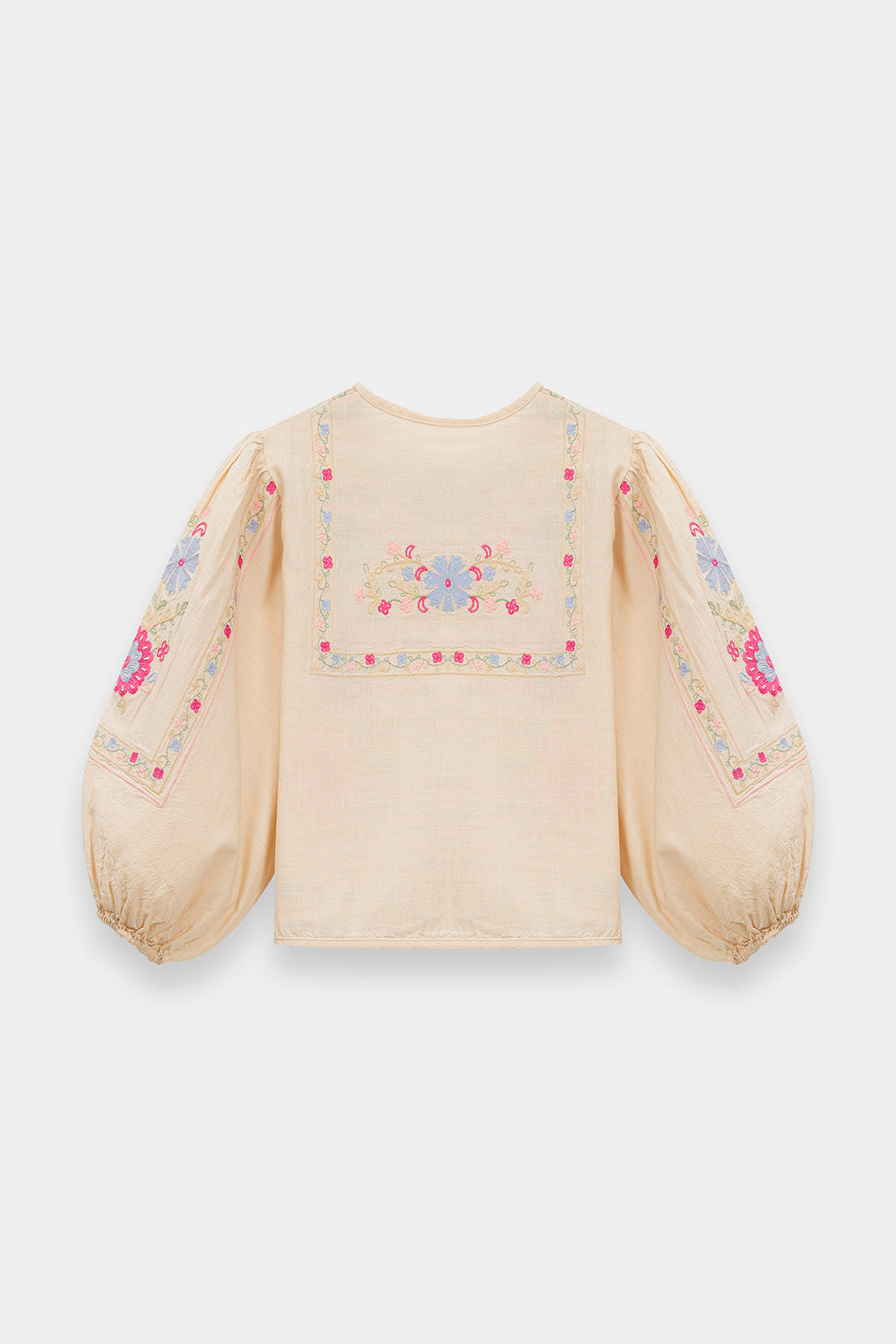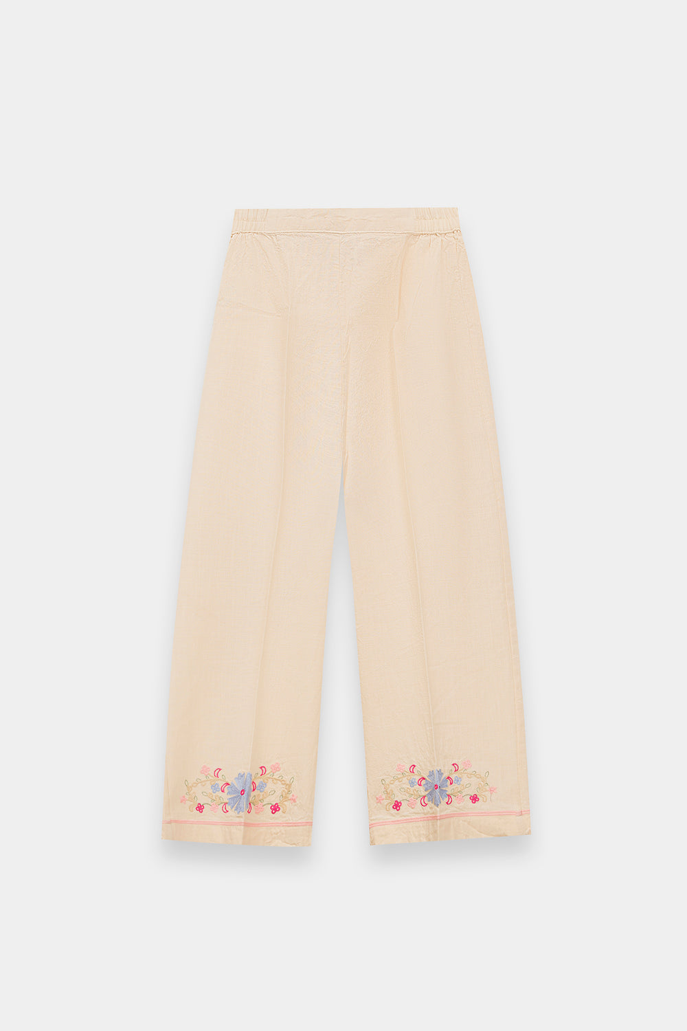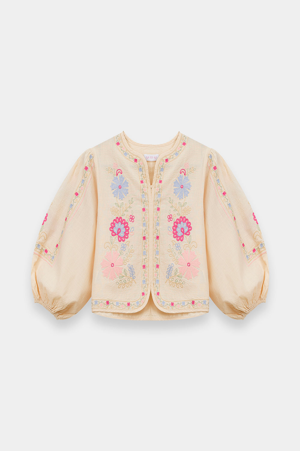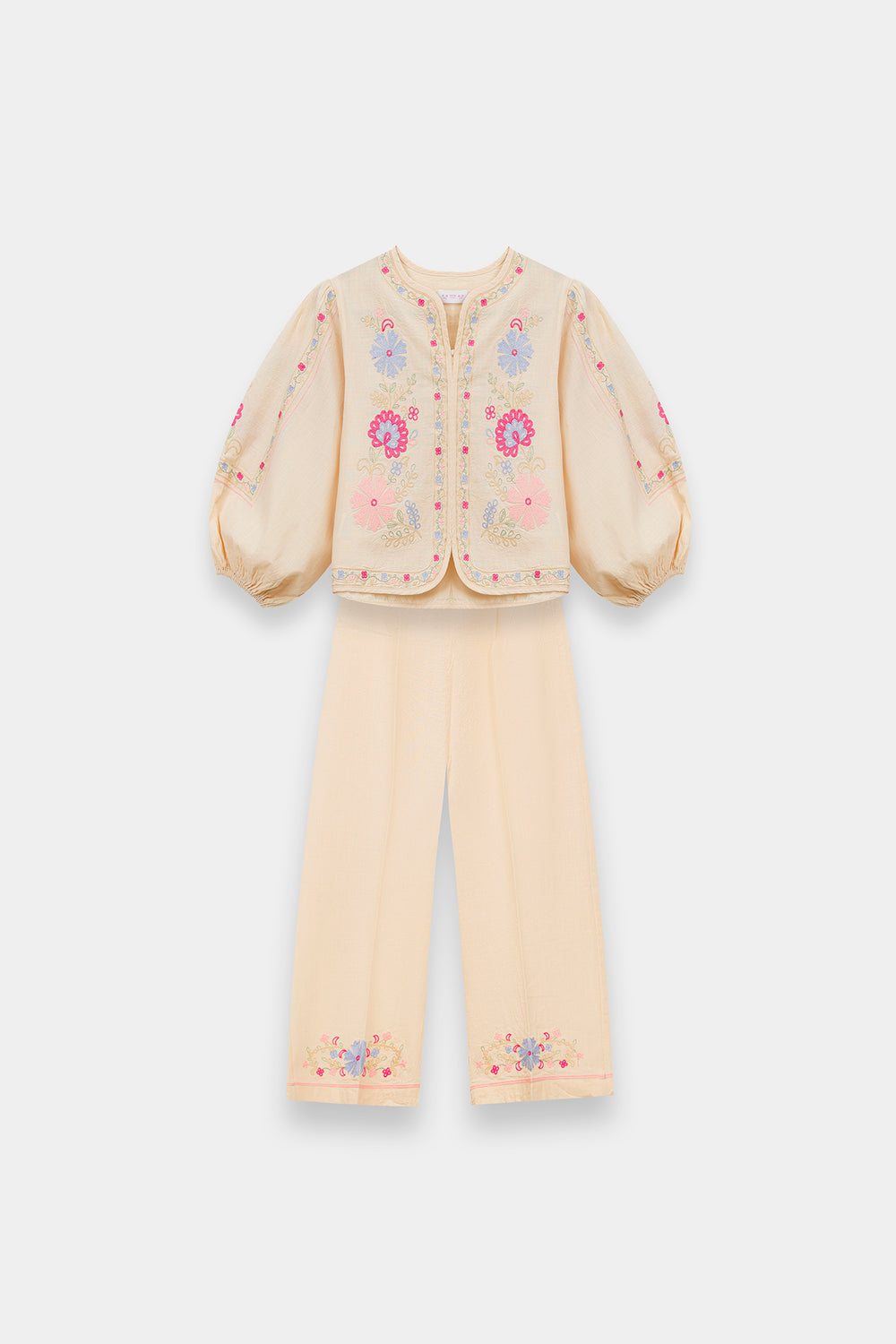 Celebrate her vibrant spirit with this enchanting Ivory Two-Piece Co-ord Set, designed for both style and play. The cream-toned top features dramatic, voluminous balloon sleeves and a clean split neckline, serving as a beautiful canvas for bold, multi-colored floral embroidery. Vivid blooms in shades of magenta, sky blue, and marigold are artfully placed across the bodice and sleeves, adding a joyful pop of color. The ensemble is completed with matching trouser, which feature a coordinating floral border at the hem for a polished, high-fashion finish.