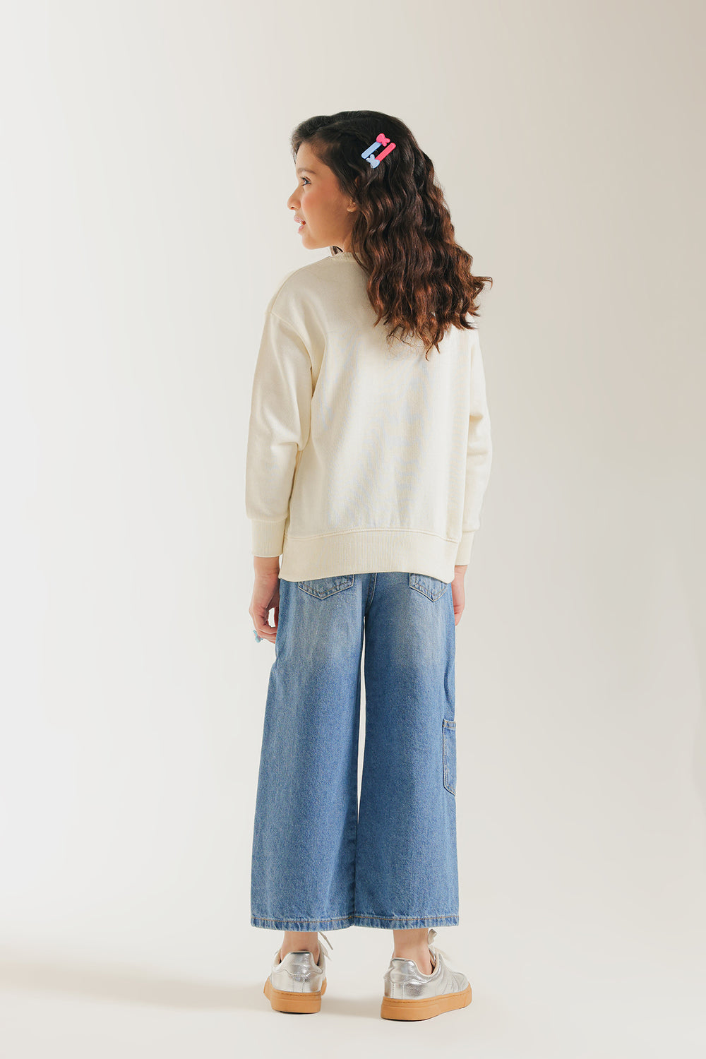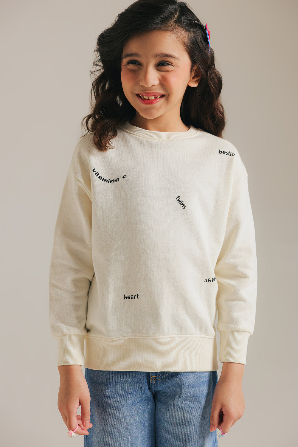 Celebrate cozy, casual comfort with this charming cream sweat shirt. This classic, crew-neck sweat shirt is made from a soft, off-white fabric. It features playful, scattered black text details like "vitamin a," "hello," and "shine" across the chest. The simple, straight cut and ribbed cuffs make it perfect for layering and everyday adventures.