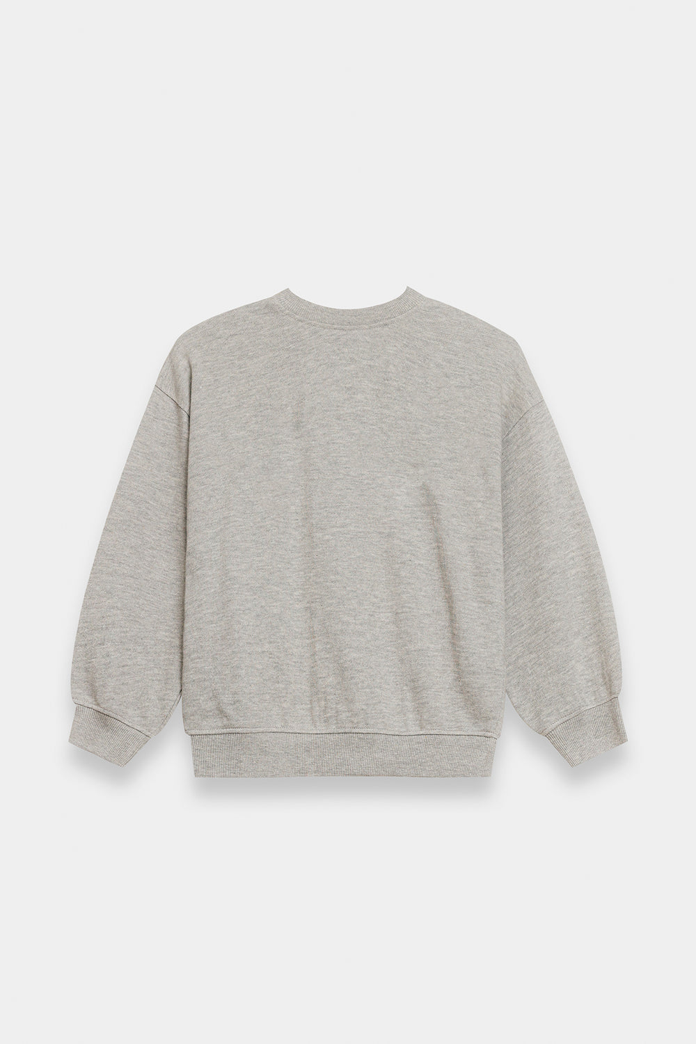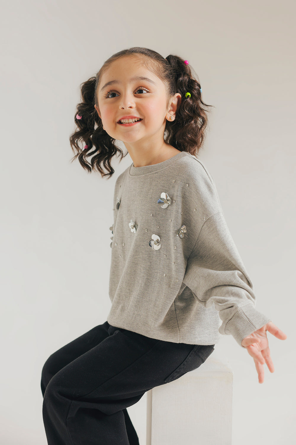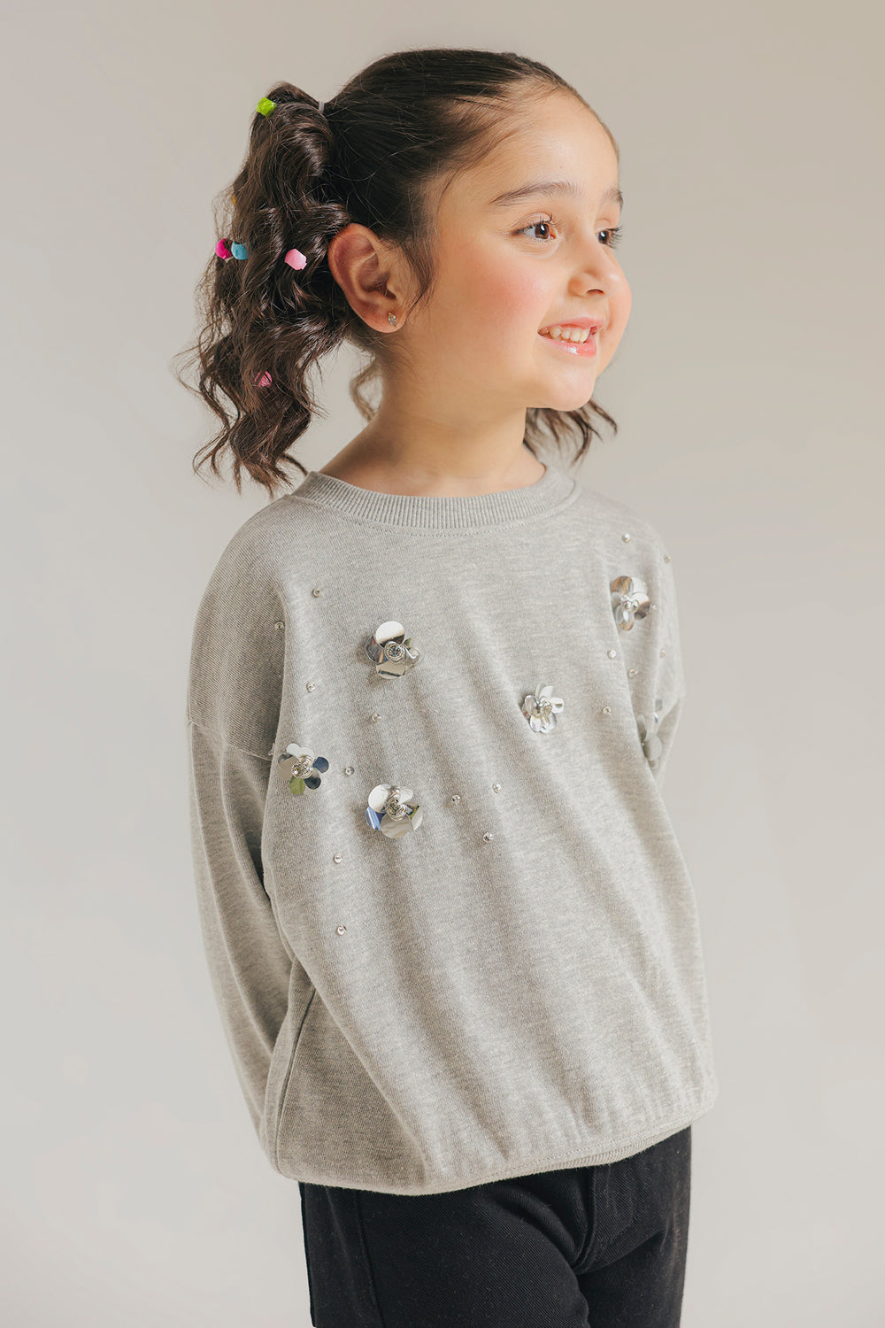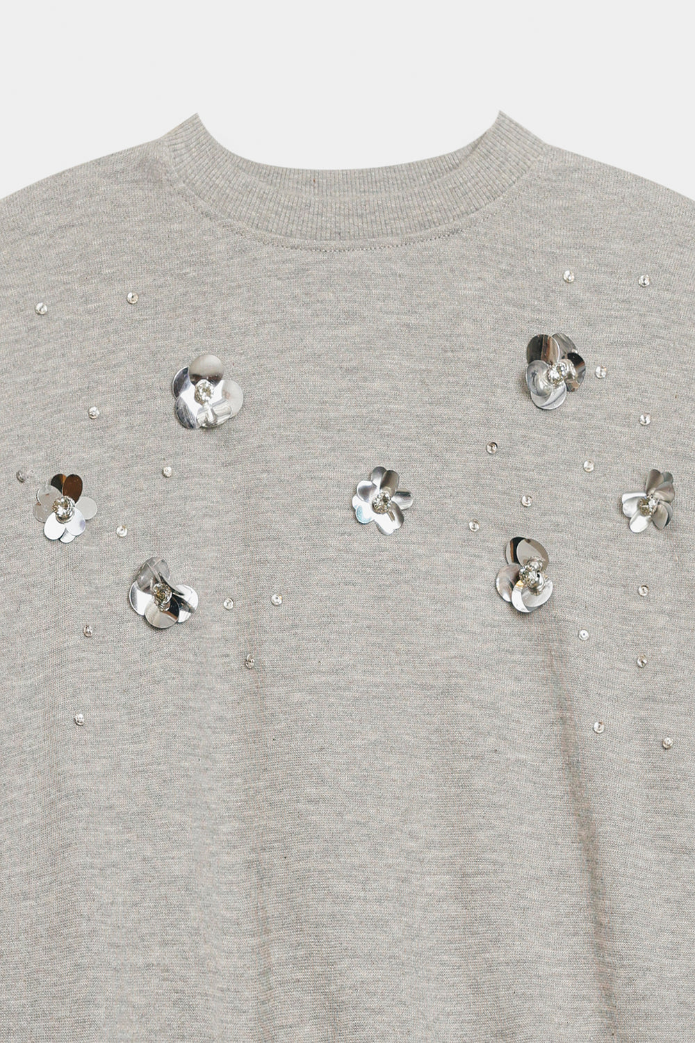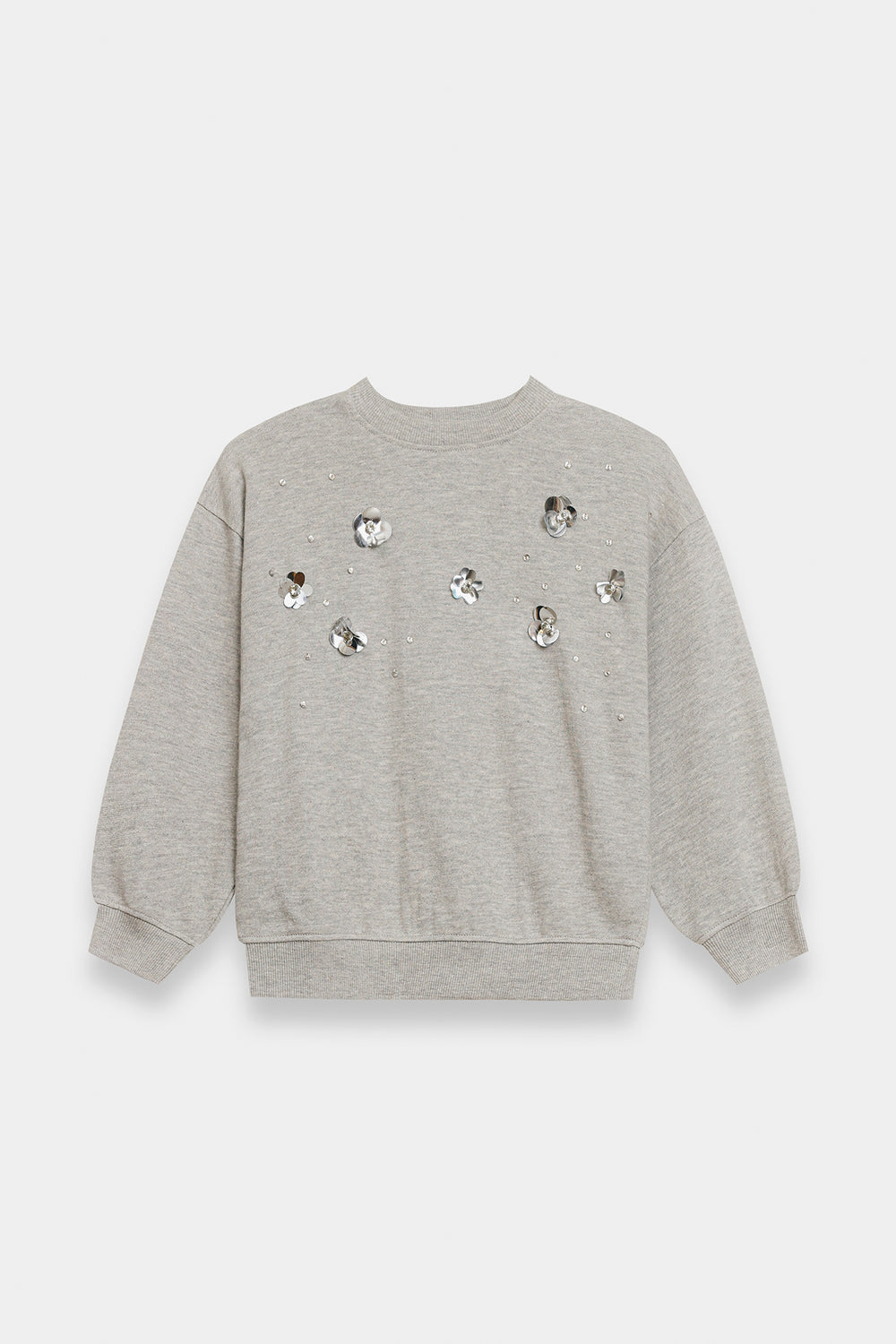 Add a sparkle of playful charm to her seasonal wardrobe with this heather grey embellished sweatshirt. Crafted for both comfort and style, this cozy top features a soft, textured knit in a versatile light grey shade. The classic crew neckline and relaxed fit are beautifully elevated by a scattering of shimmering 3D floral embellishments and delicate beadwork across the chest. Designed with dropped shoulders and ribbed cuffs for a contemporary, slouchy silhouette, this sweatshirt offers a cozy feel without compromising on elegance. It is the perfect statement piece for a casual day out, especially when paired with wide-leg black trousers for a polished, modern look.