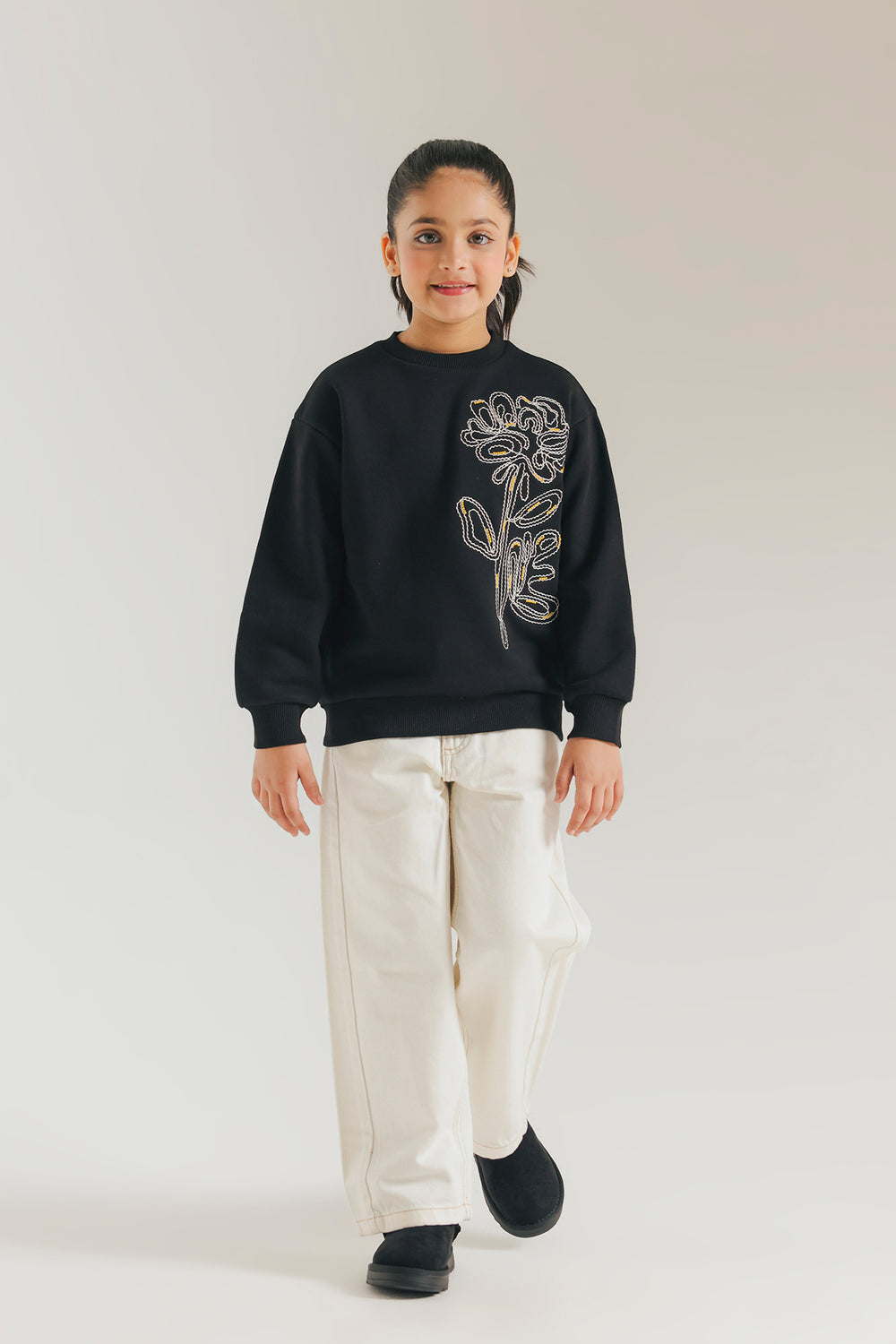 Embrace classic style with a modern twist in this sleek black sweatshirt. Crafted from a soft and comfortable knit, this piece serves as the perfect canvas for a striking artistic detail. The highlight of the design is a large, beautifully outlined floral motif on the front, featuring intricate white stitching accented with vibrant touches of yellow and gold. With its timeless crew neckline and cozy ribbed cuffs and hem, this sweatshirt offers a relax fit that is ideal for all-day wear and play. Designed with a relaxed silhouette, it pairs effortlessly with off-white wide-leg trousers for a sophisticated, high-contrast look.